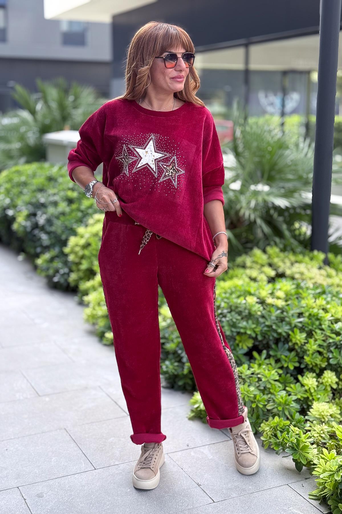 Leopar Şeritli Kadife Pantolon Bordo Renk