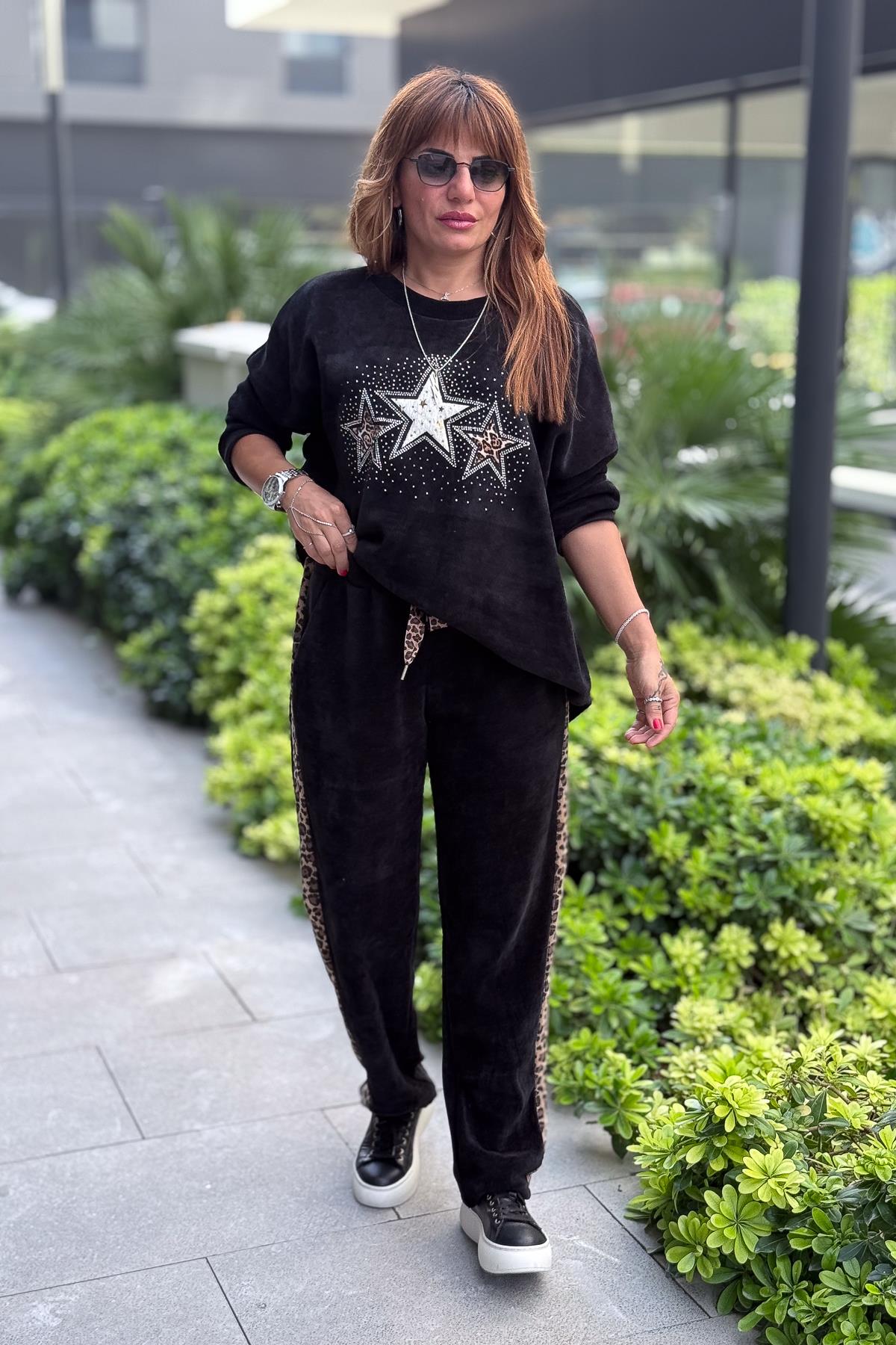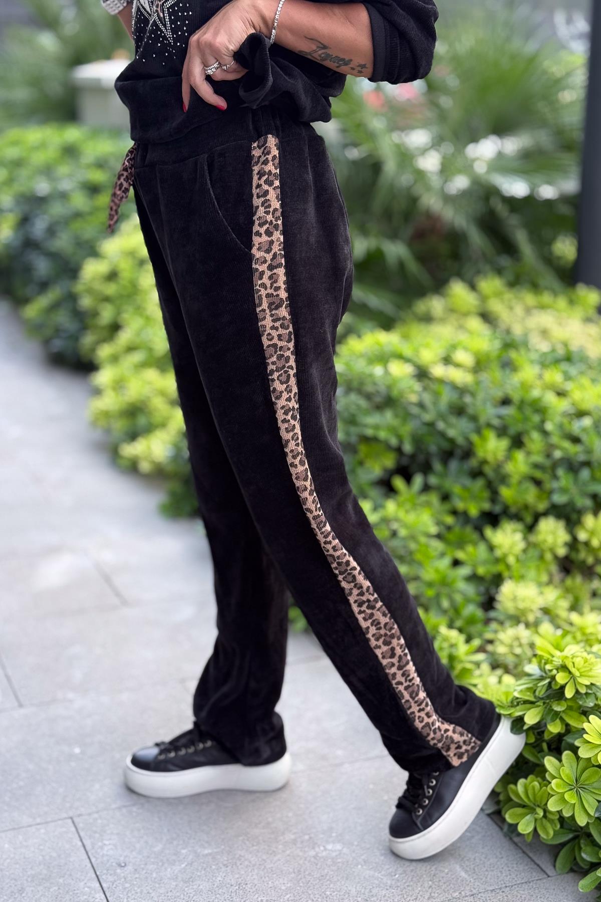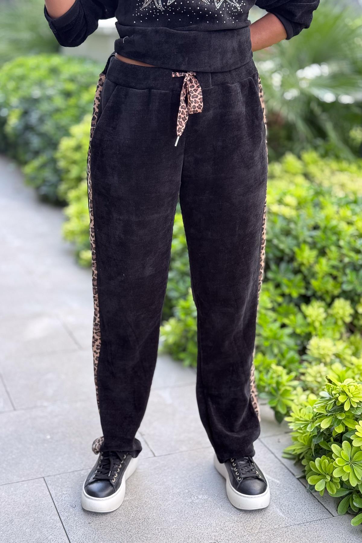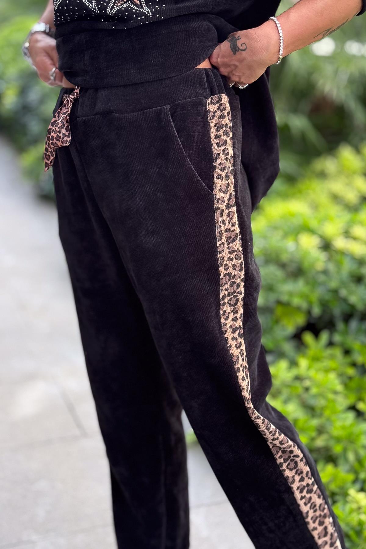 Leopar Şeritli Kadife Pantolon Siyah Renk