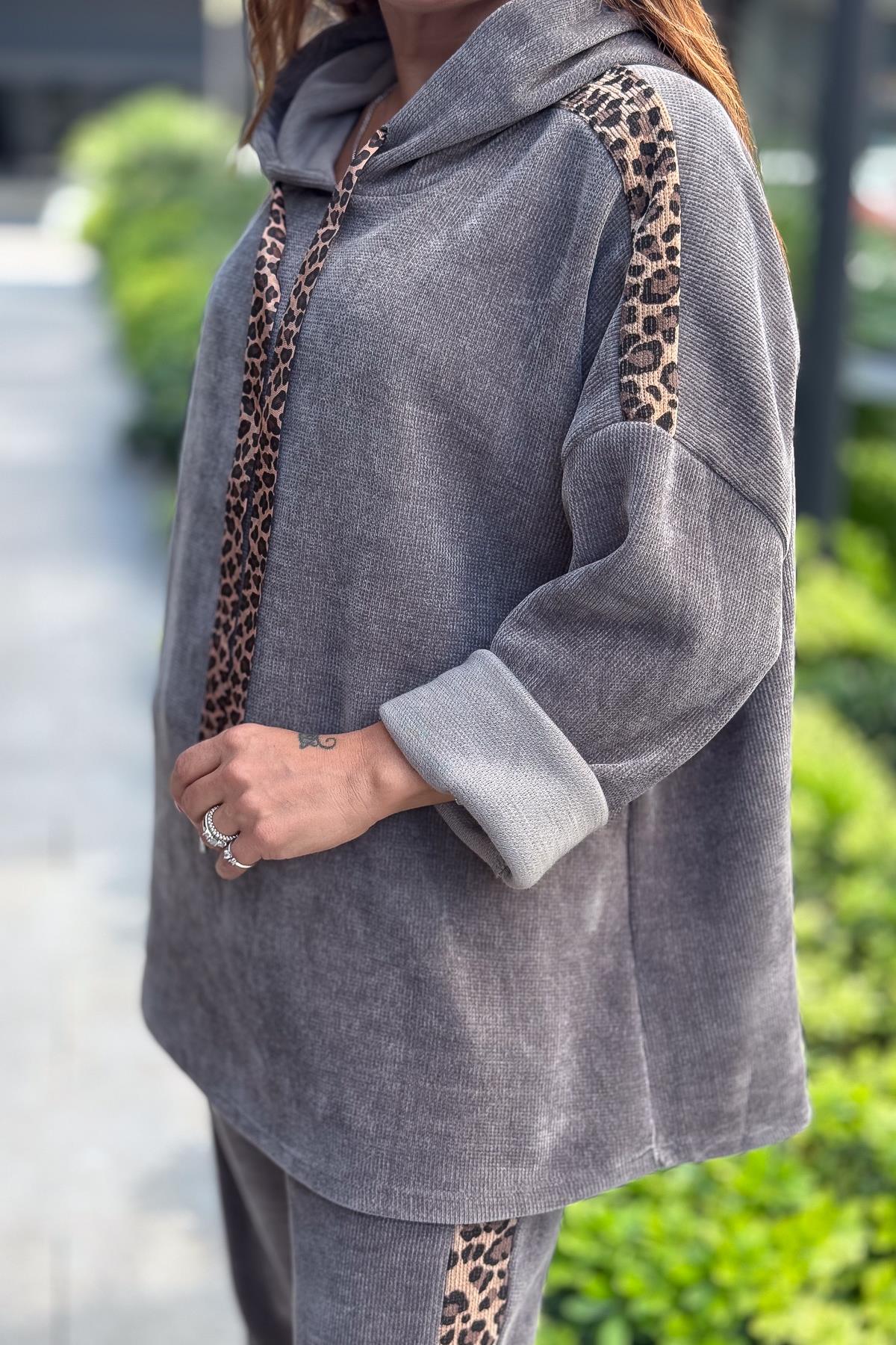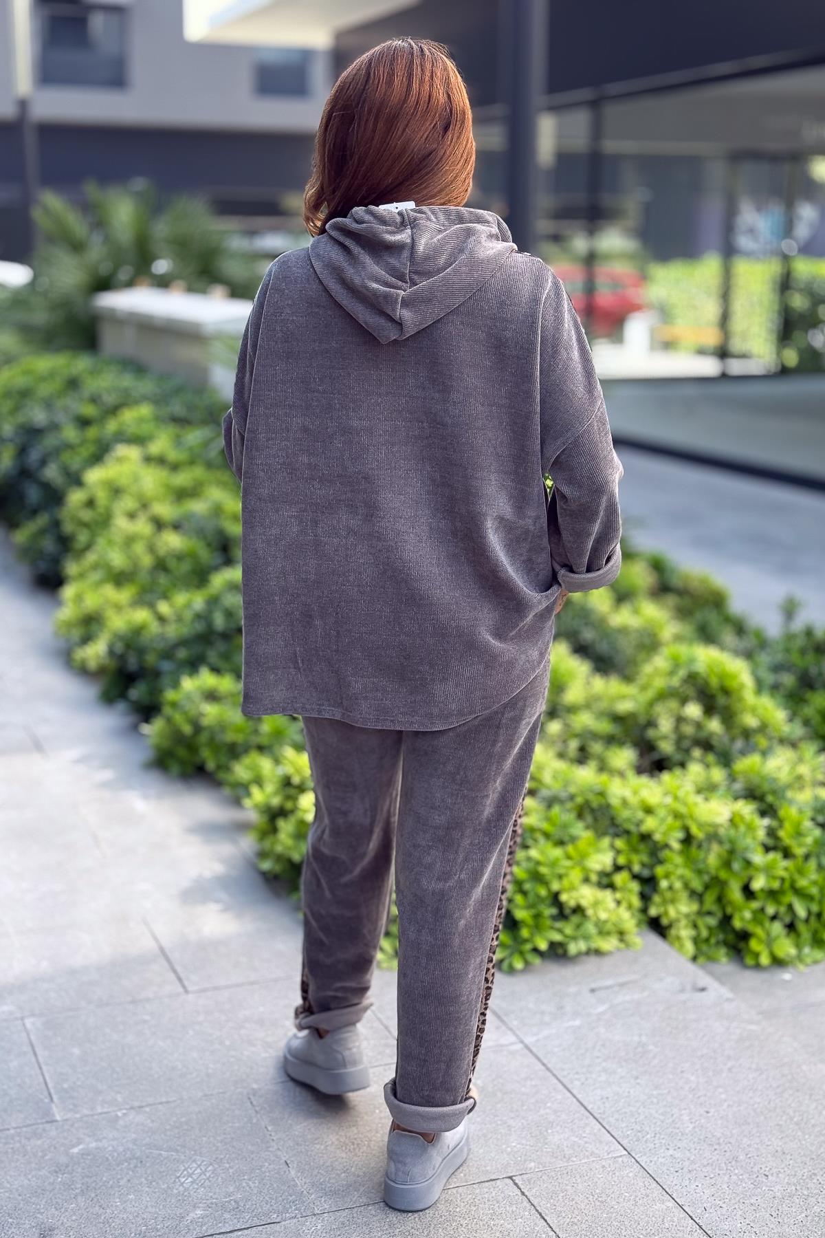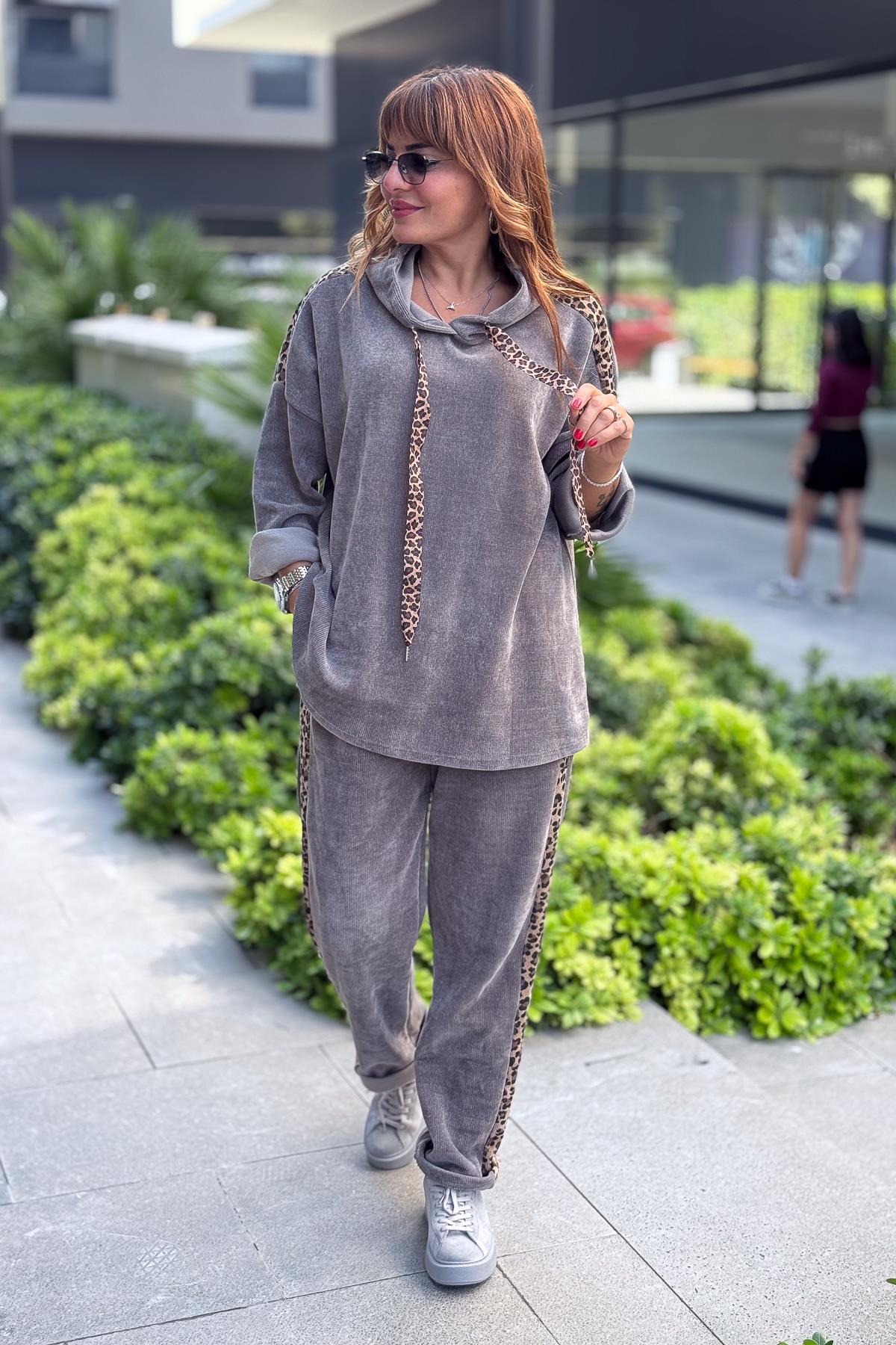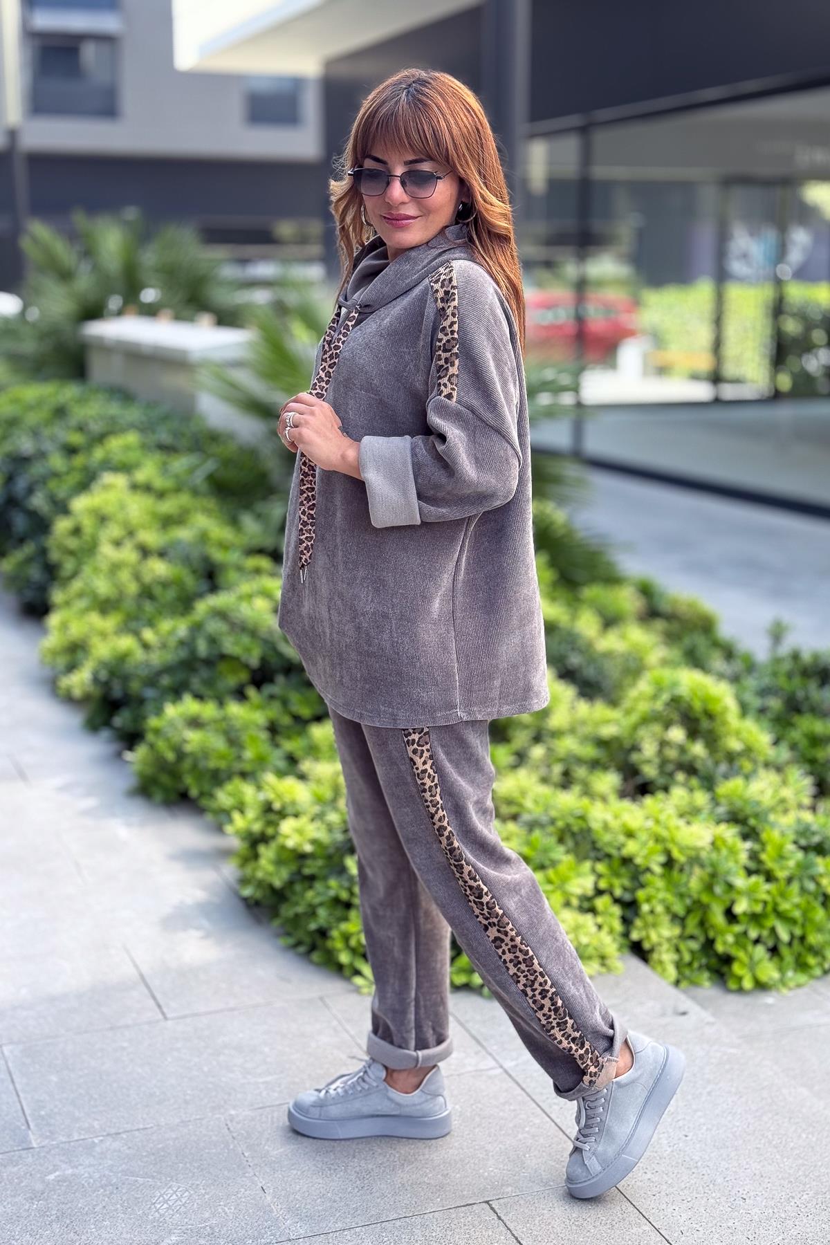 Leopar Şeritli Kapüşonlu Kadife Sweet Gri Renk