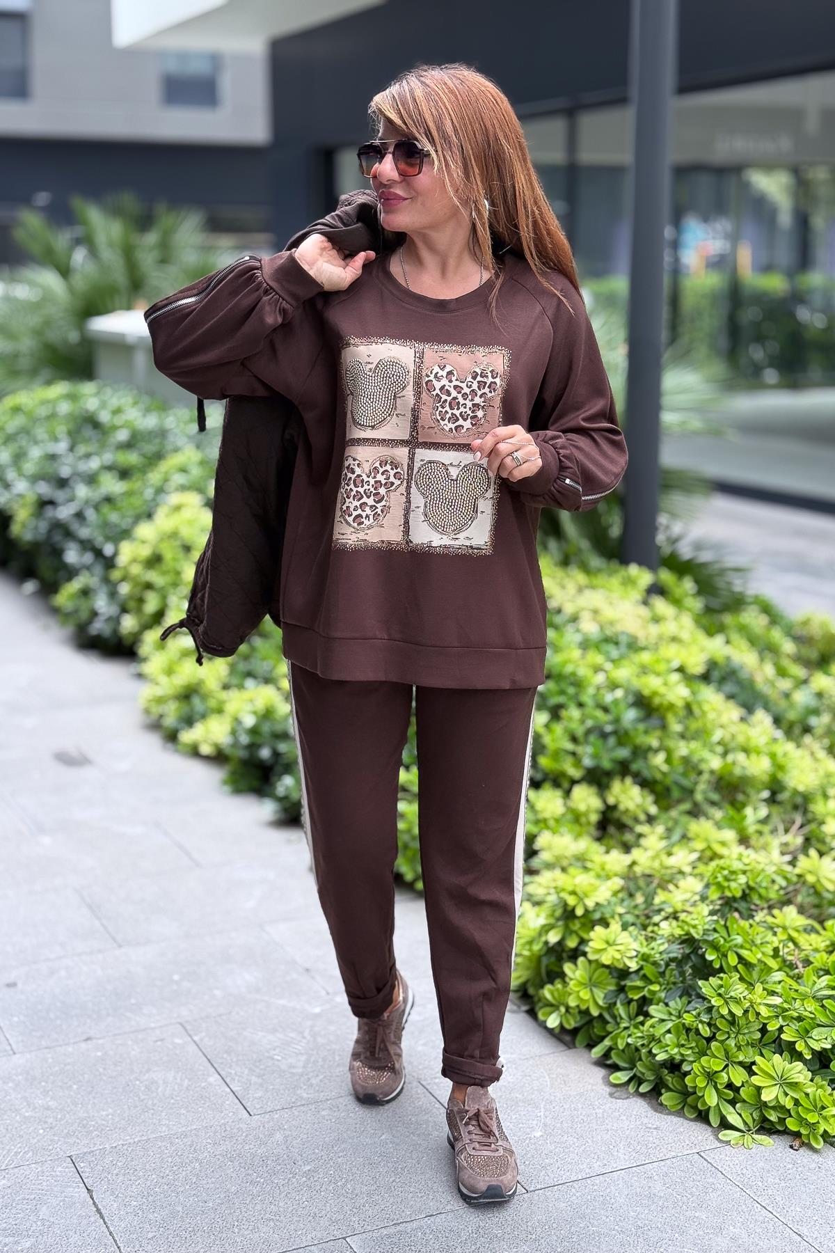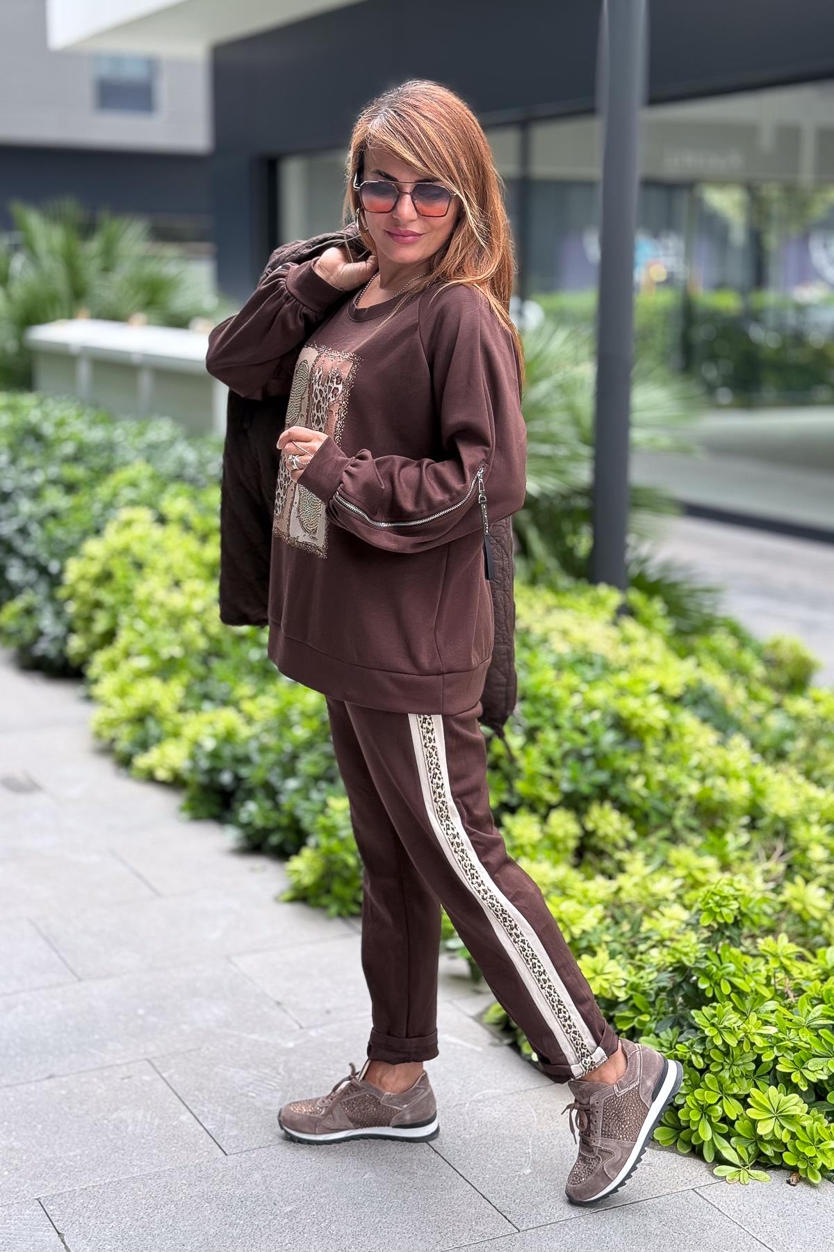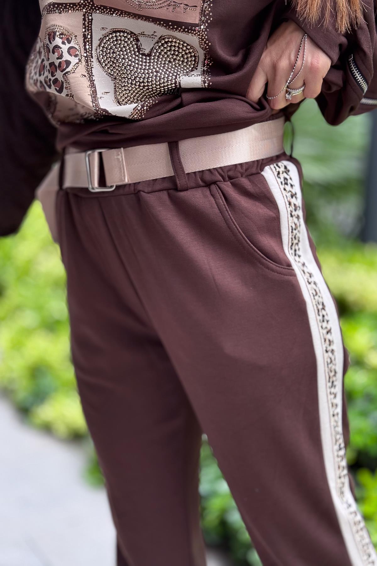 Leopar Şeritli Modal Kumaş Havuç Paça Eşorfman Acı Kahve Renk