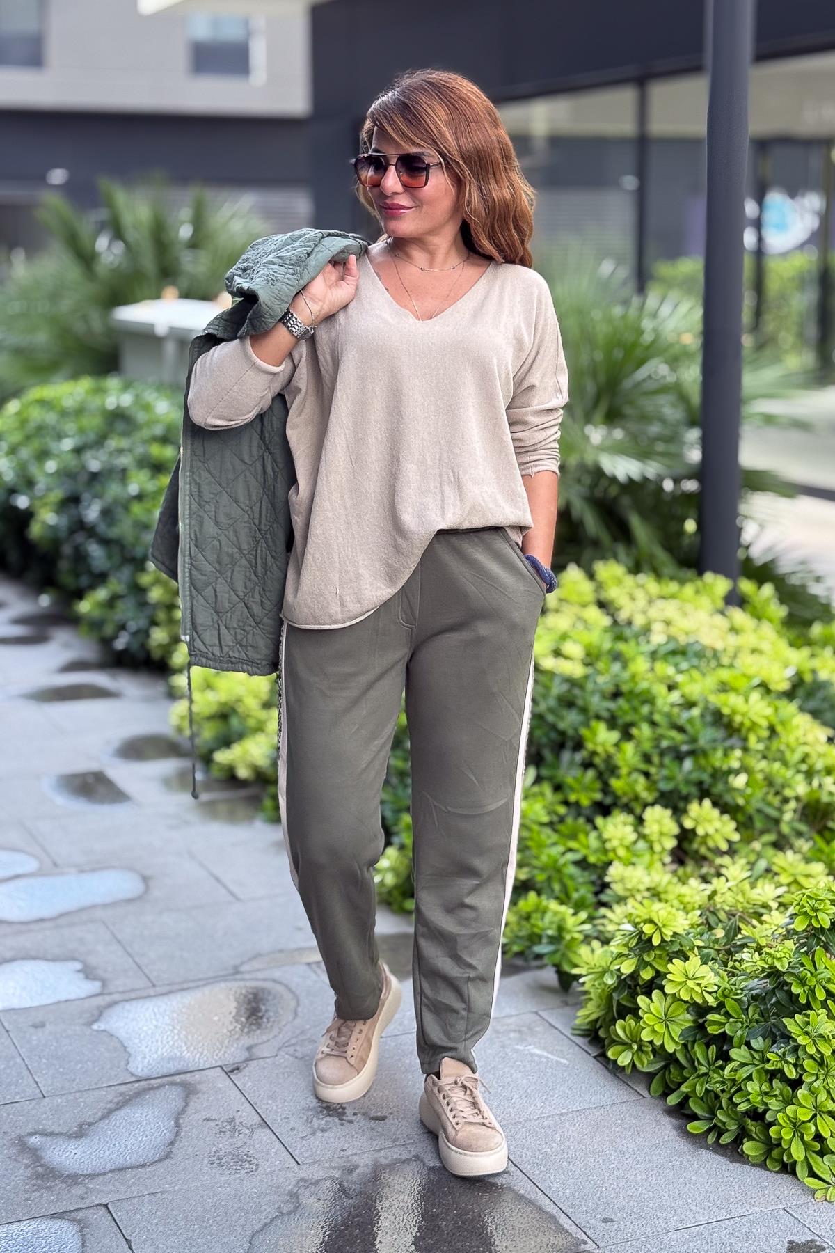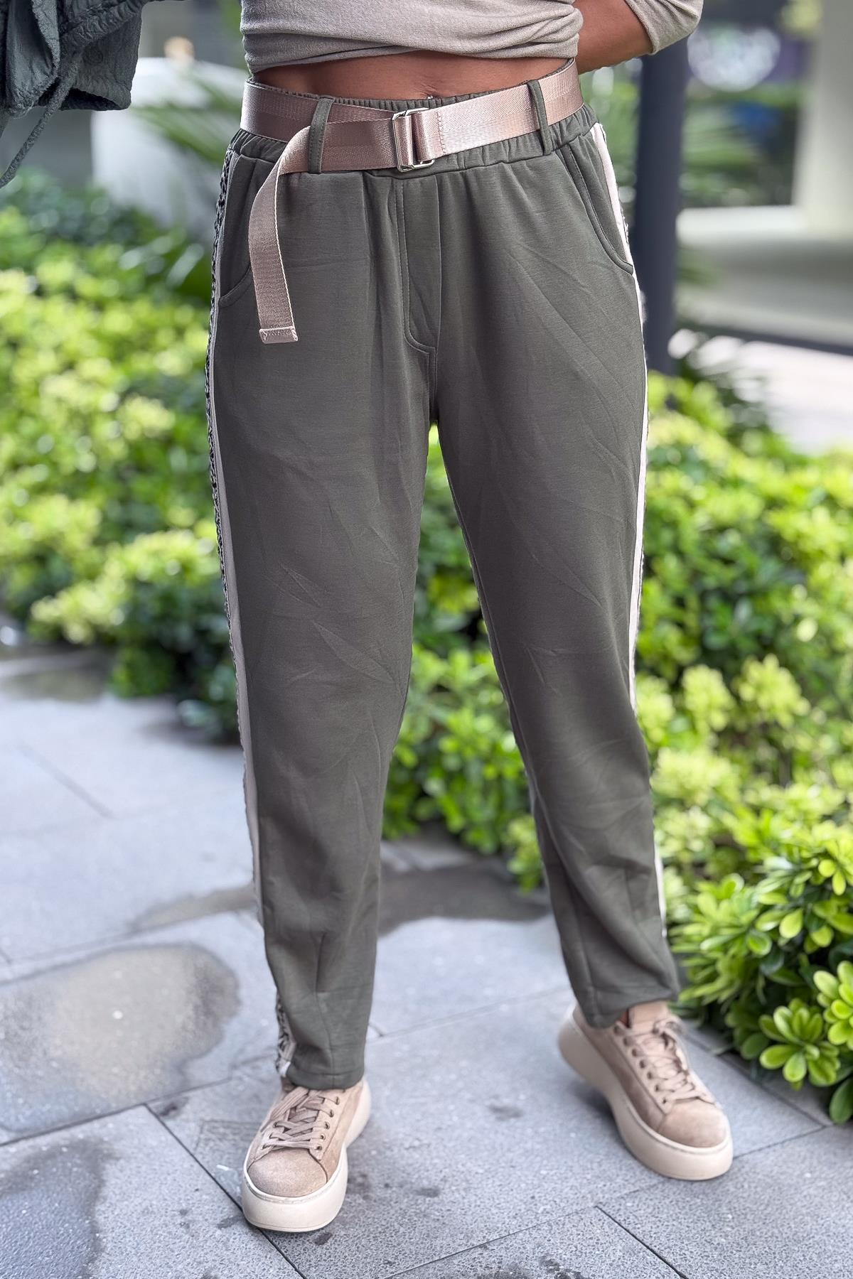 Leopar Şeritli Modal Kumaş Havuç Paça Eşorfman Haki Renk