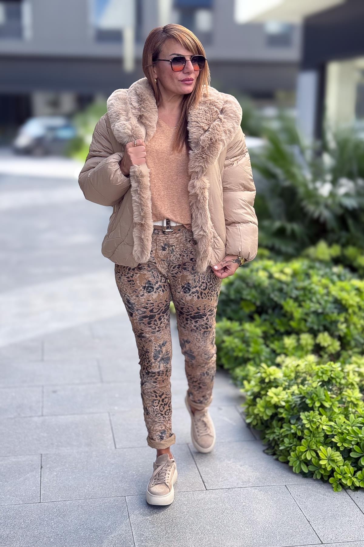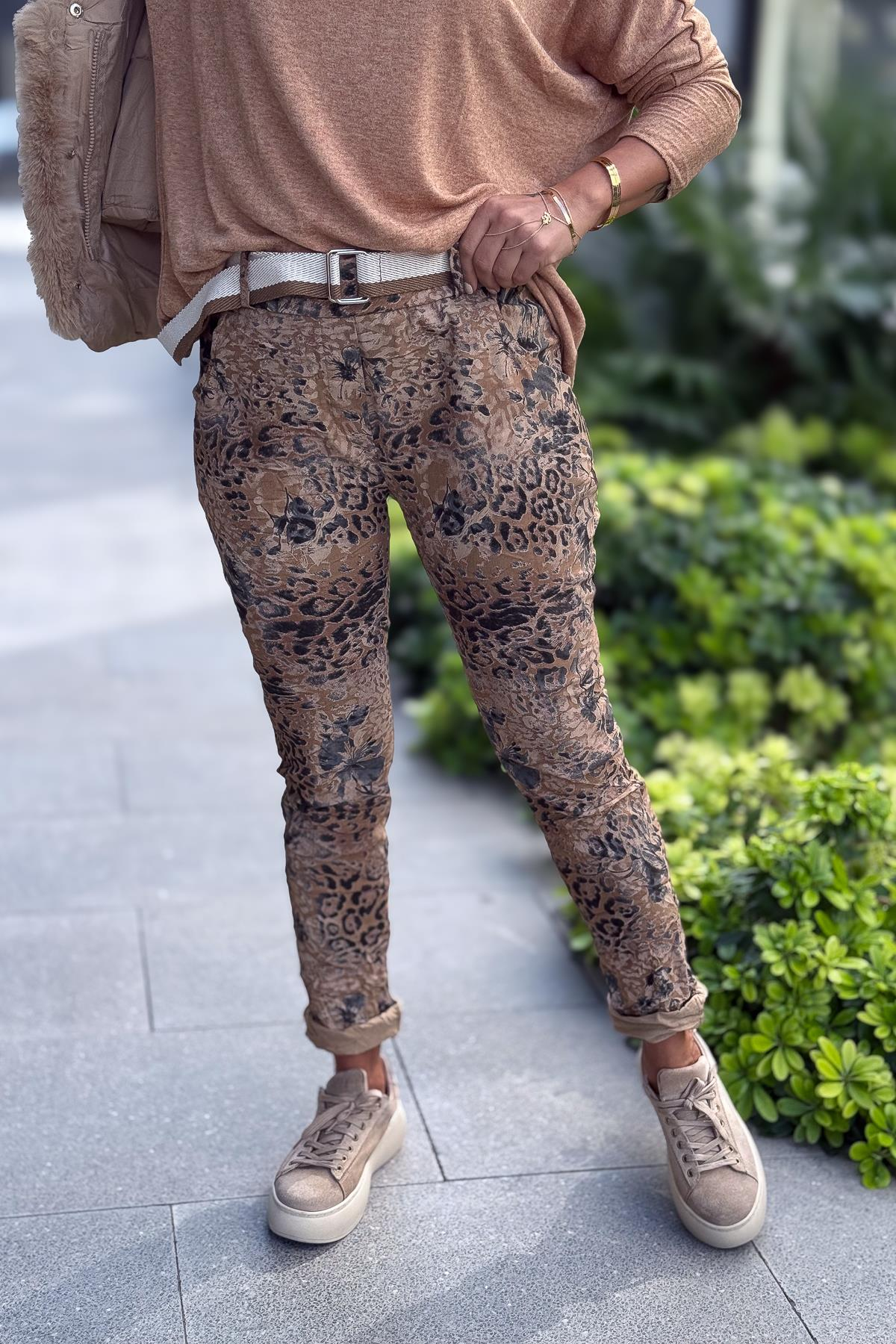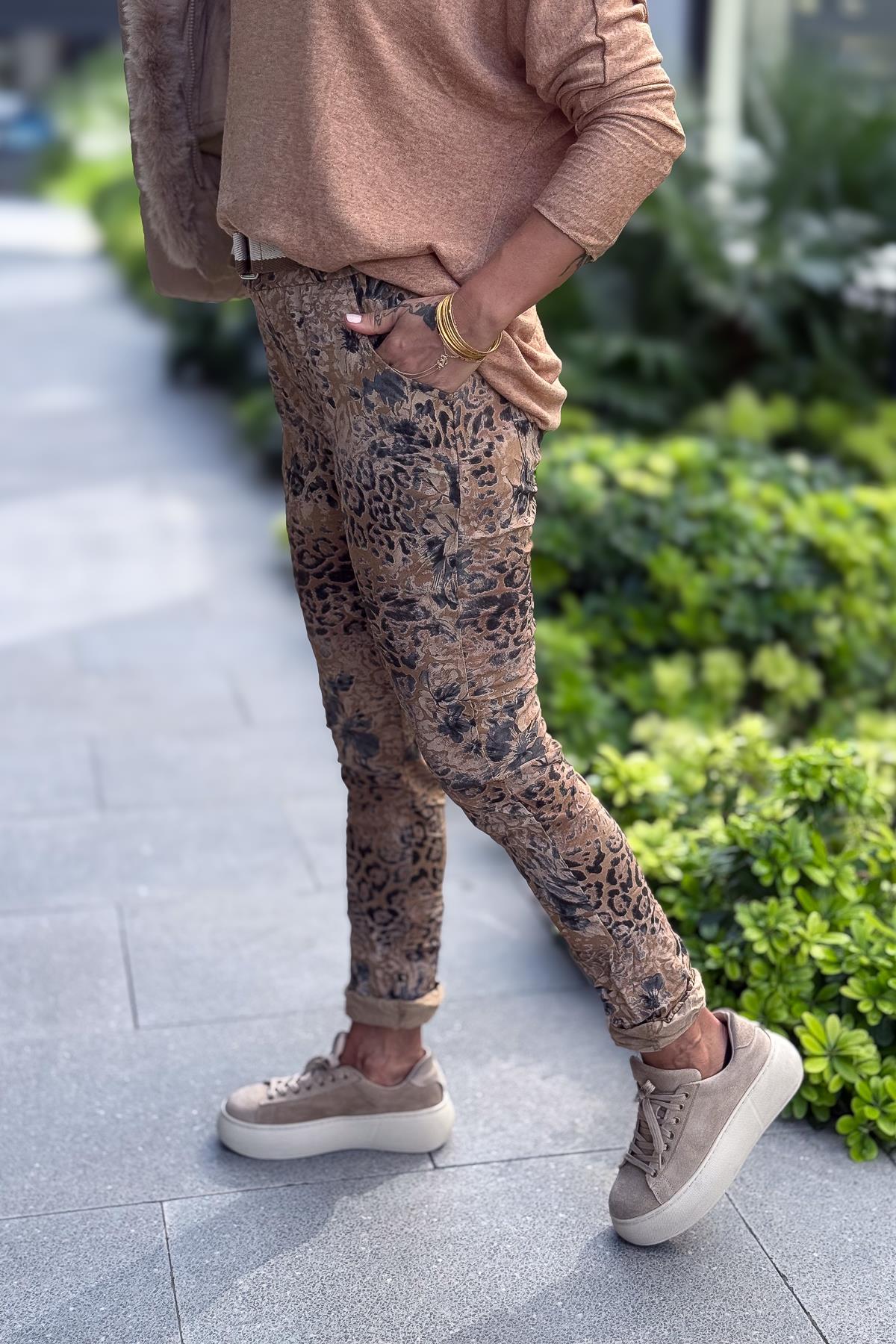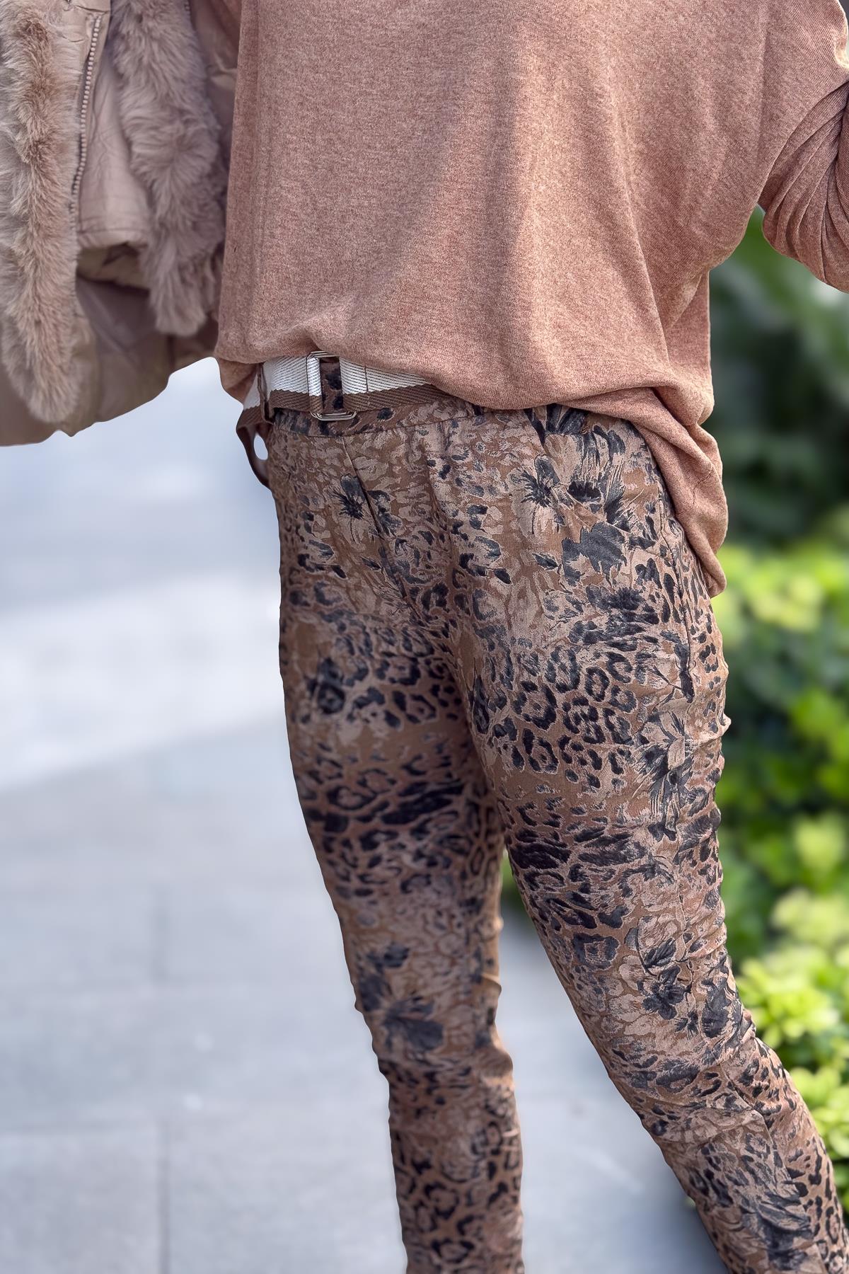 Leopar Ve Çiçek Desenli Likralı Pantolon Camel Renk