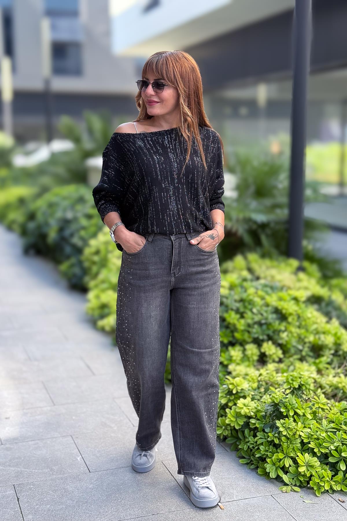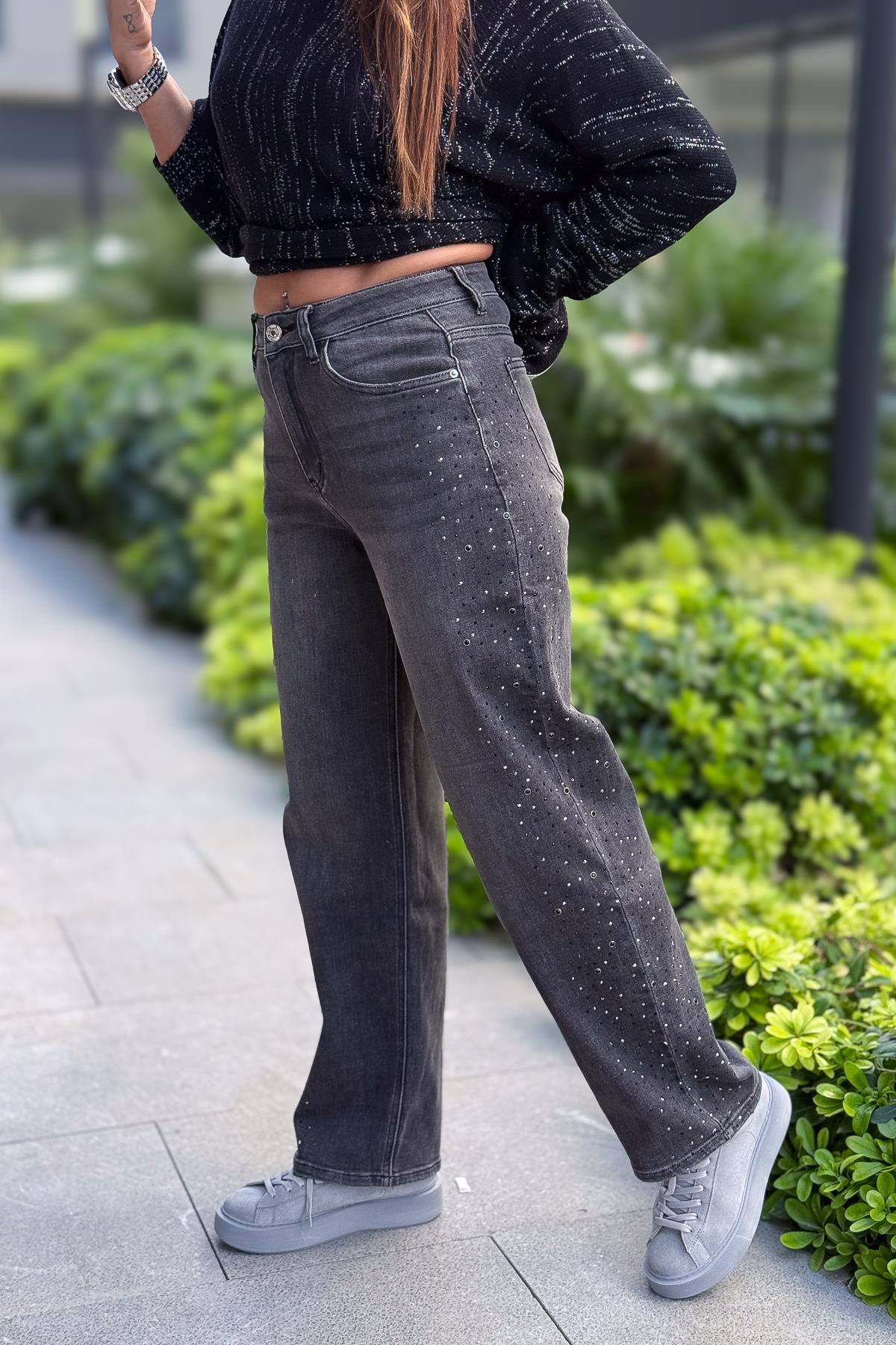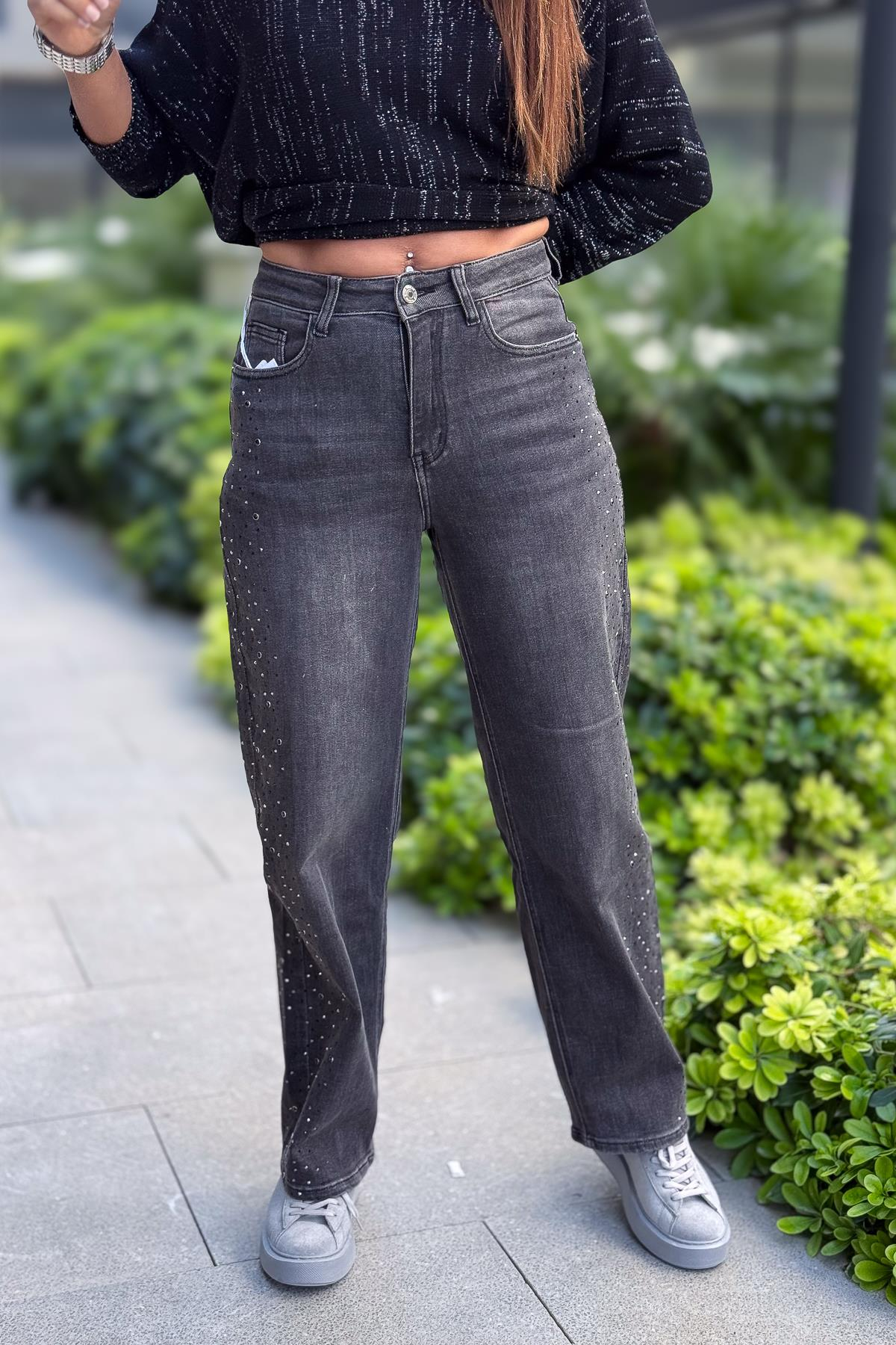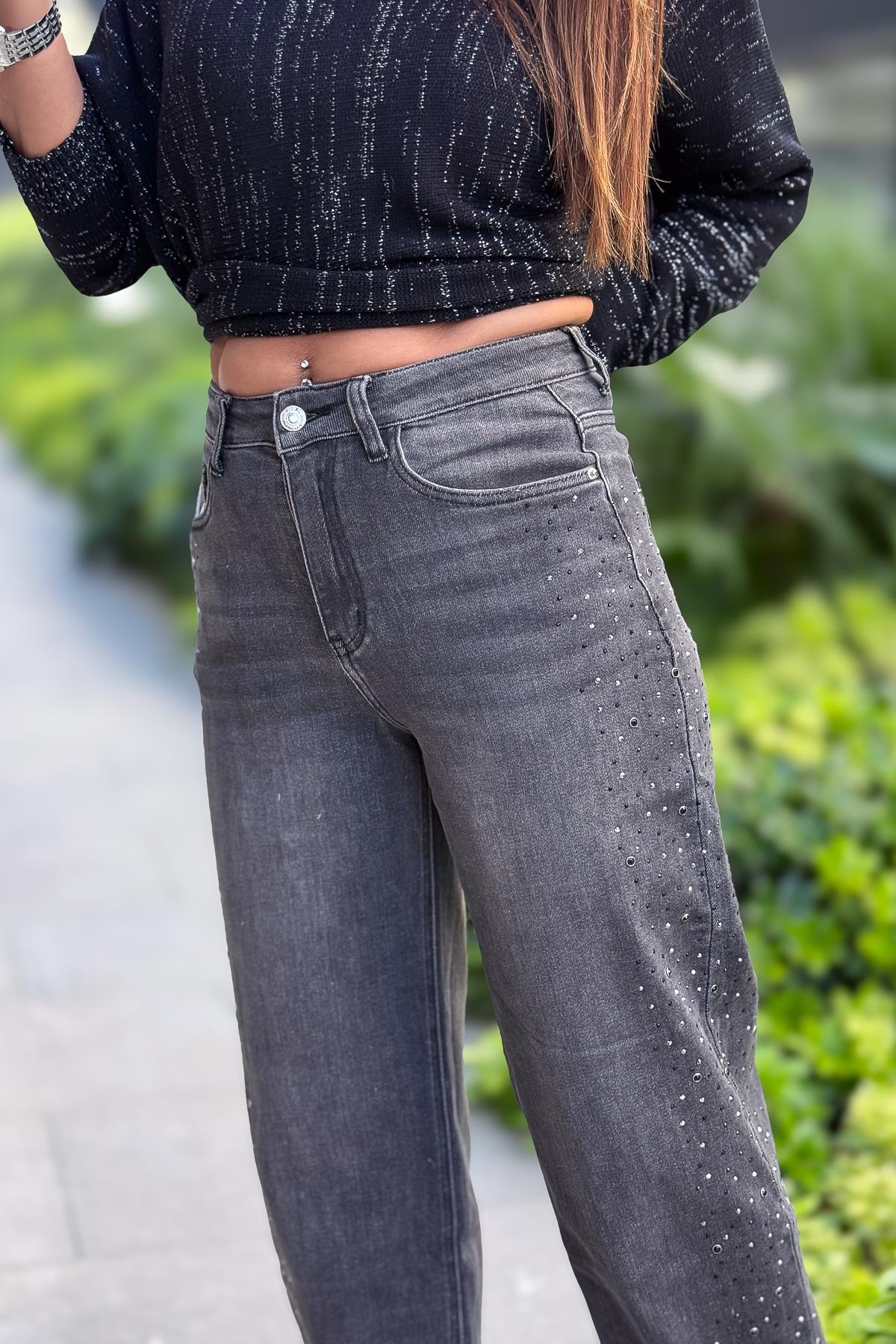 Mom Fit Taş Detaylı Kot Pantolon Füme Renk