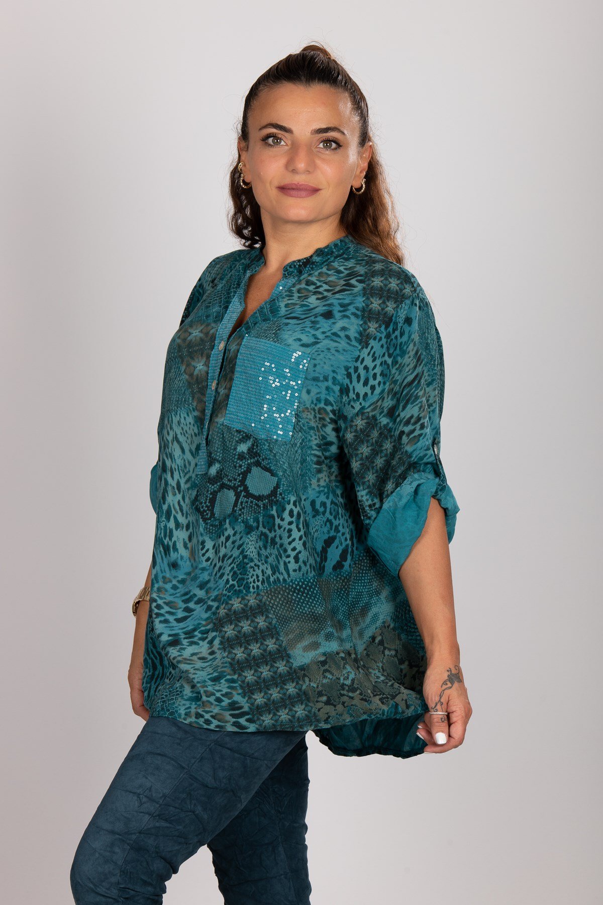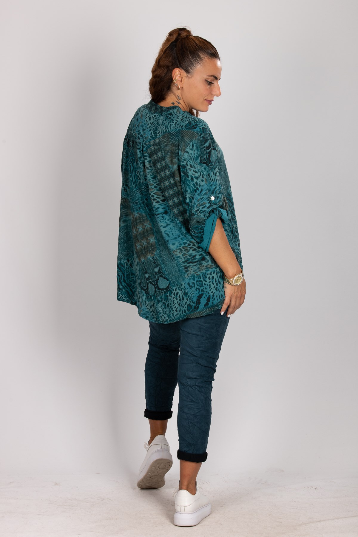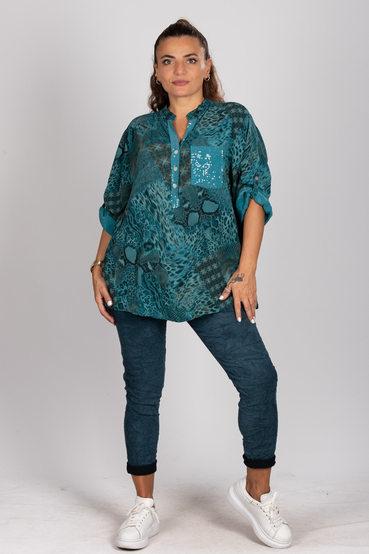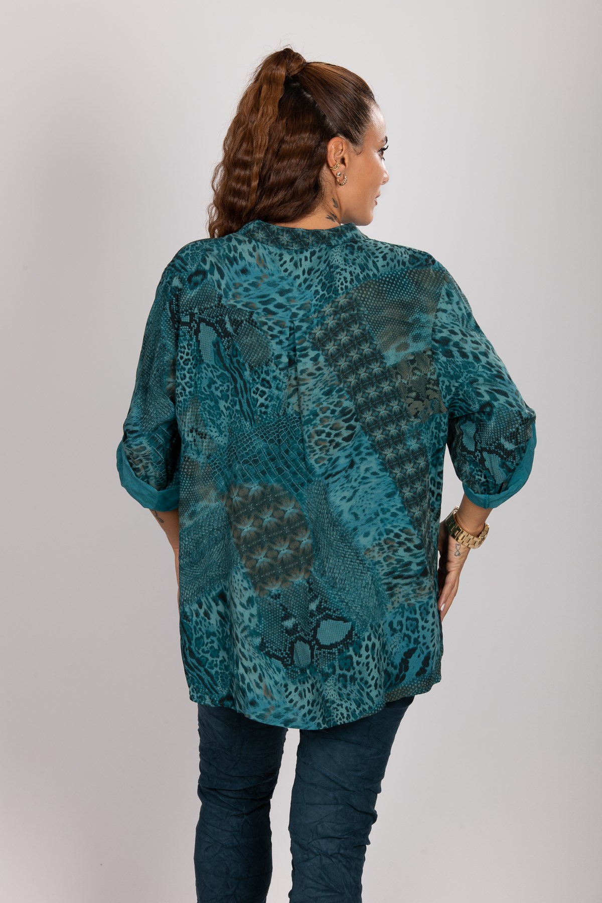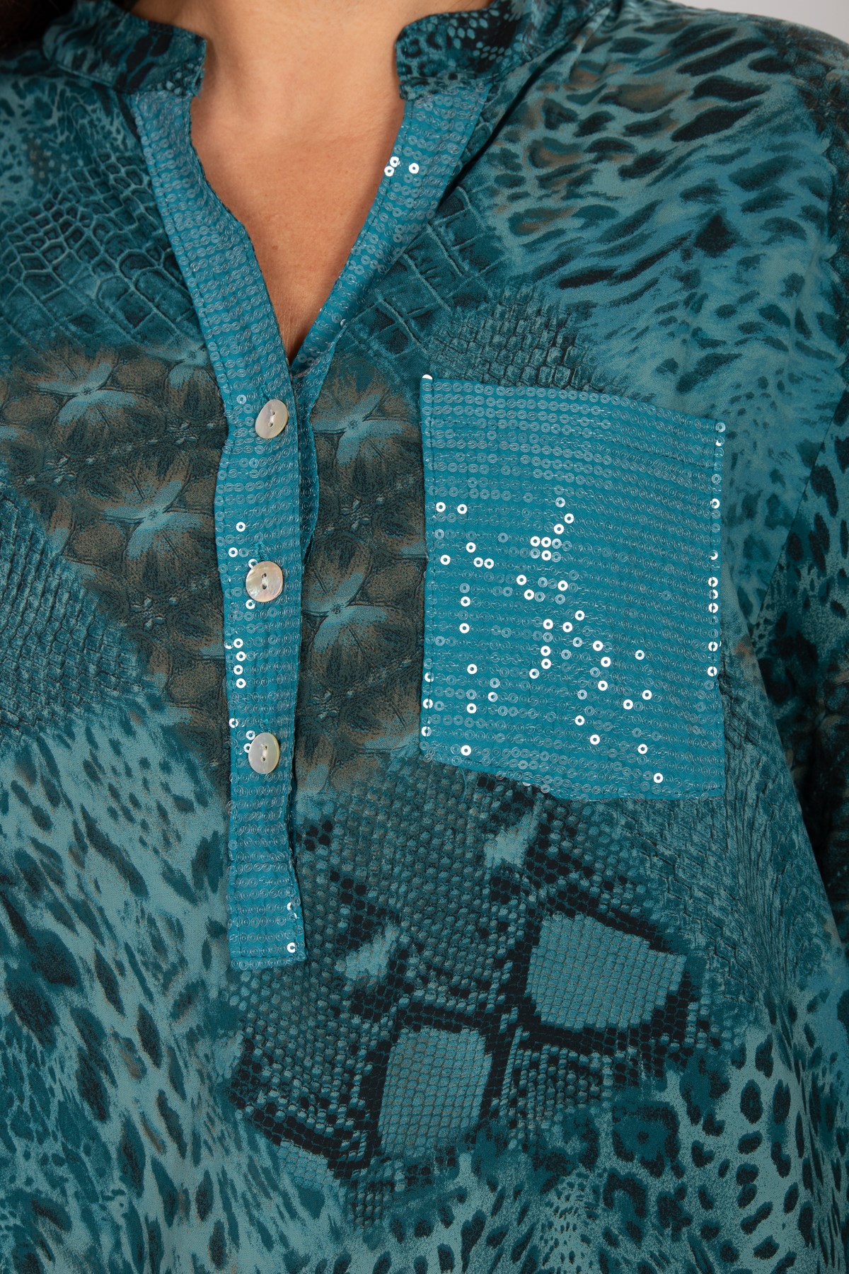 Piton Baskılı Cebi Pullu Yarım Düğmeli Gömlek Petrol Mavisi Renk