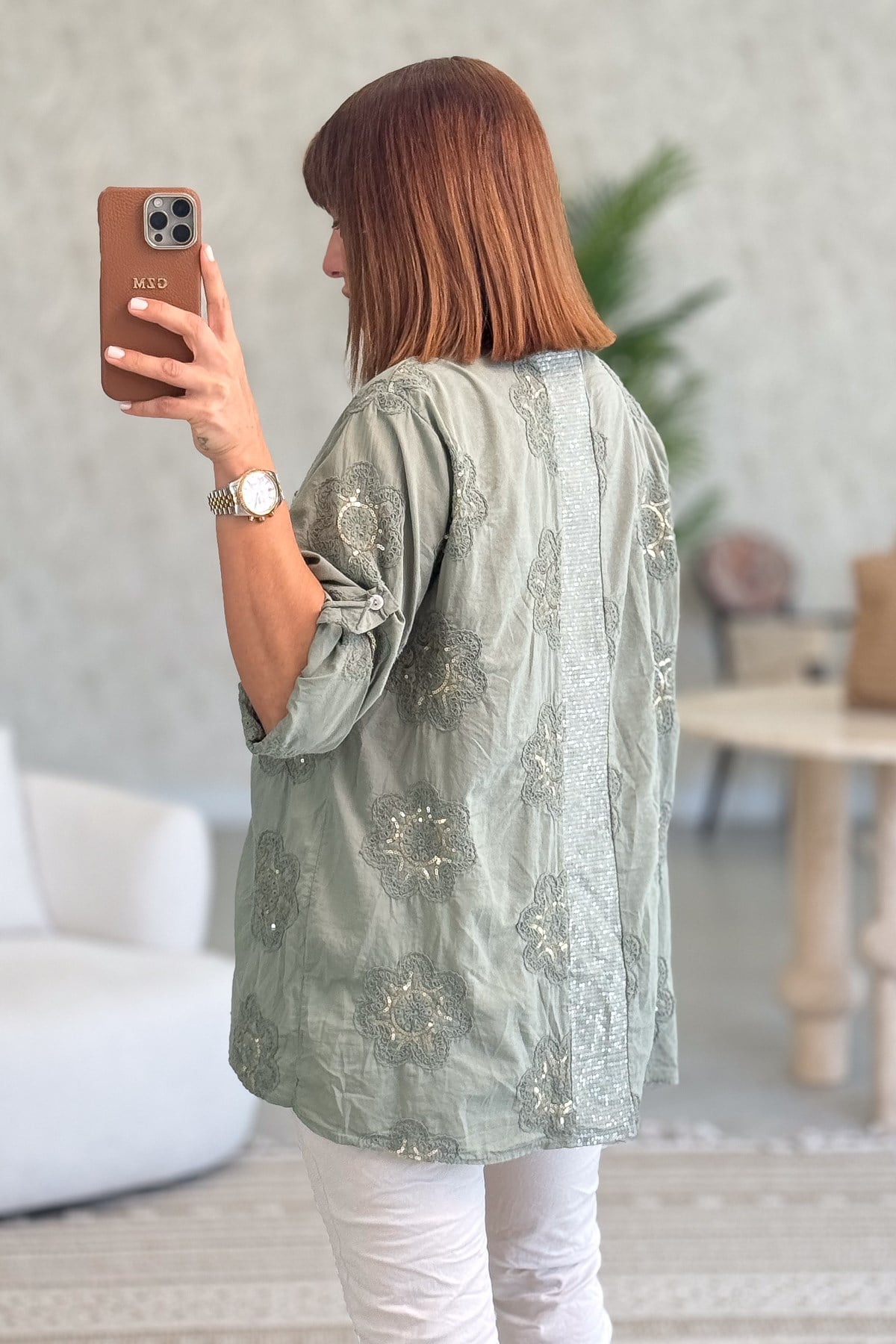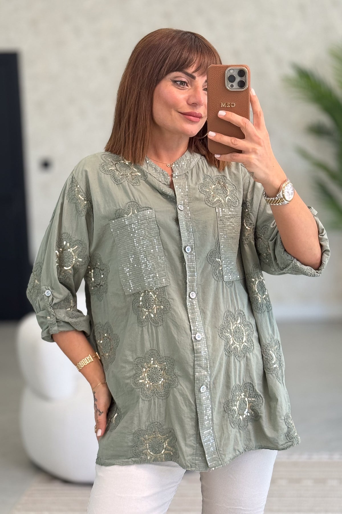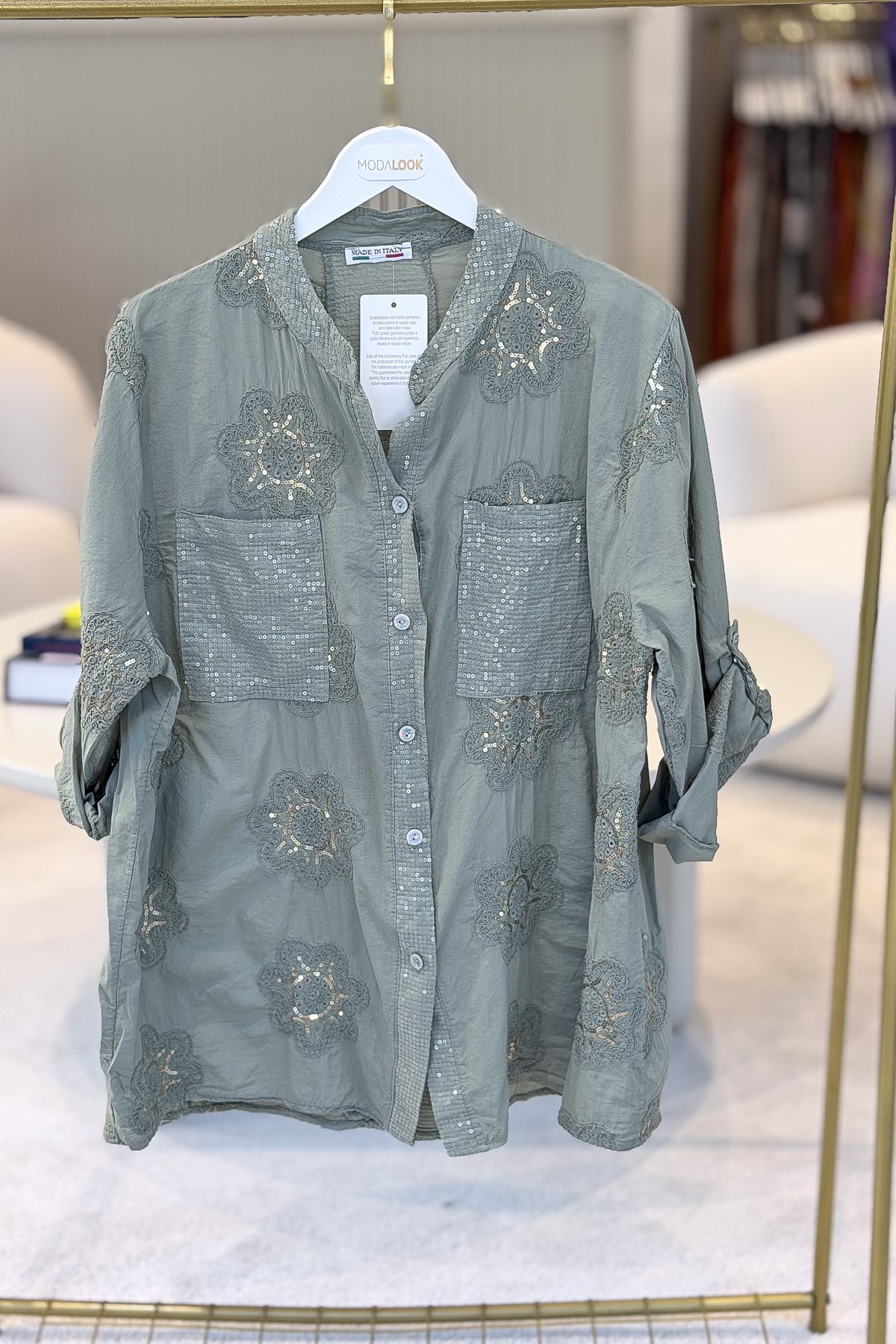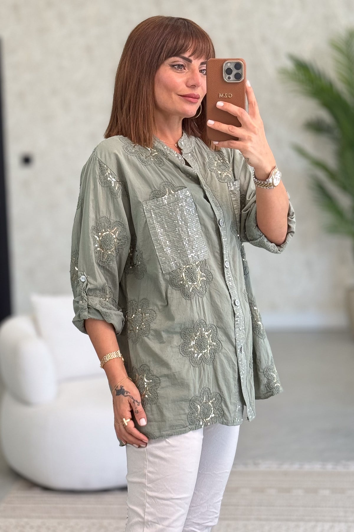 Pullu Çiçek Desenli Gömlek Haki Renk