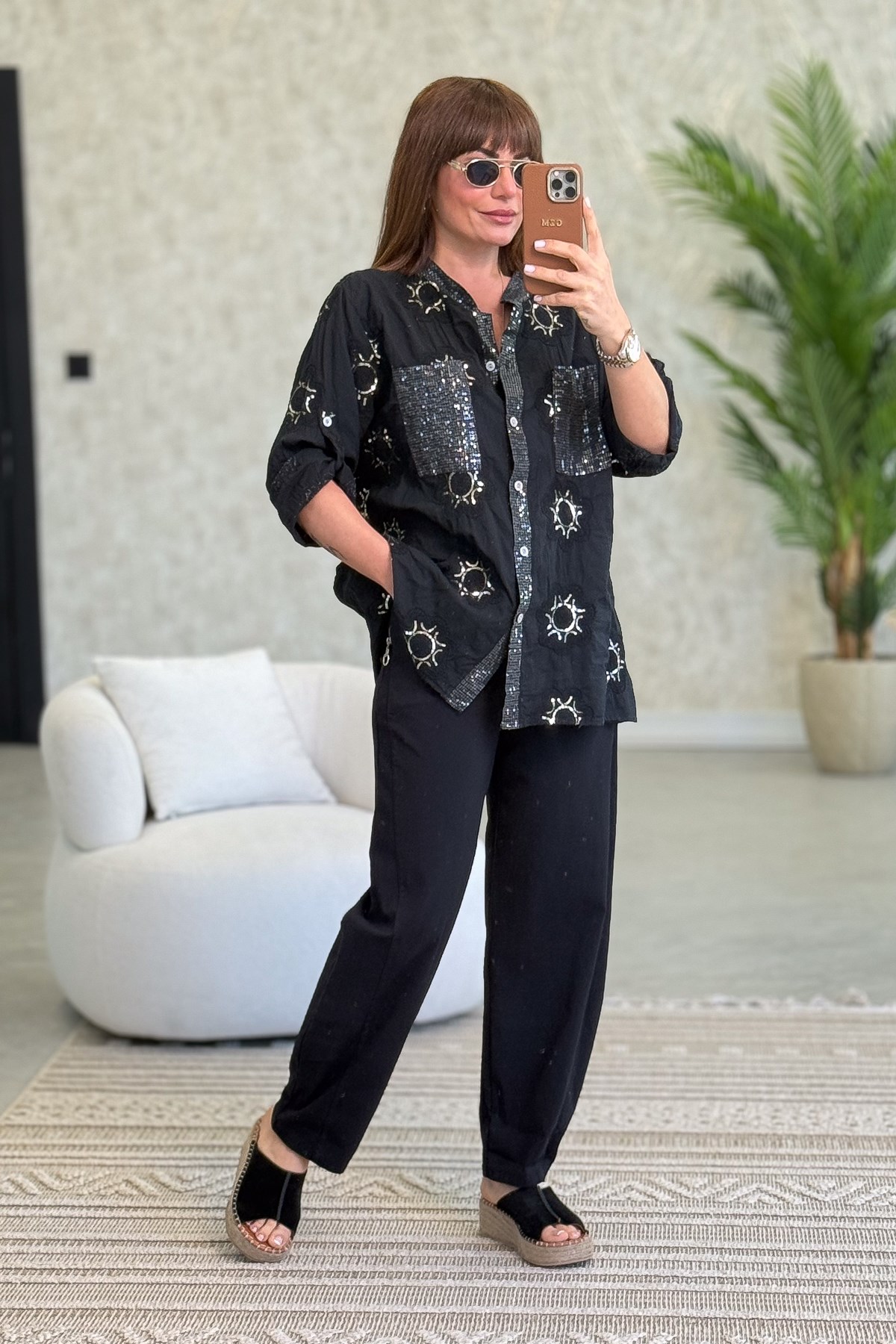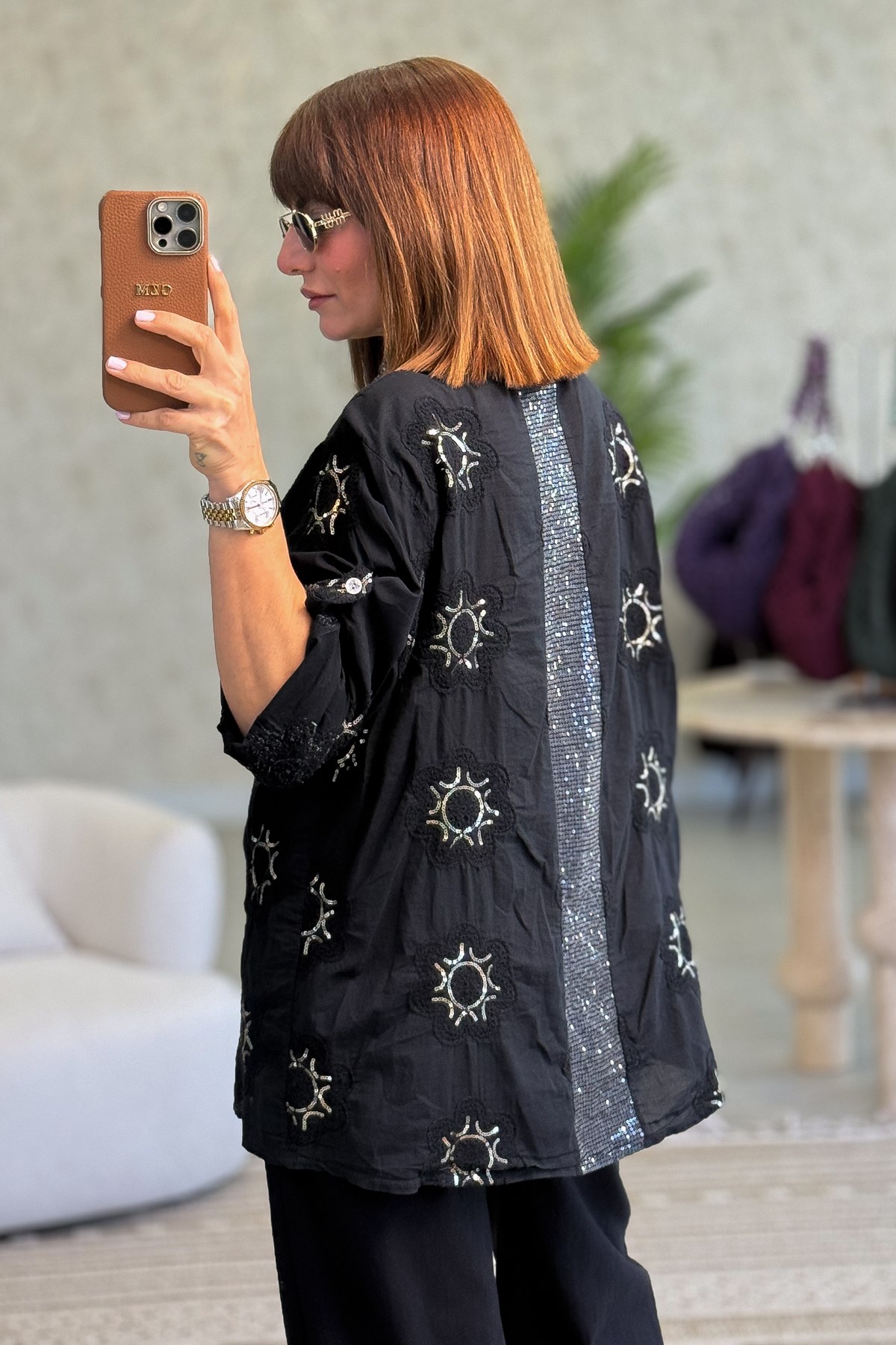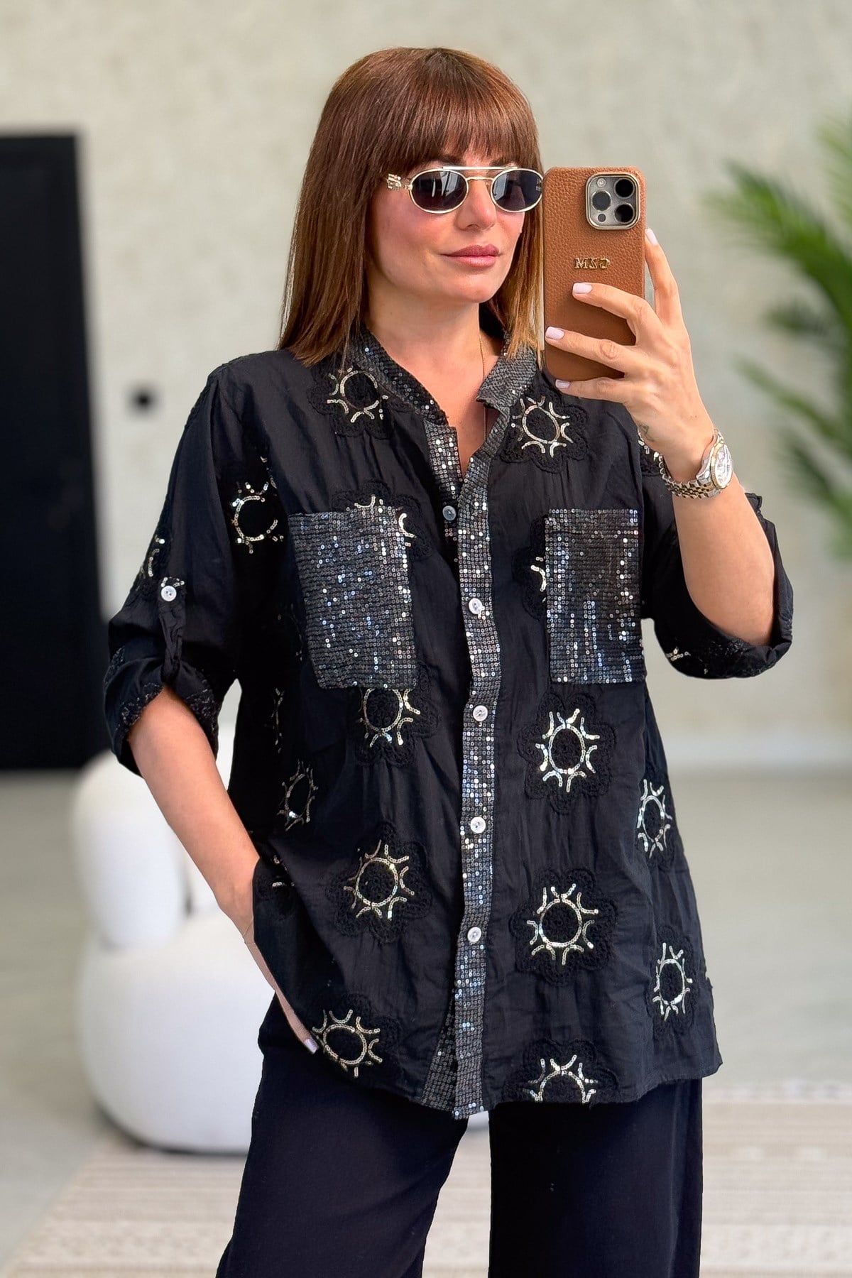 Pullu Çiçek Desenli Gömlek Siyah Renk