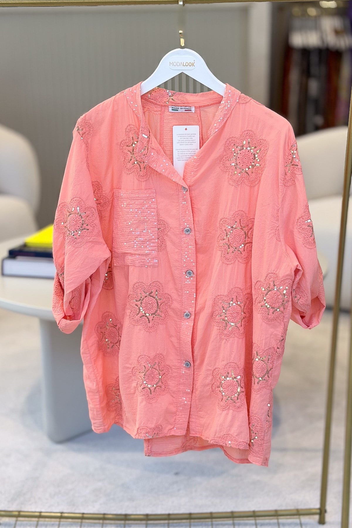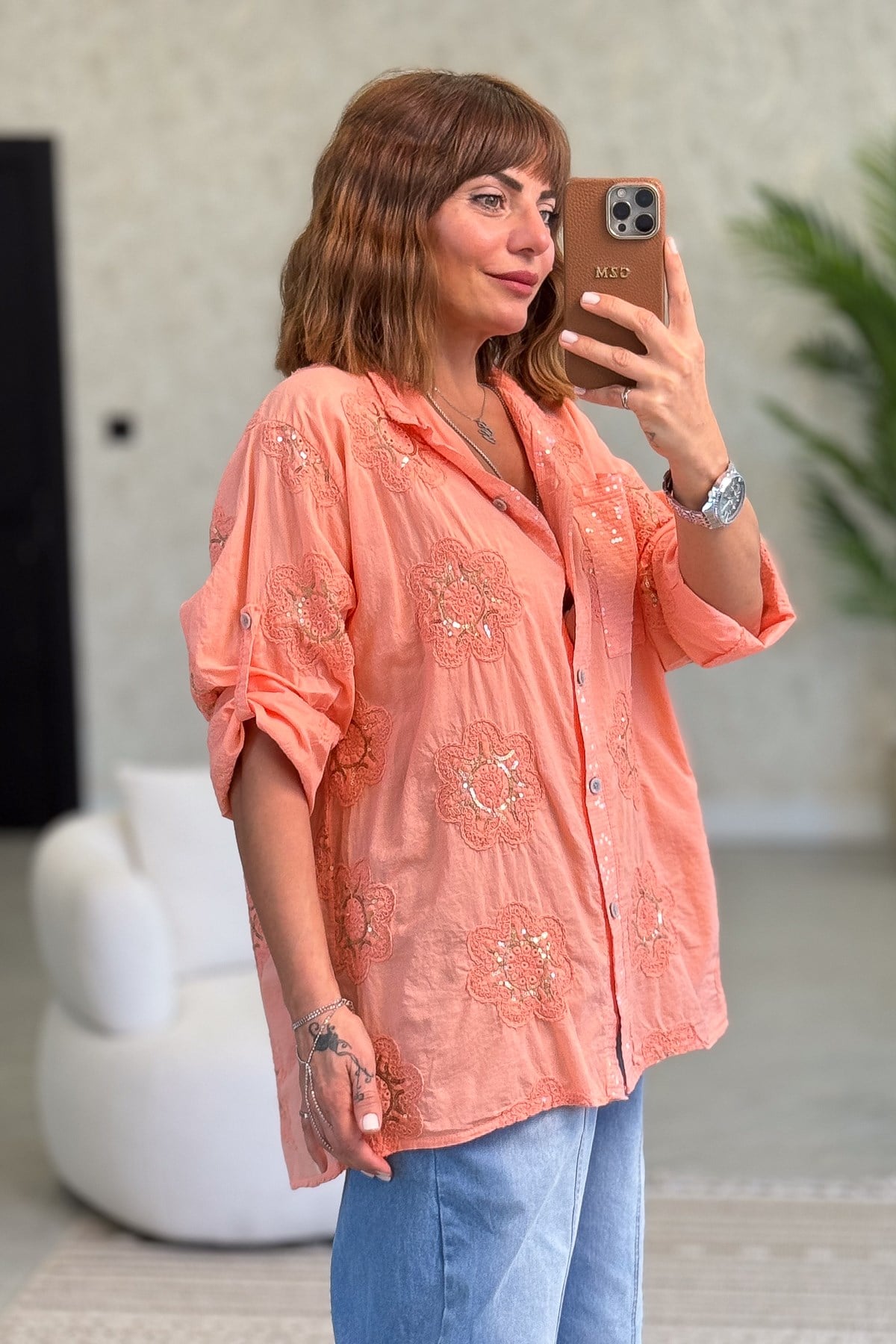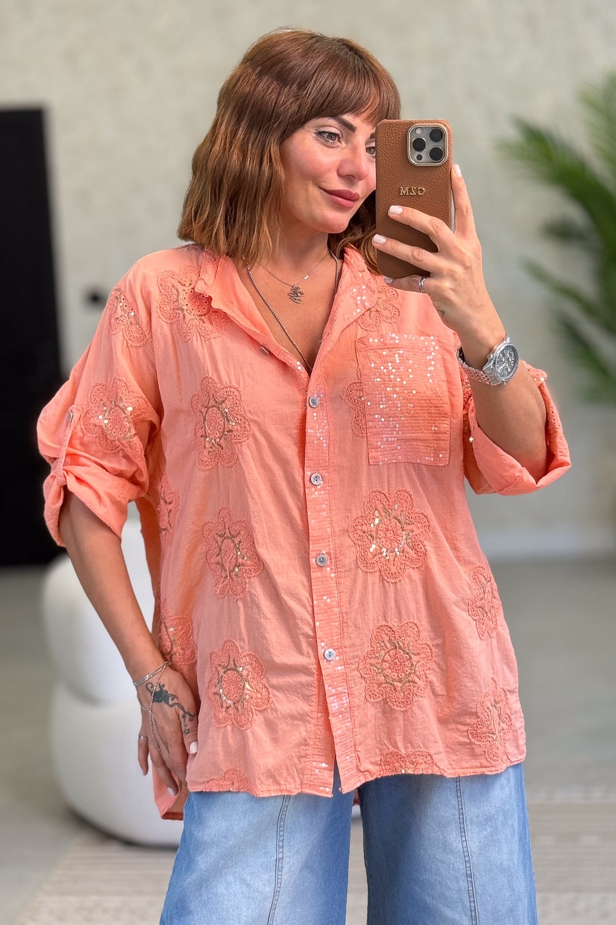 Pullu Çiçek Desenli Gömlek Somon Renk