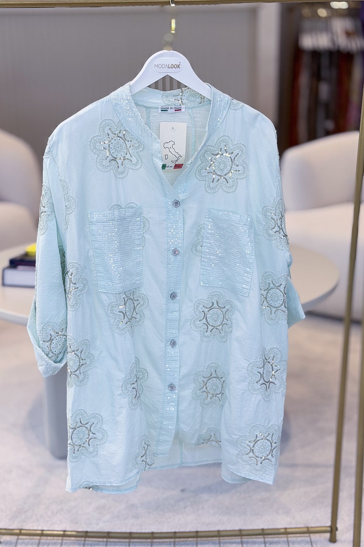 Pullu Çiçek Desenli Gömlek Su Yeşili Renk