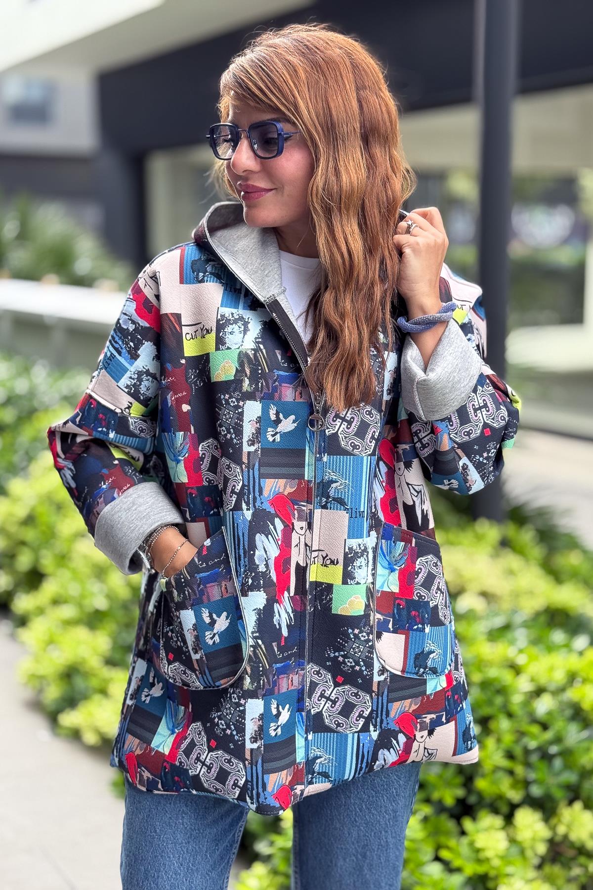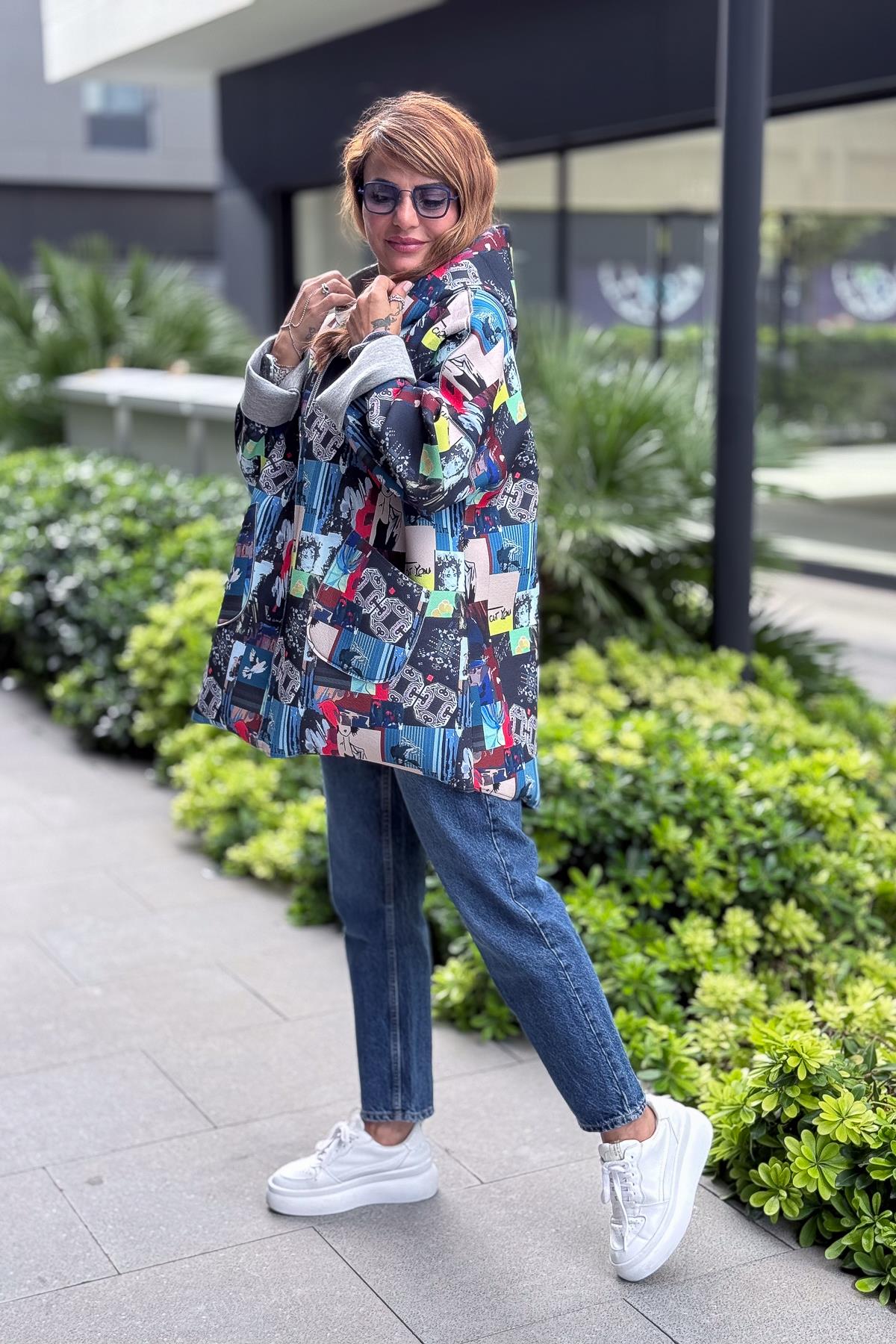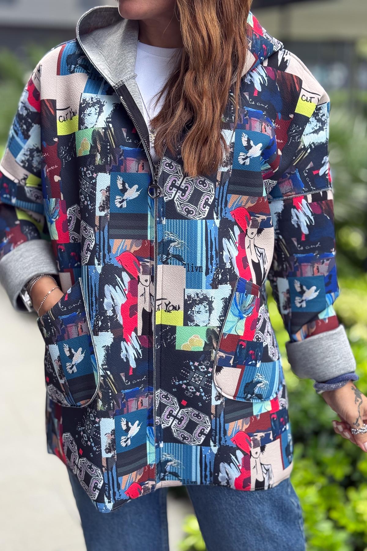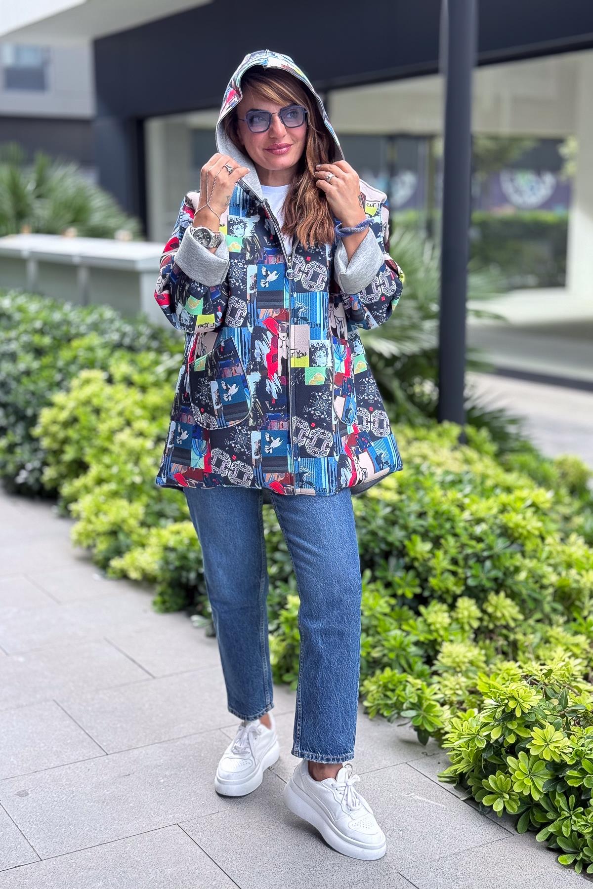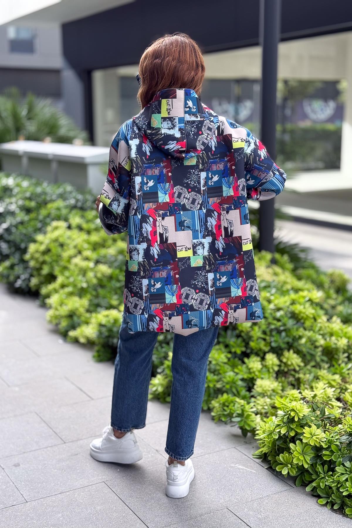 Renkli Desenleri Farklı Ceket Mavi Renk