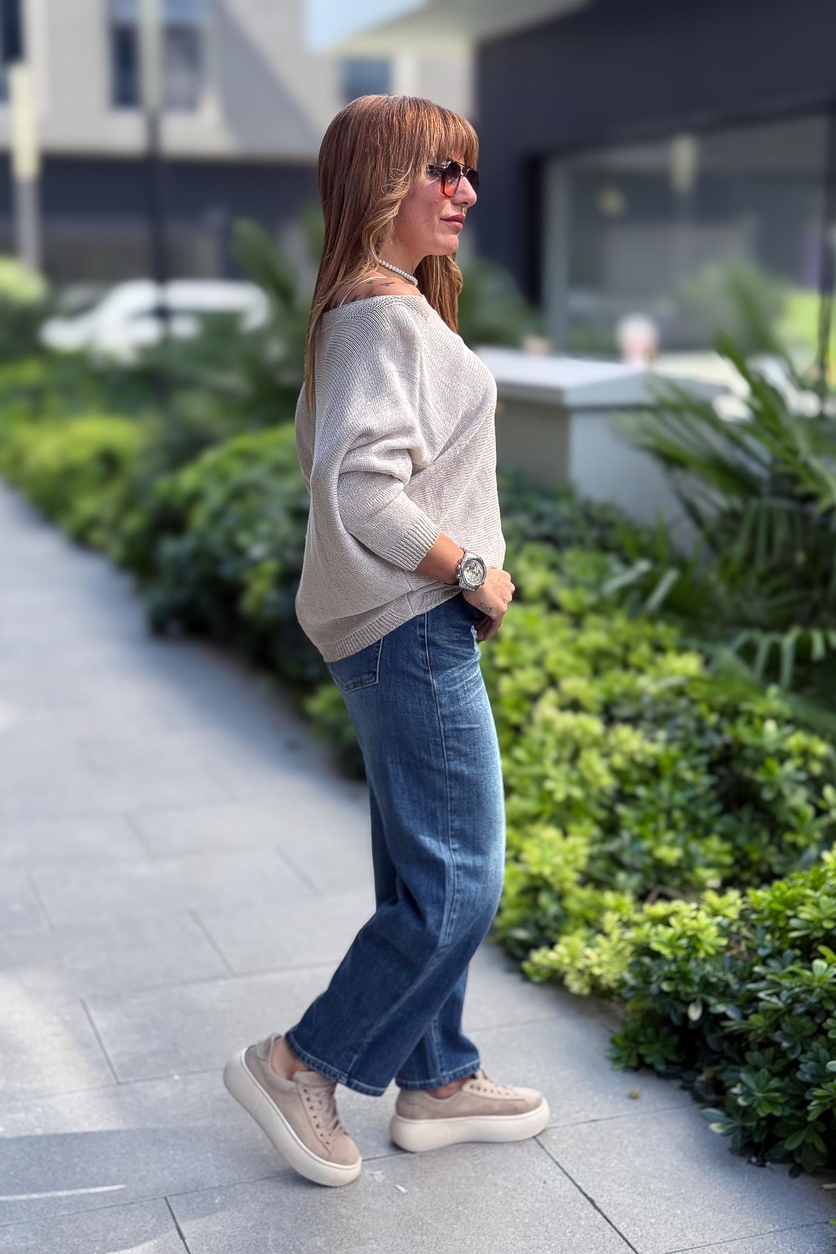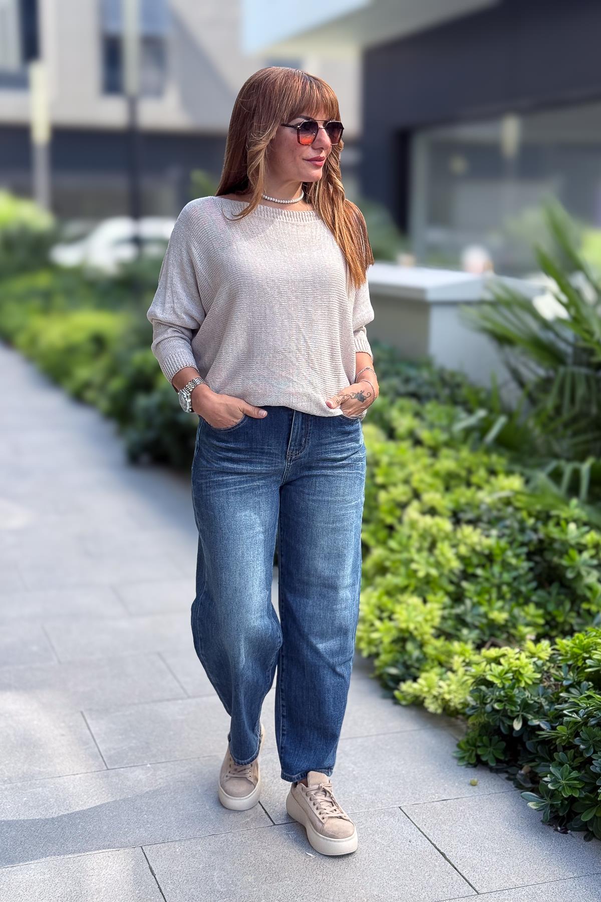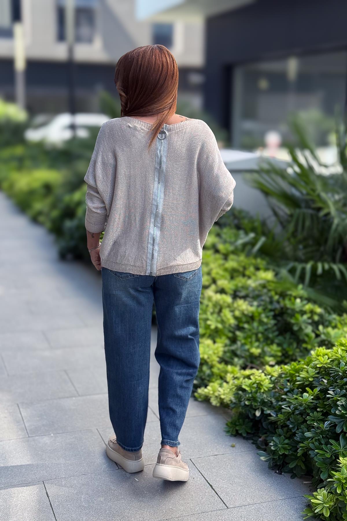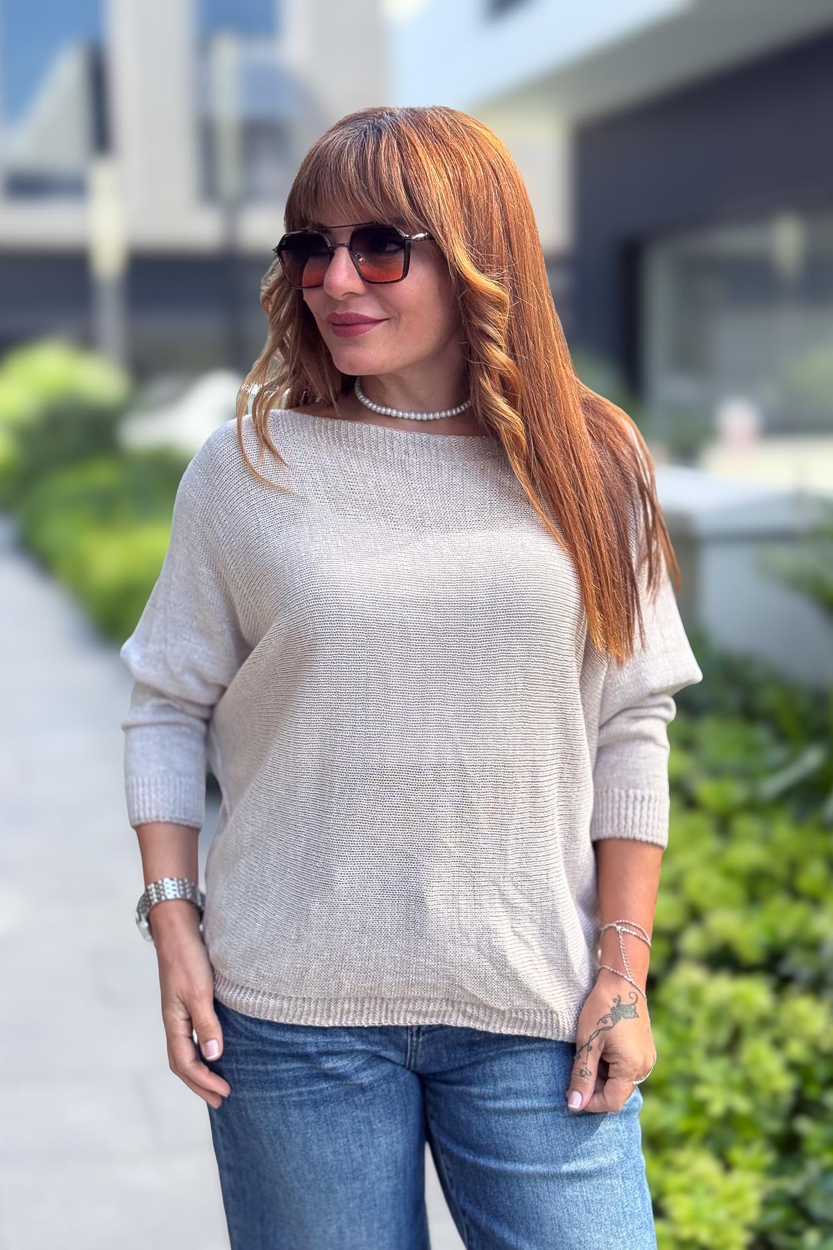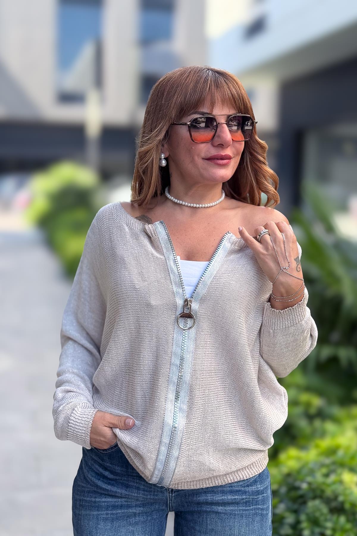 Sırtı Fermuar Detaylı Kayık Yaka Simli Triko Bej Renk
