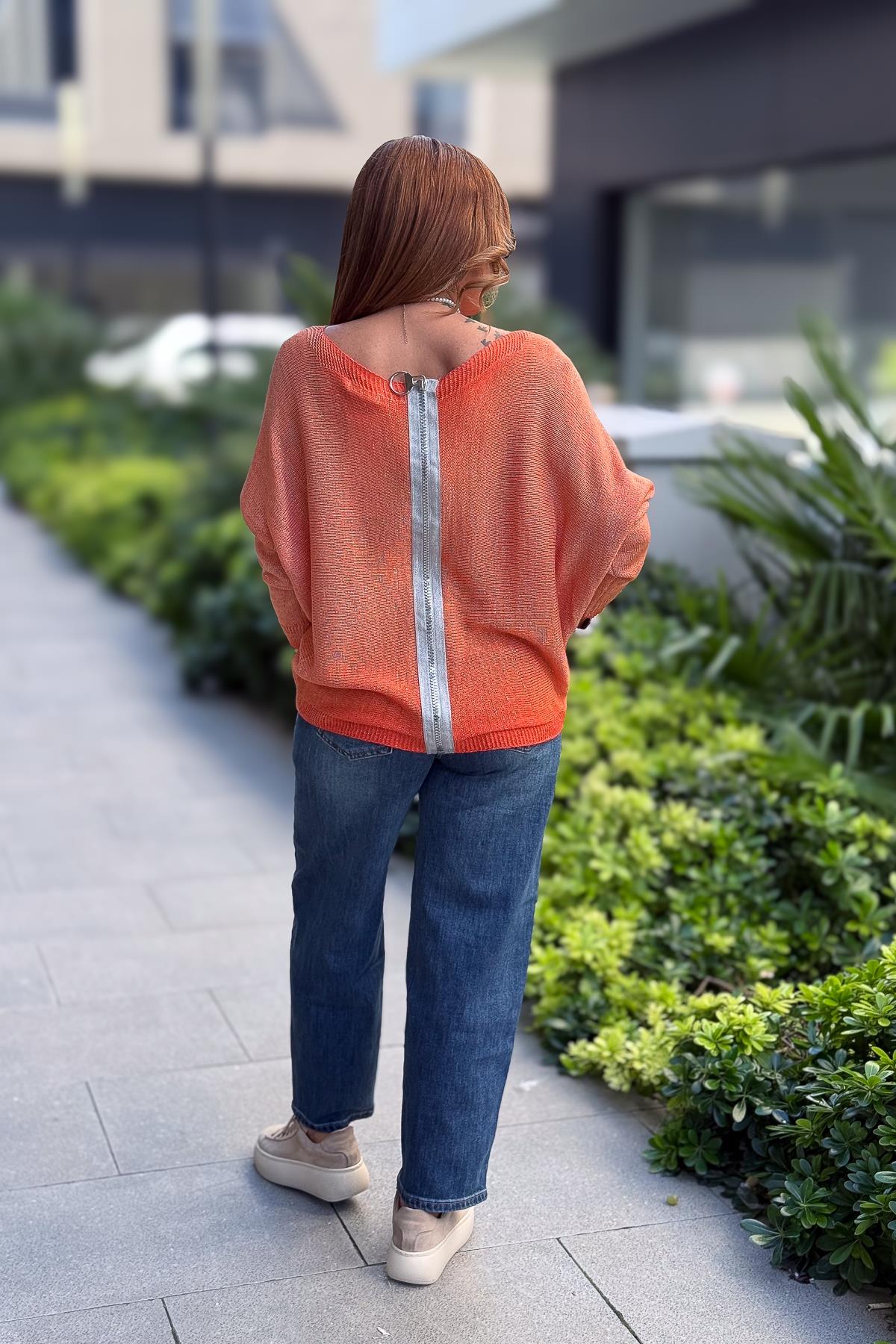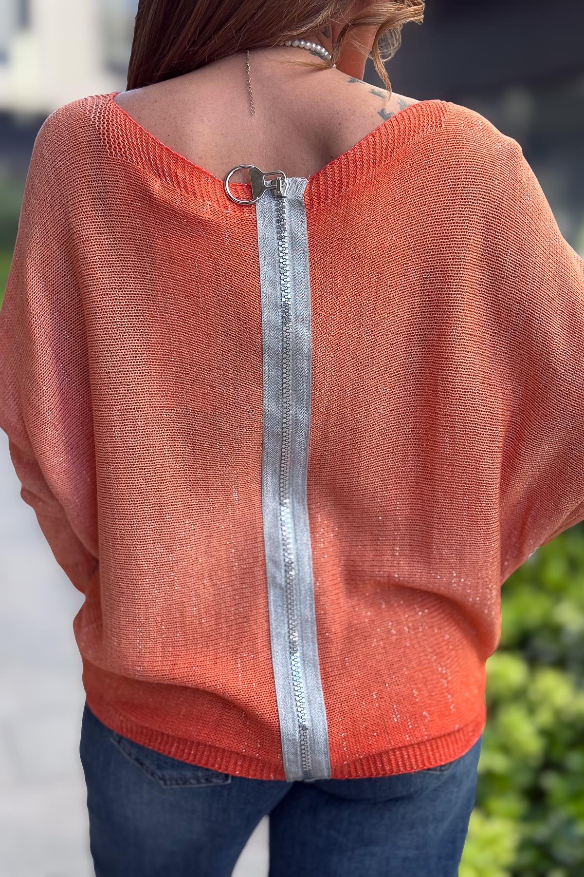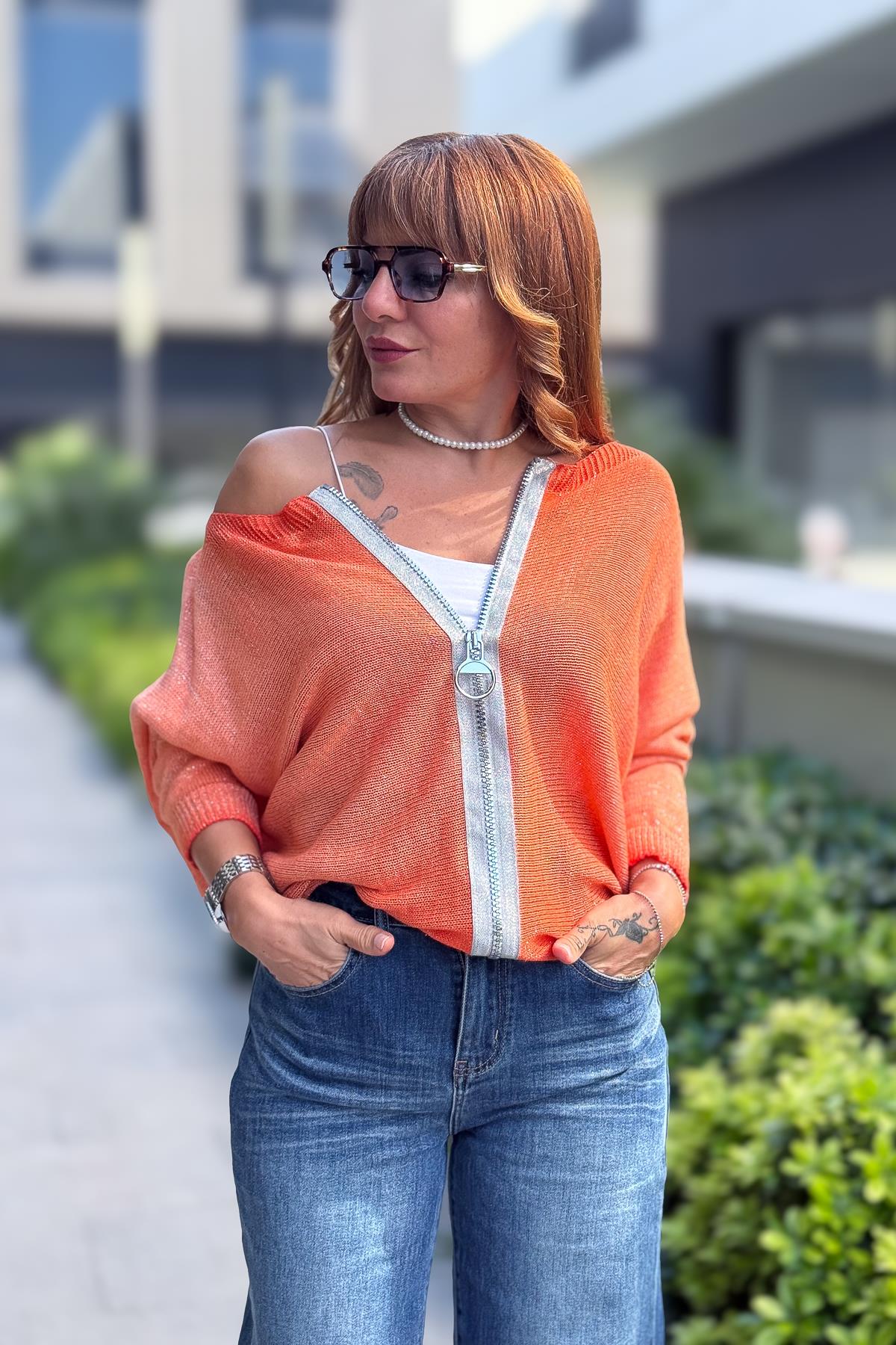 Sırtı Fermuar Detaylı Kayık Yaka Simli Triko Turuncu Renk