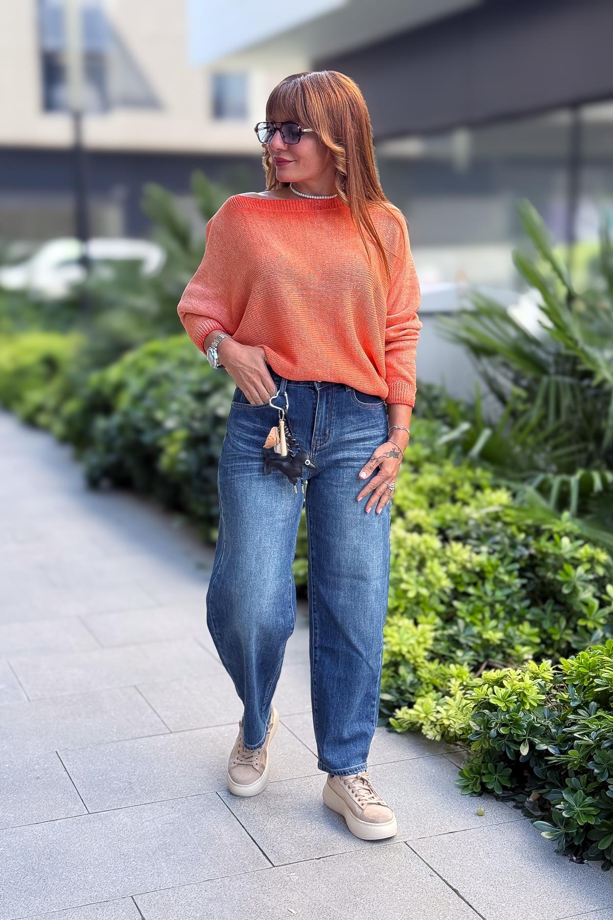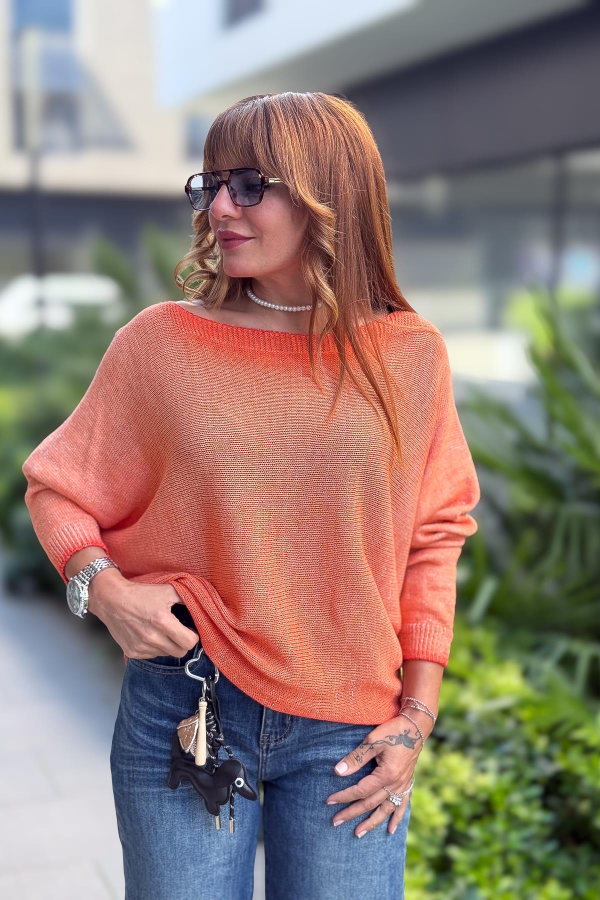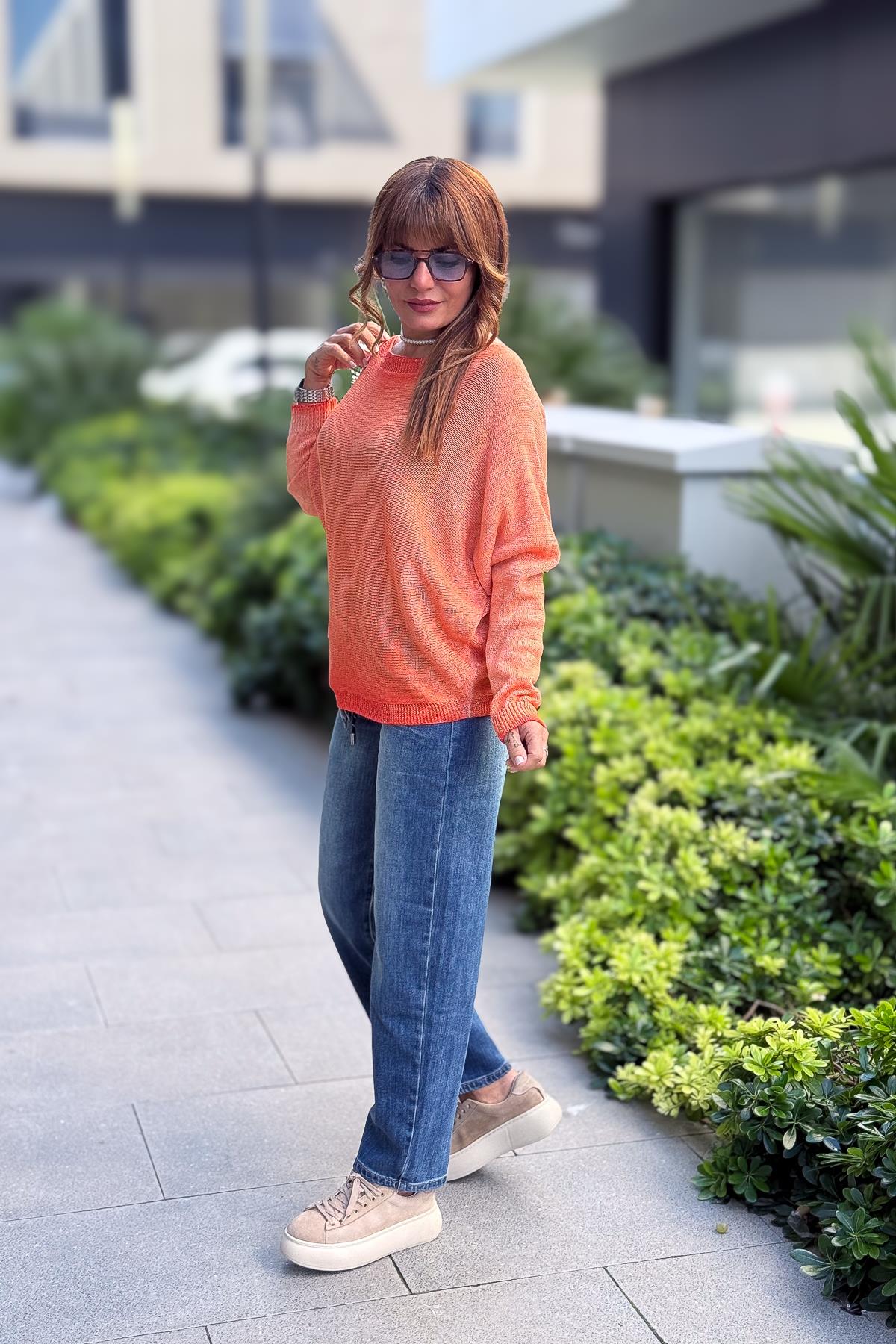 Sırtı Fermuar Detaylı Kayık Yaka Simli Triko Turuncu Renk