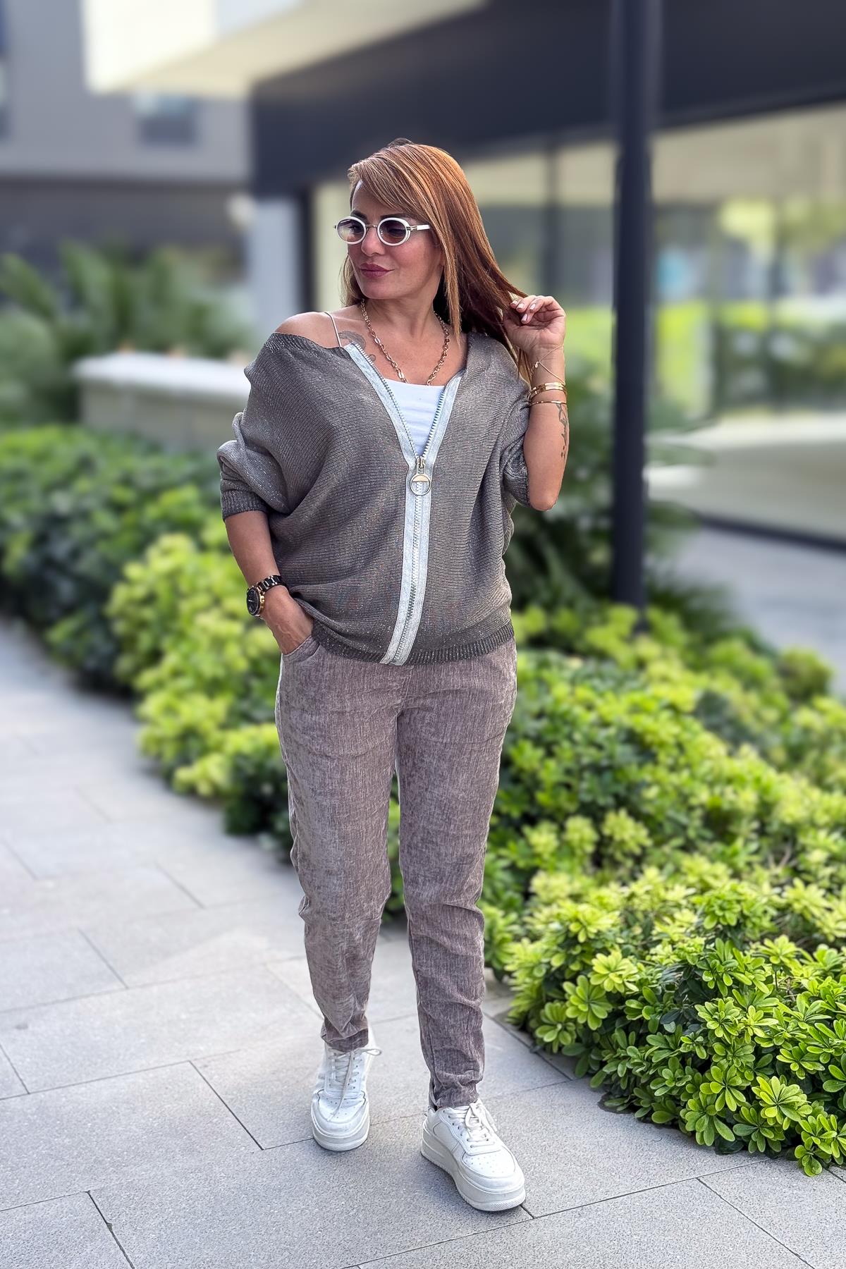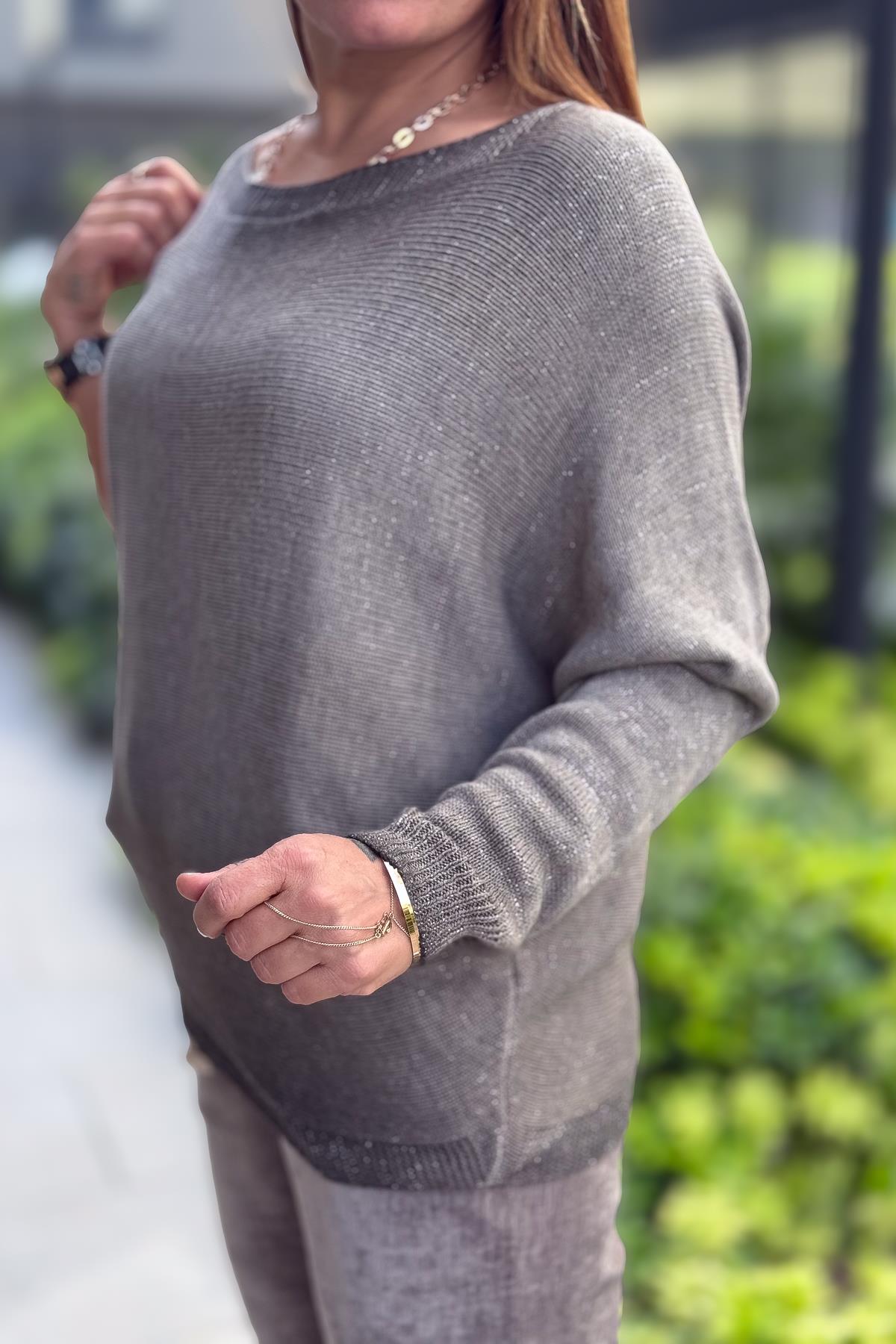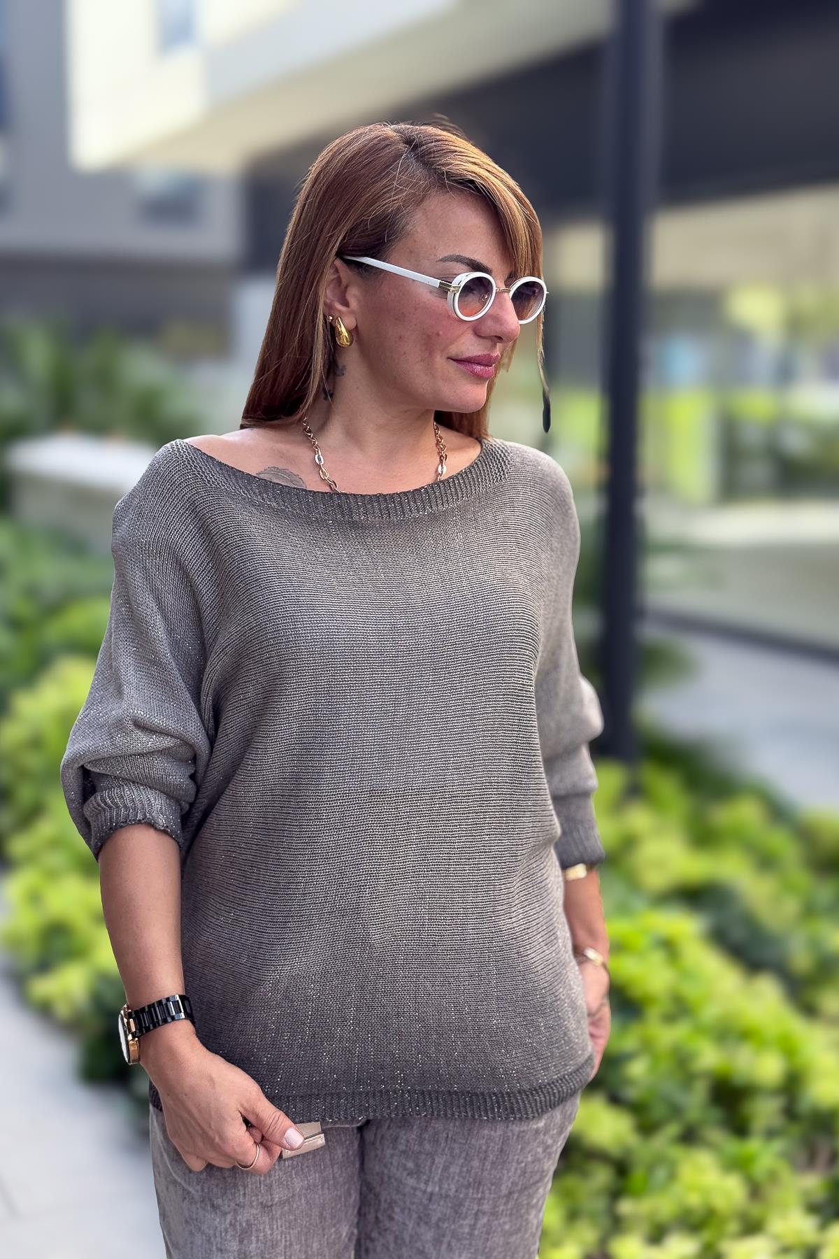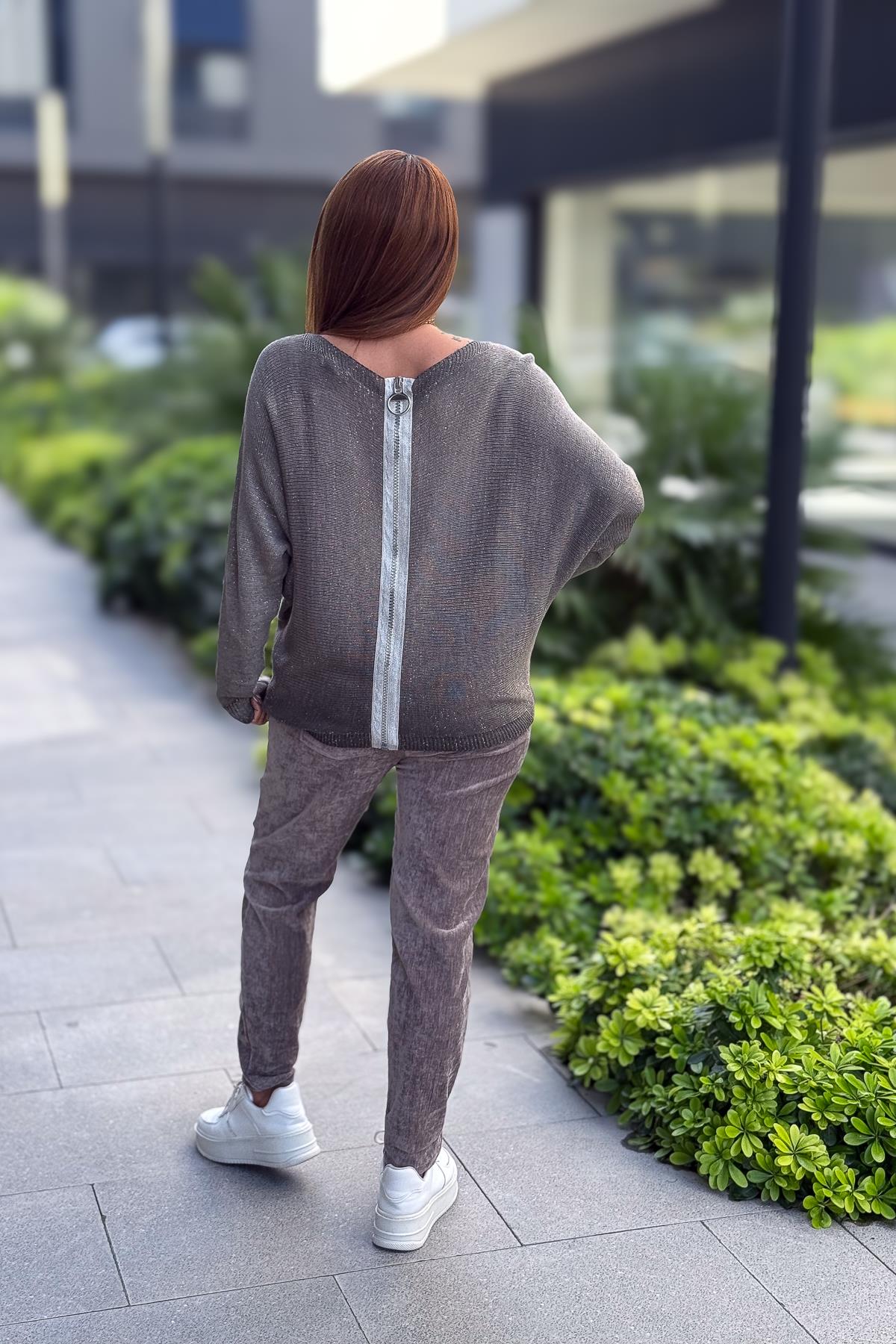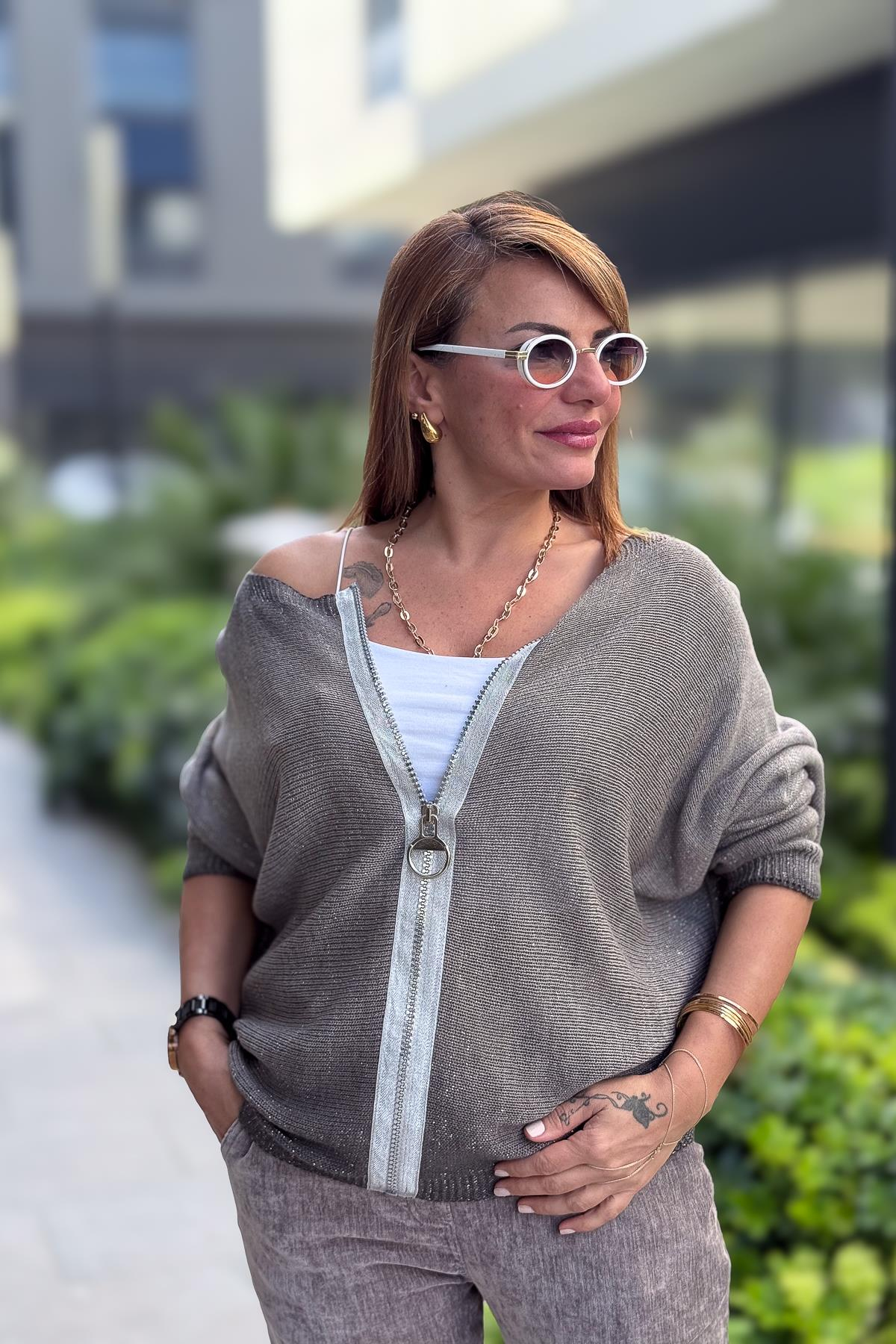 Sırtı Fermuar Detaylı Kayık Yaka Simli Triko Vizon Renk
