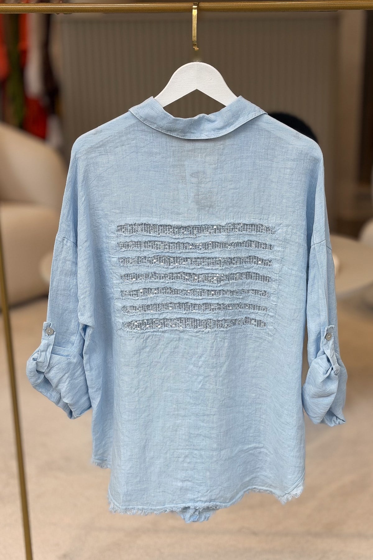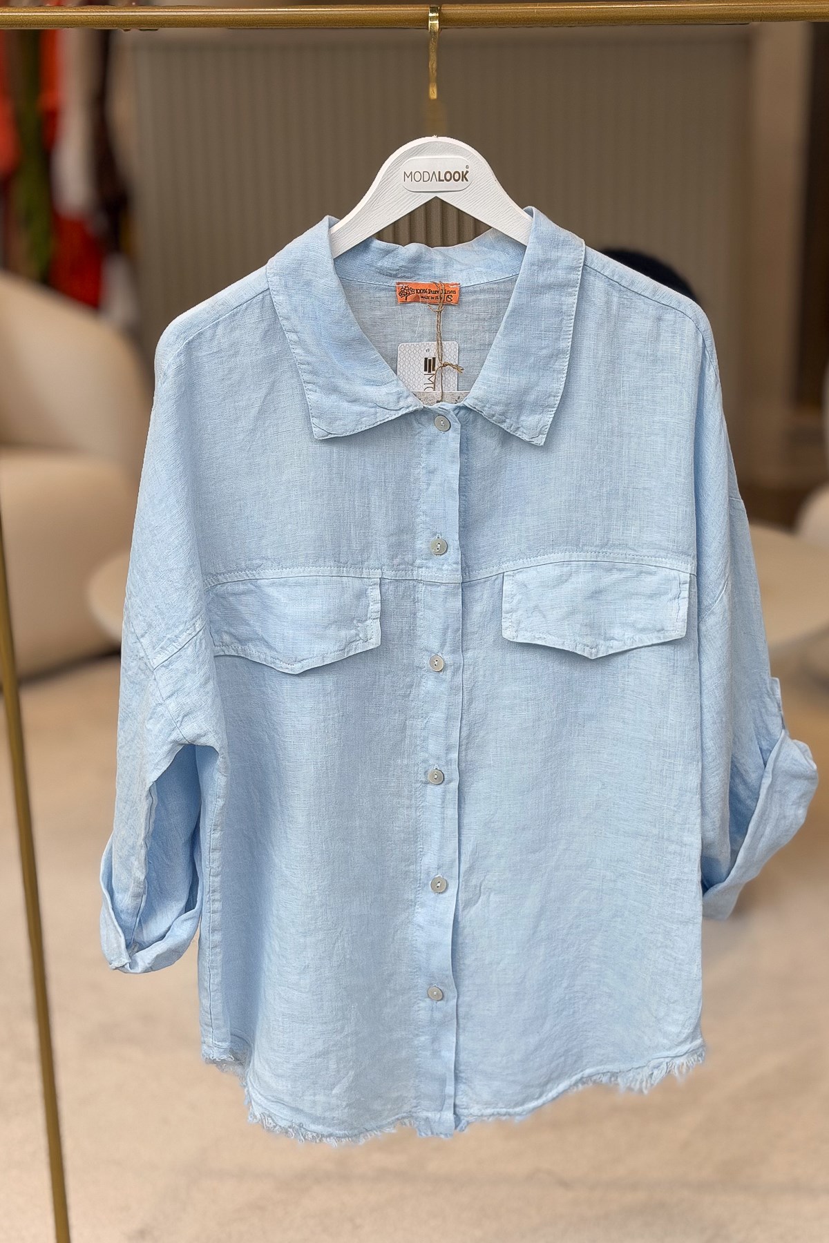 Sırtı Şerit Pullu Çift Cep Görünümlü Keten Gömlek Bebe Mavi Renk