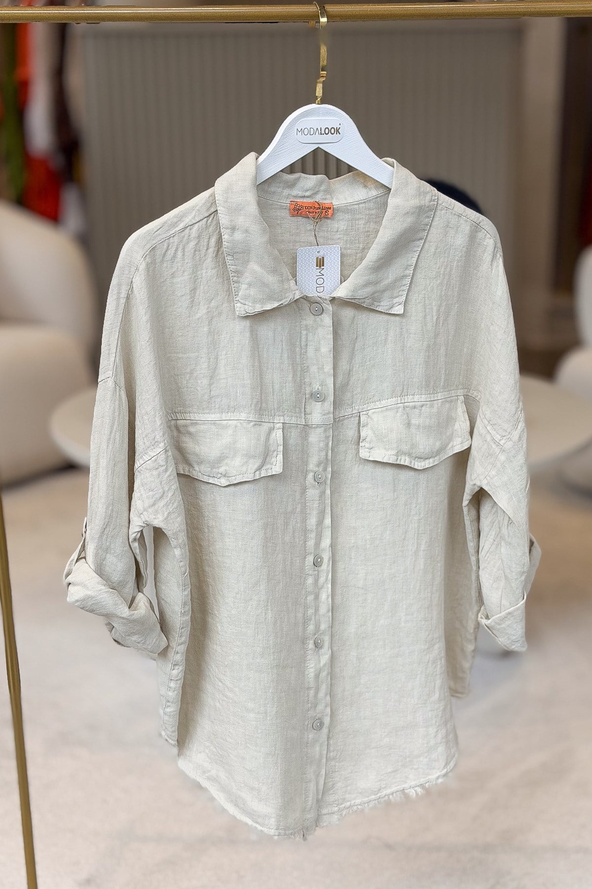 Sırtı Şerit Pullu Çift Cep Görünümlü Keten Gömlek Bej Renk