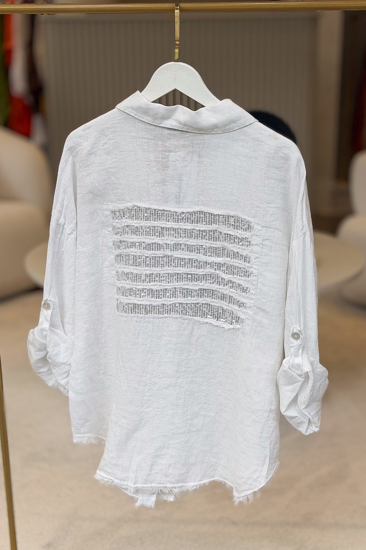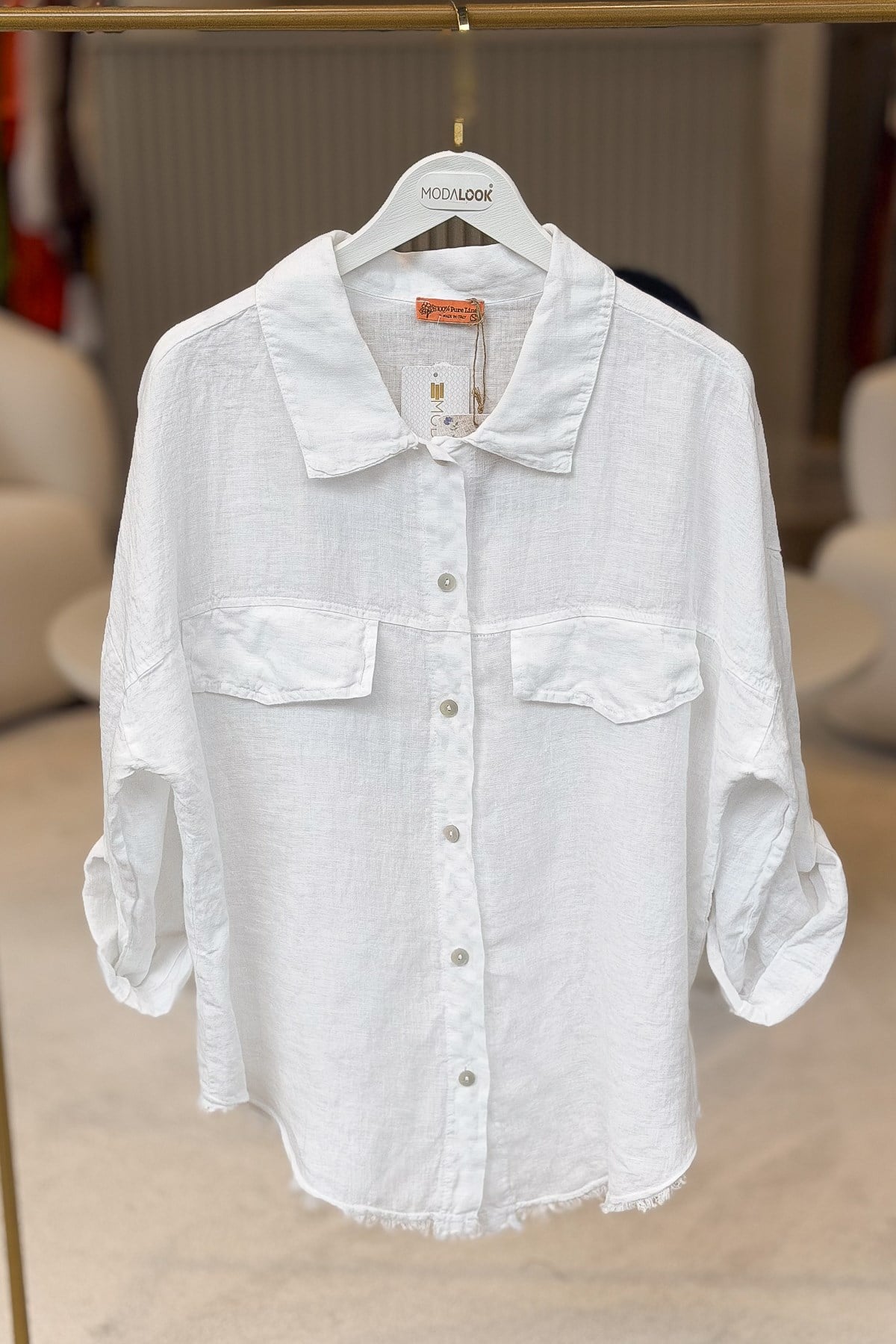 Sırtı Şerit Pullu Çift Cep Görünümlü Keten Gömlek Beyaz Renk