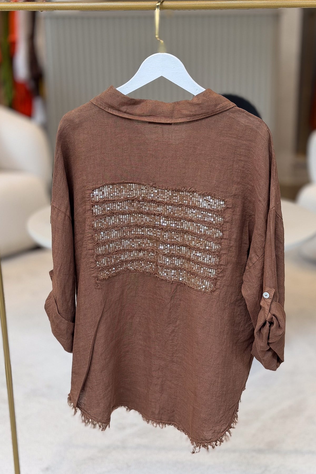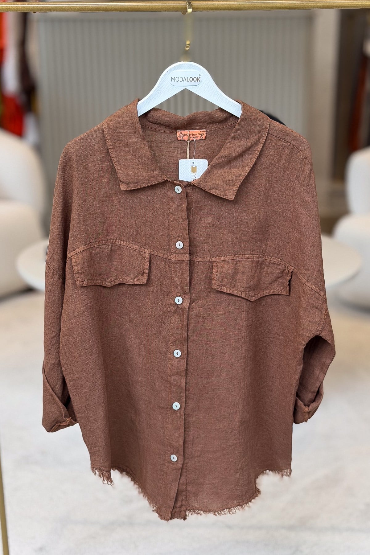 Sırtı Şerit Pullu Çift Cep Görünümlü Keten Gömlek Kahverengi Renk