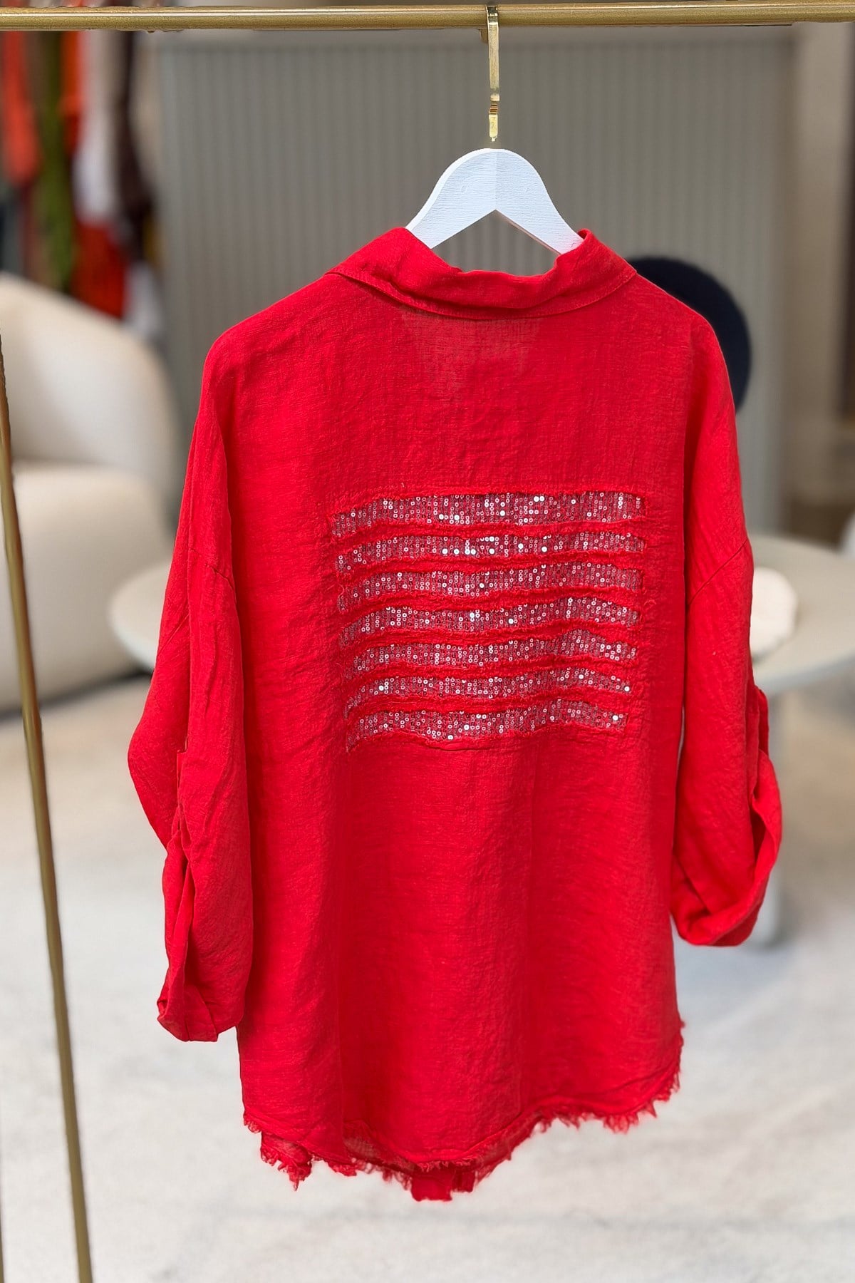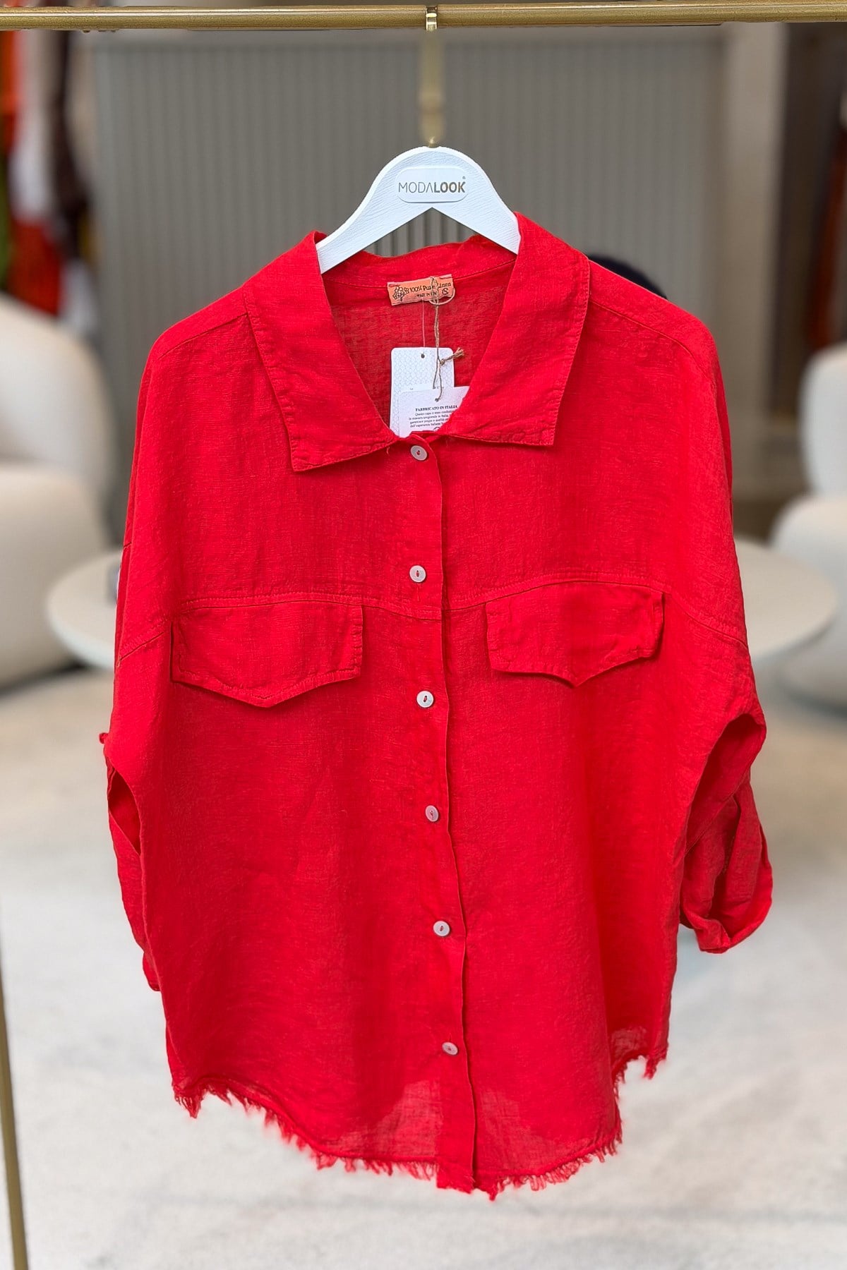 Sırtı Şerit Pullu Çift Cep Görünümlü Keten Gömlek Kırmızı Renk