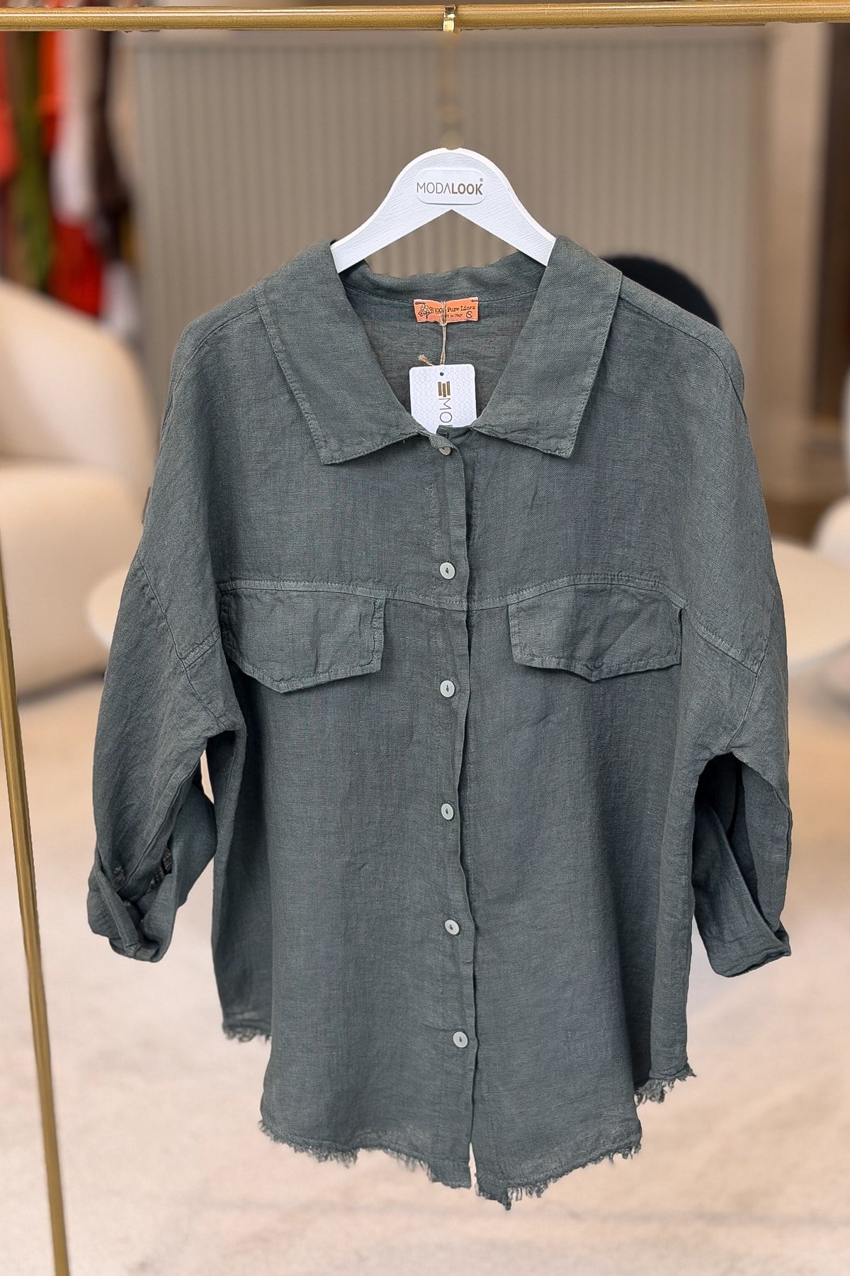 Sırtı Şerit Pullu Çift Cep Görünümlü Keten Gömlek Koyu Haki Renk