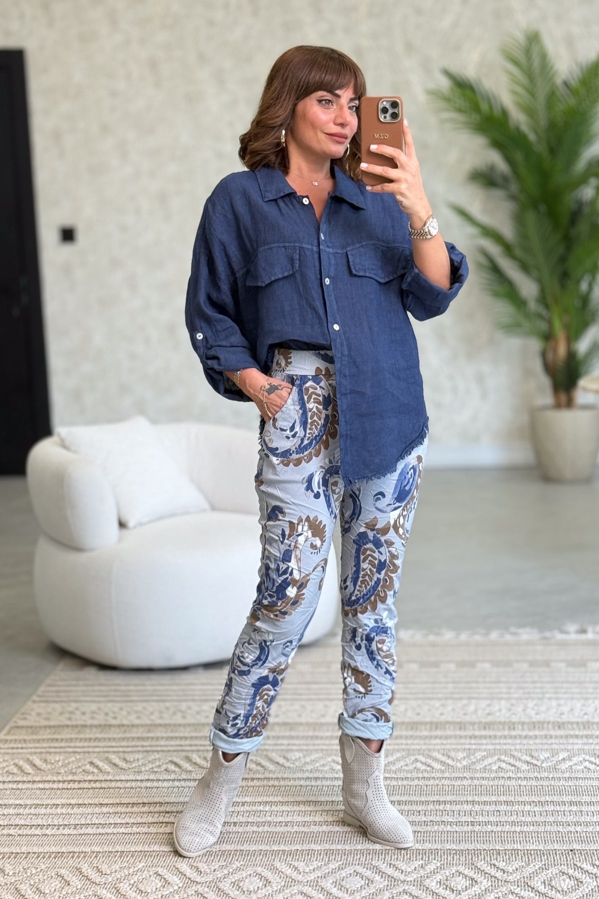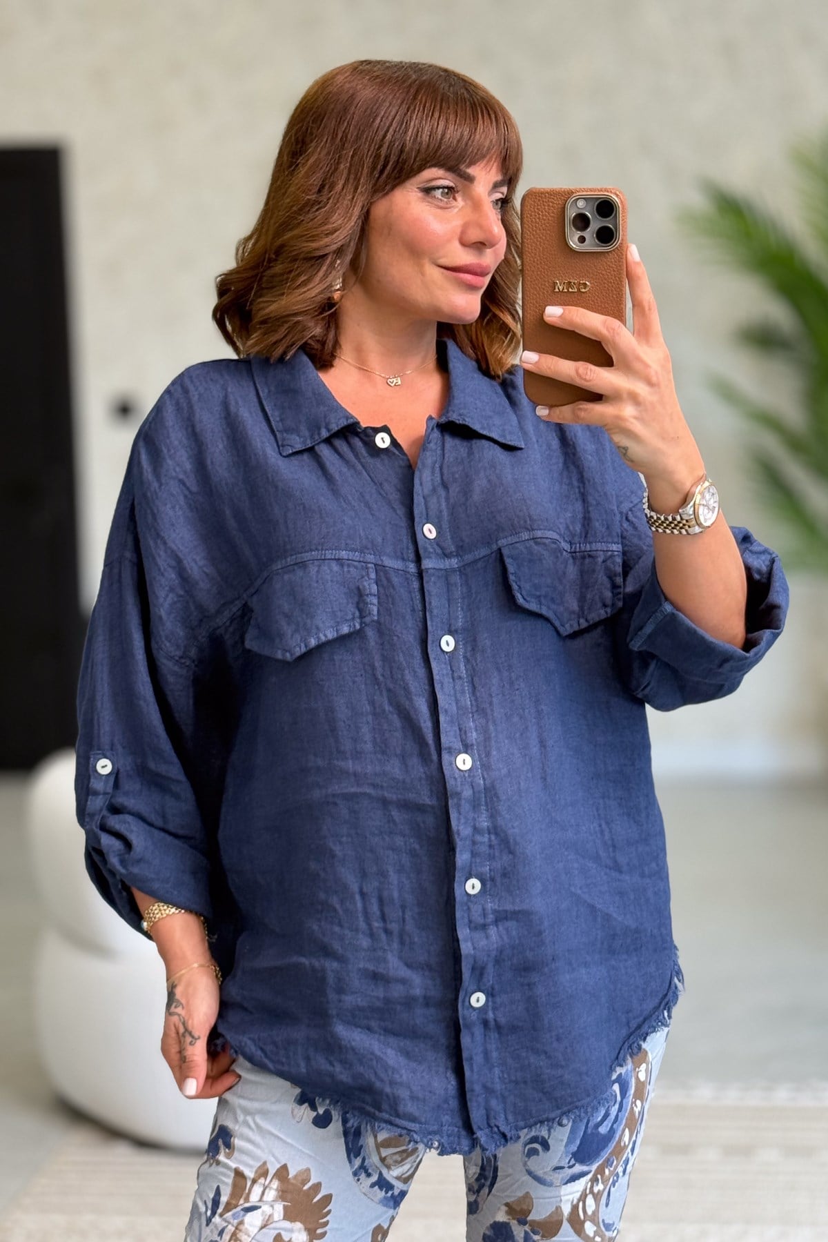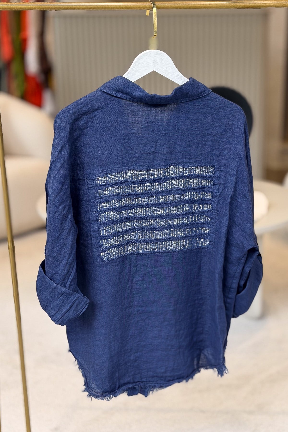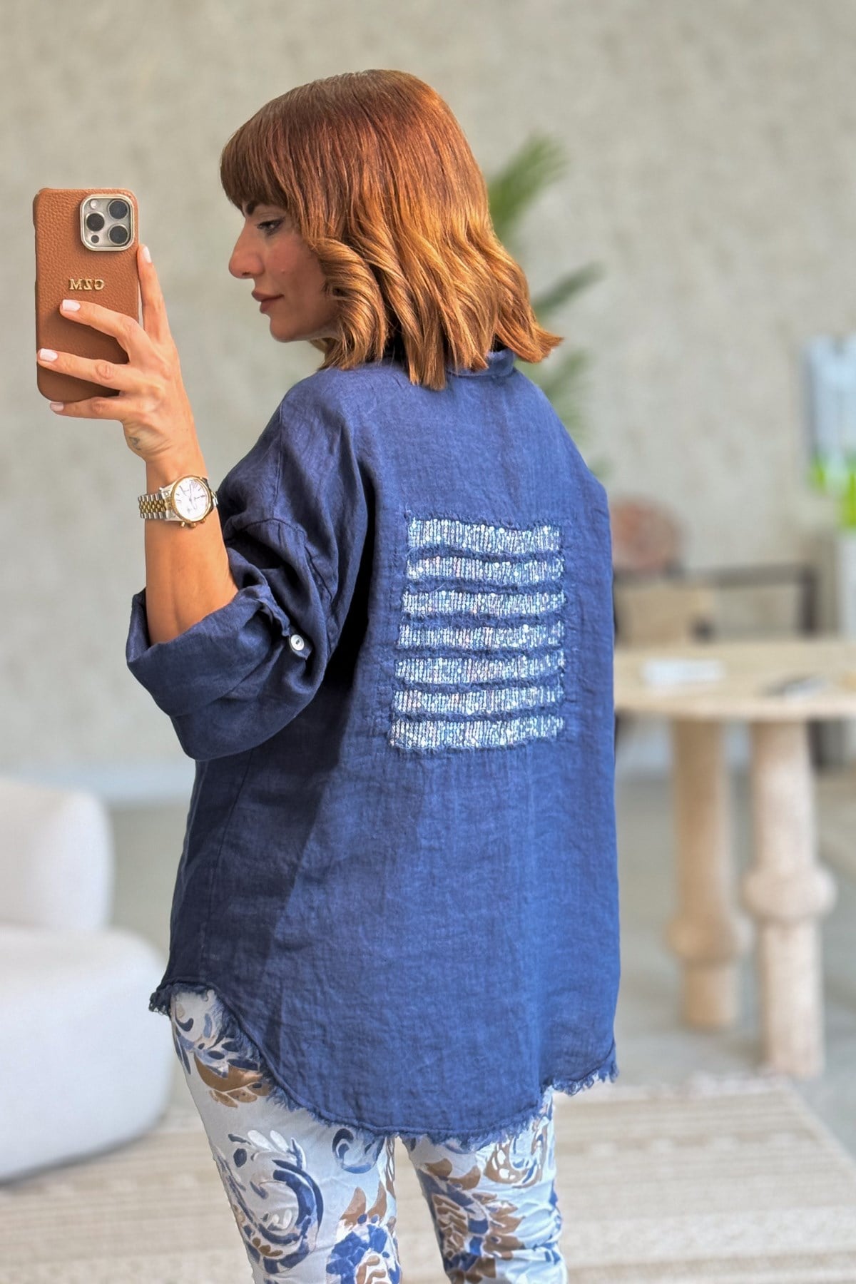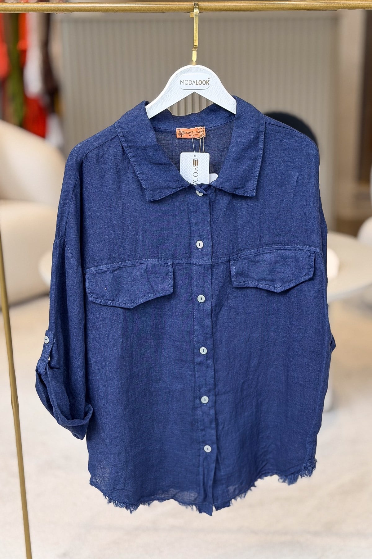 Sırtı Şerit Pullu Çift Cep Görünümlü Keten Gömlek Lacivert Renk
