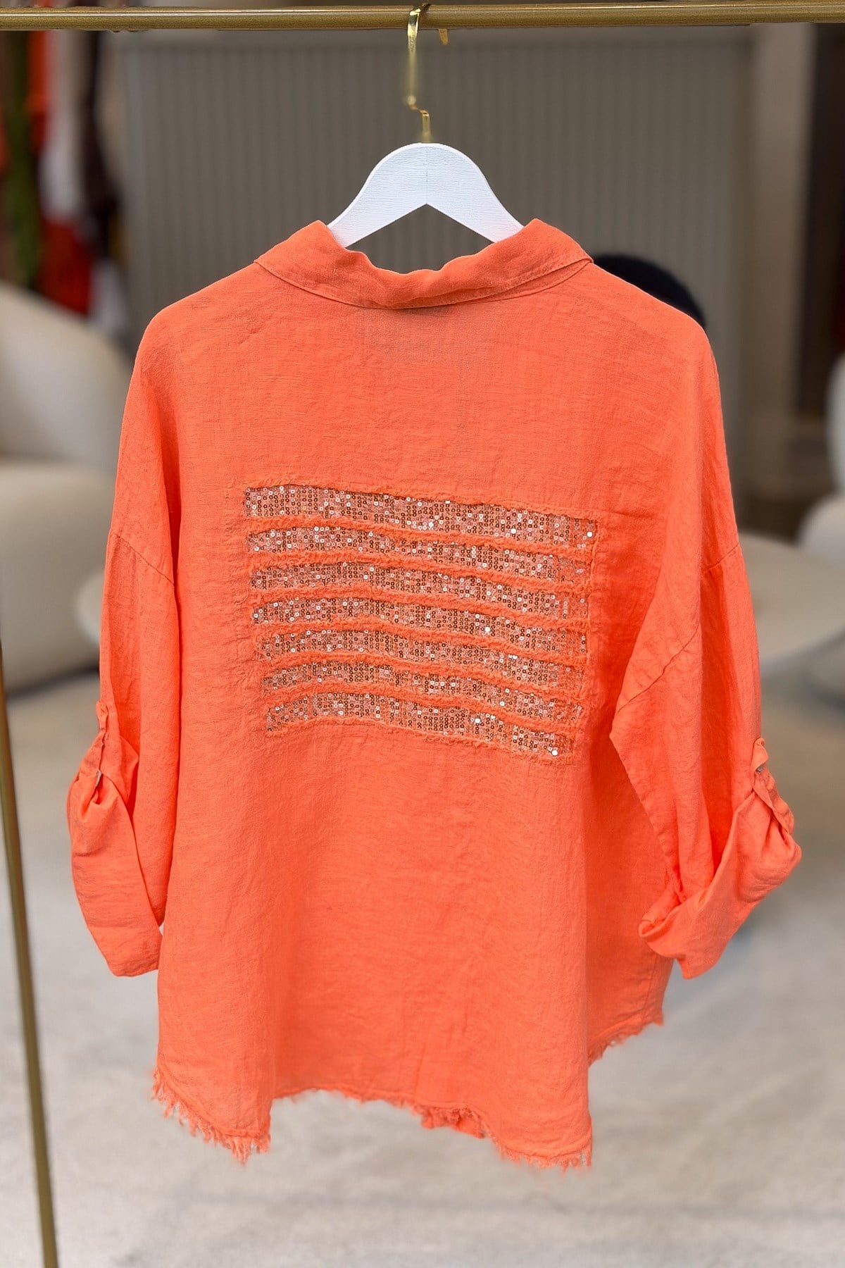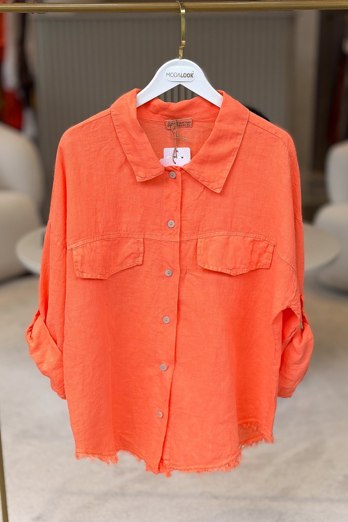 Sırtı Şerit Pullu Çift Cep Görünümlü Keten Gömlek Mercan Renk