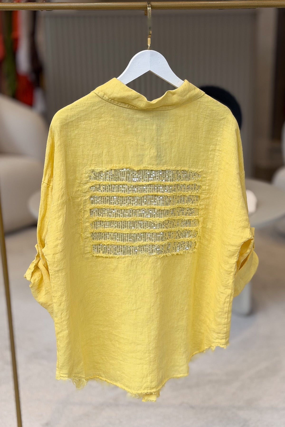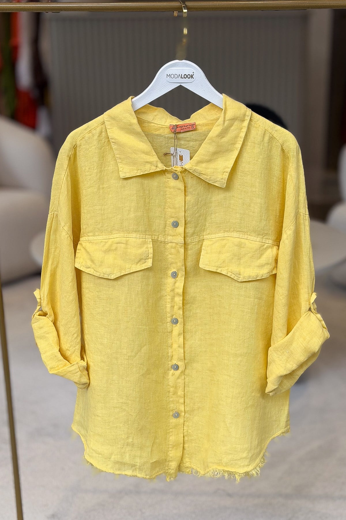 Sırtı Şerit Pullu Çift Cep Görünümlü Keten Gömlek Sarı Renk