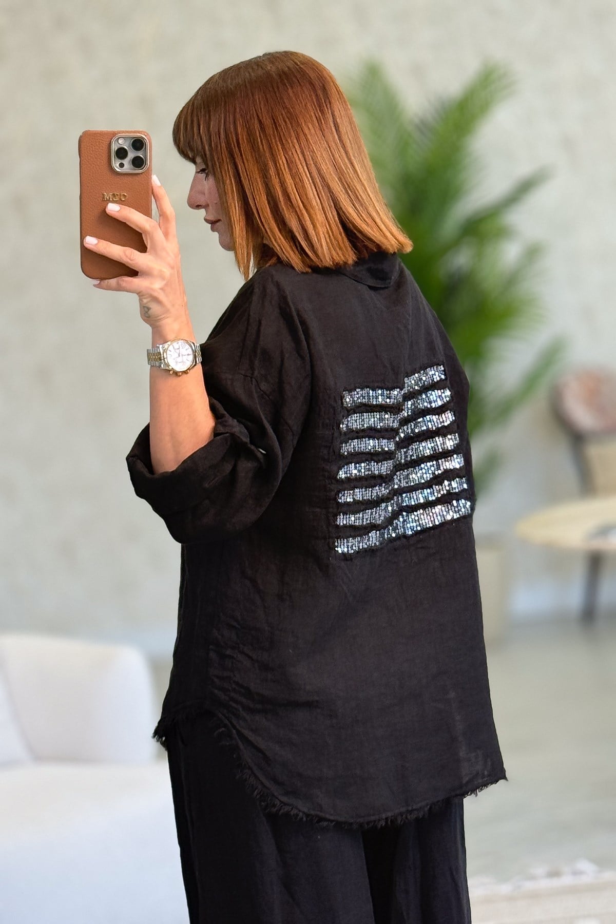 Sırtı Şerit Pullu Çift Cep Görünümlü Keten Gömlek Siyah Renk