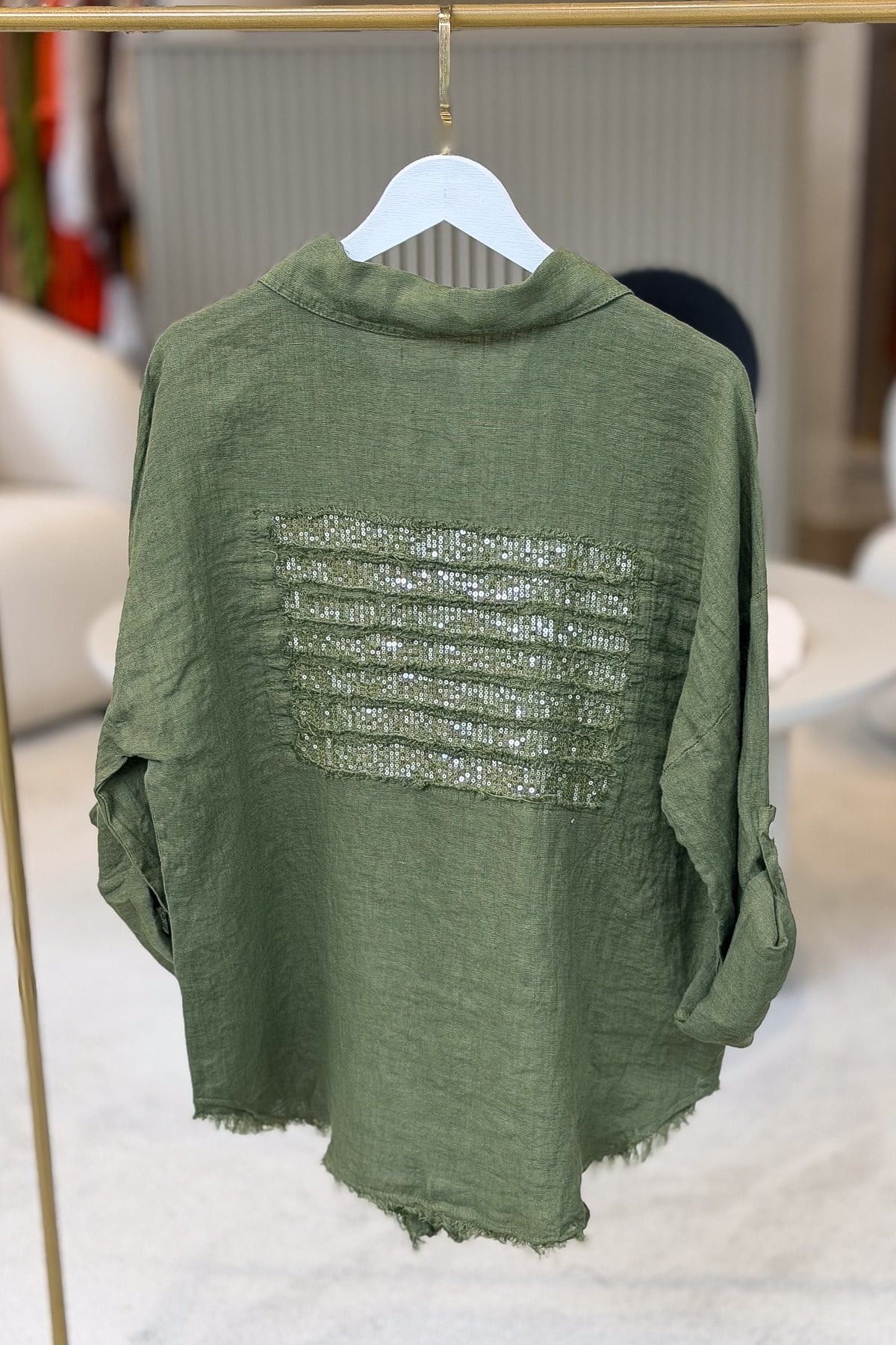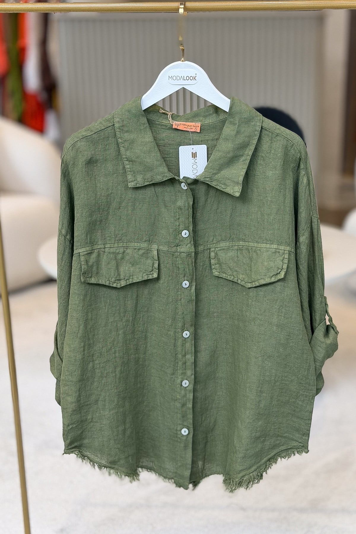 Sırtı Şerit Pullu Çift Cep Görünümlü Keten Gömlek Yağ Yeşili Renk