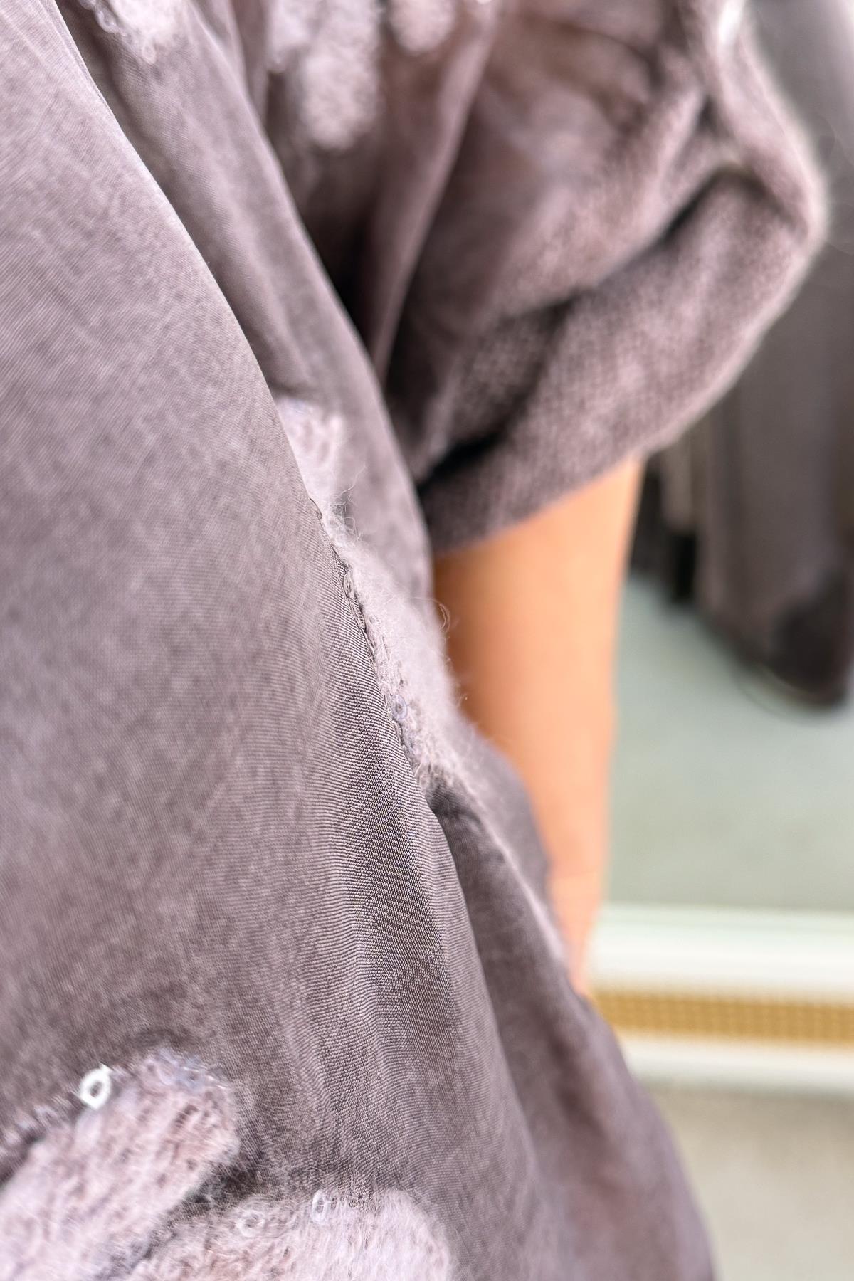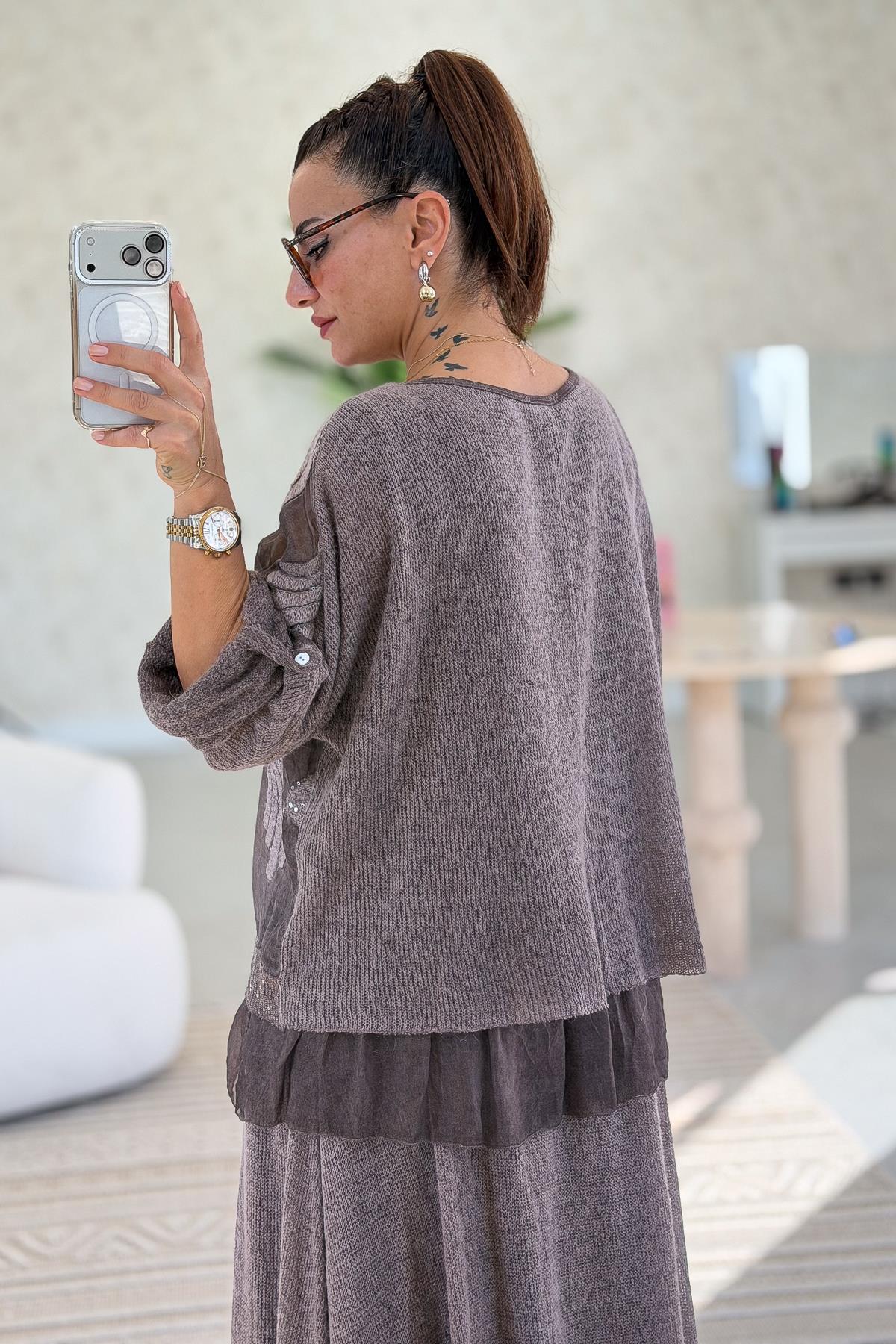 Sırtı Ve Kolları Triko Tül Ve Pul Detay İşlemeli Bluz Kahverengi Renk