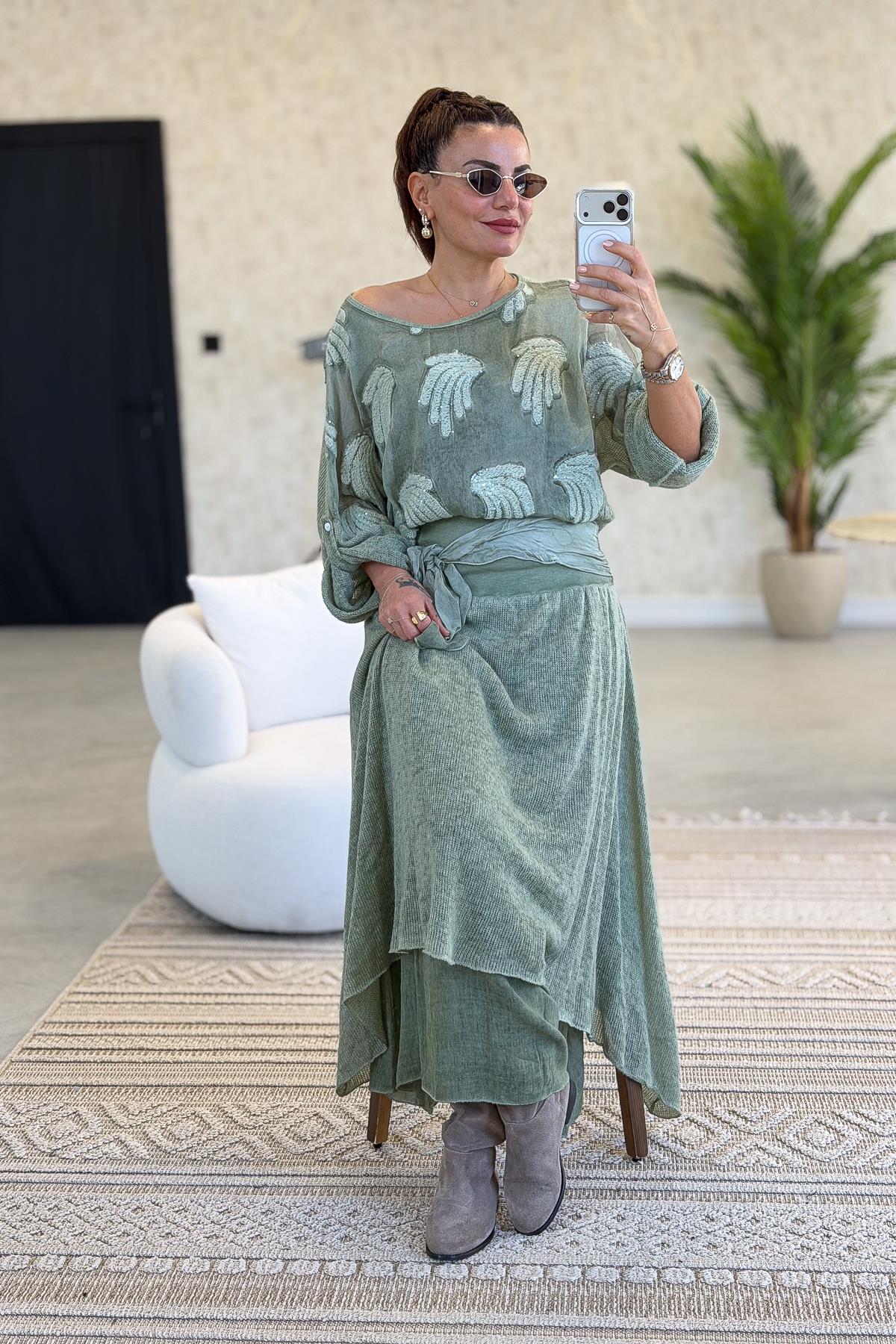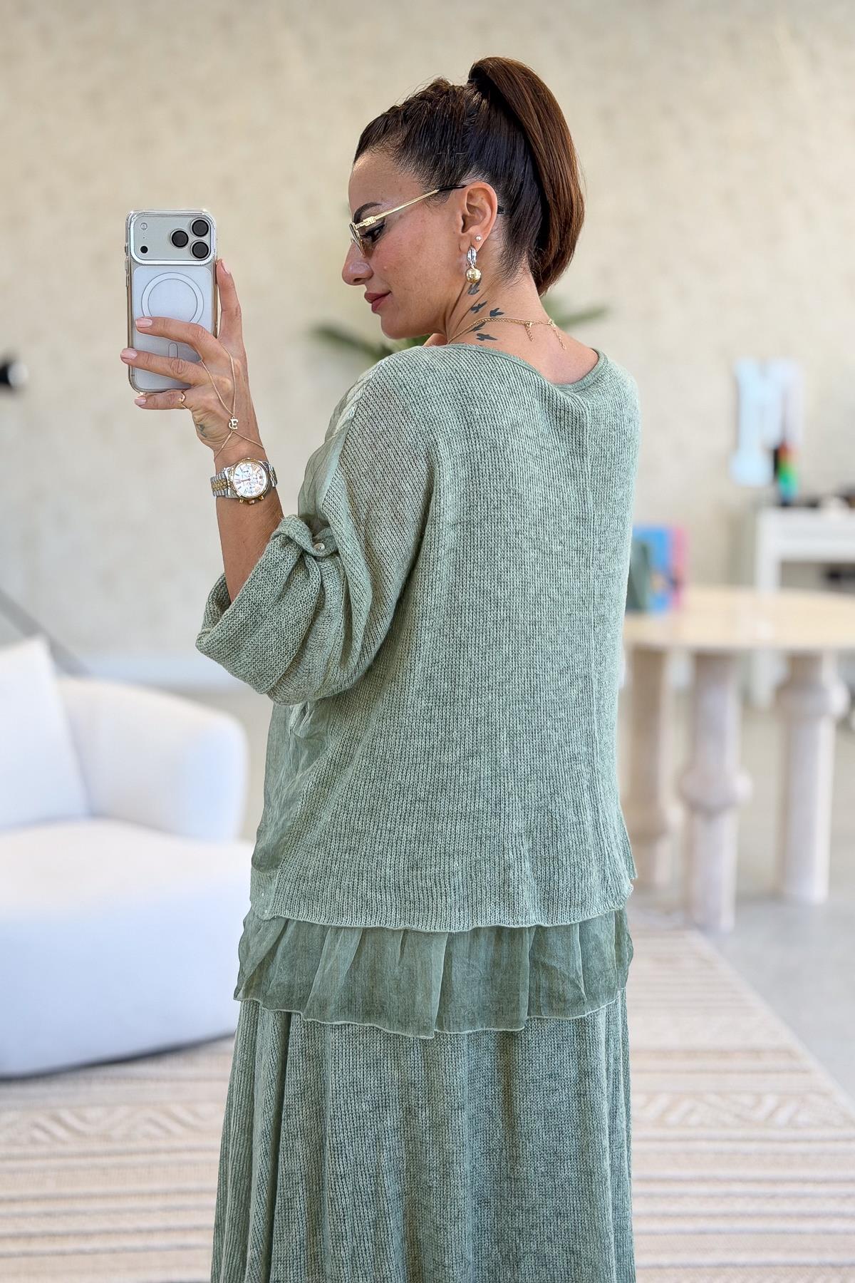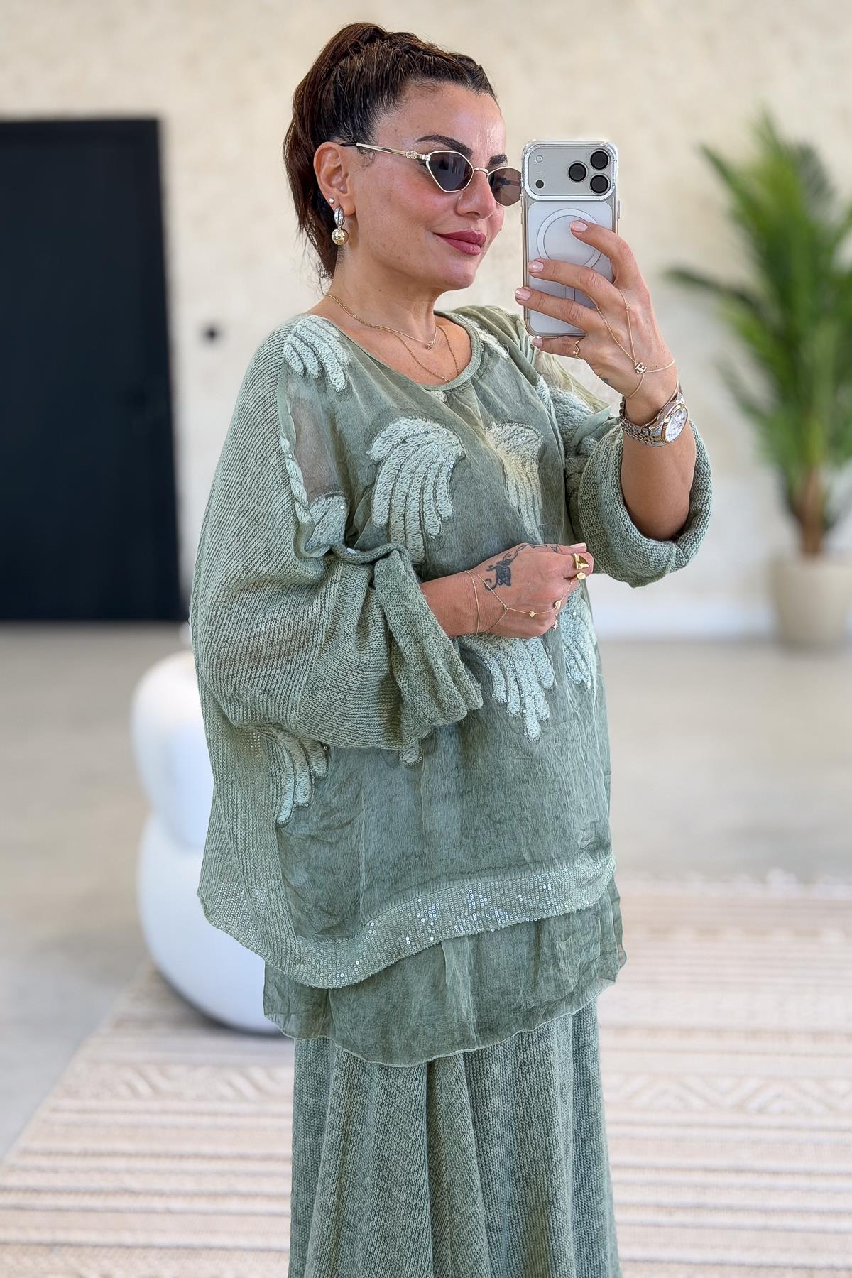 Sırtı Ve Kolları Triko Tül Ve Pul Detay İşlemeli Bluz Su Yeşili Renk