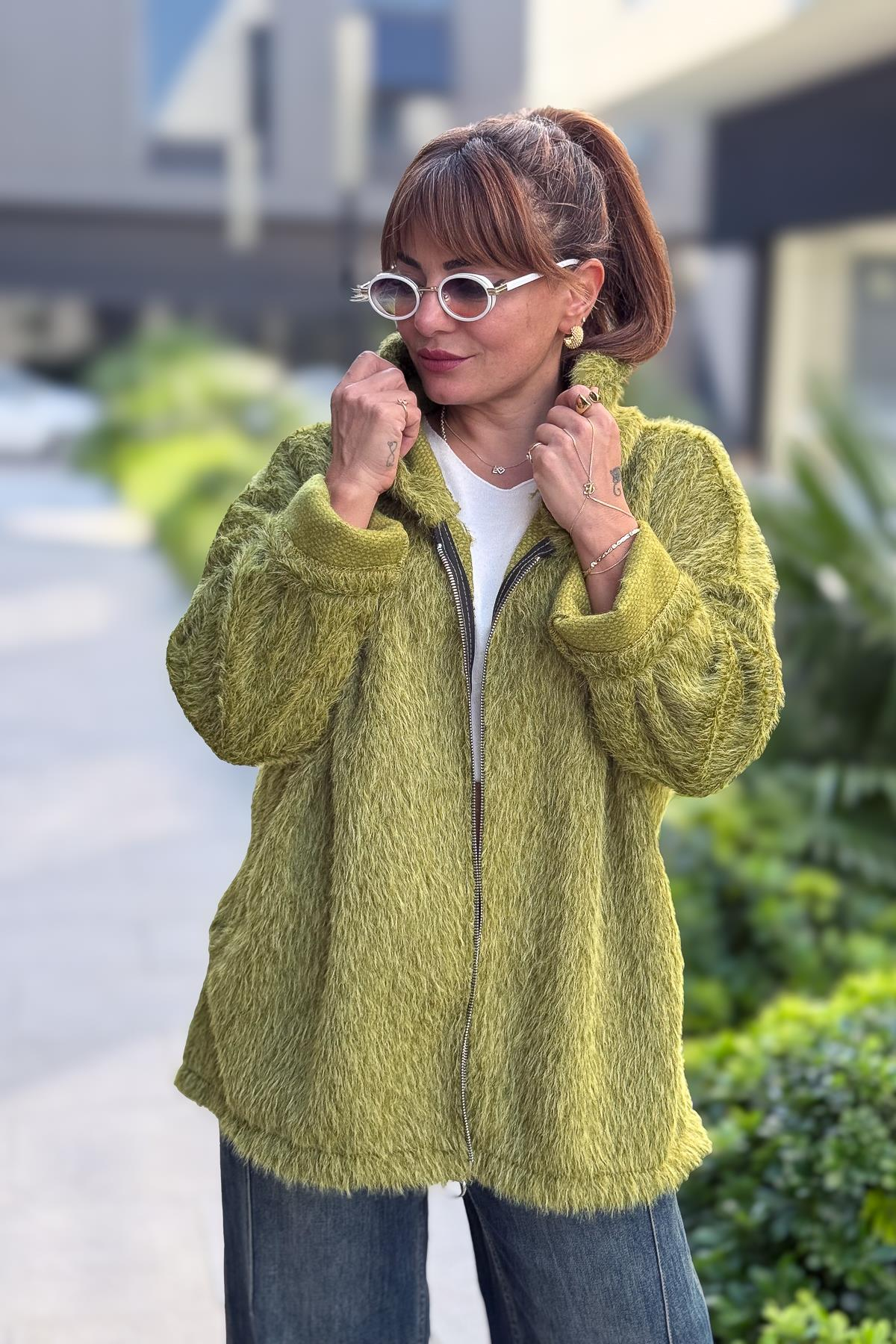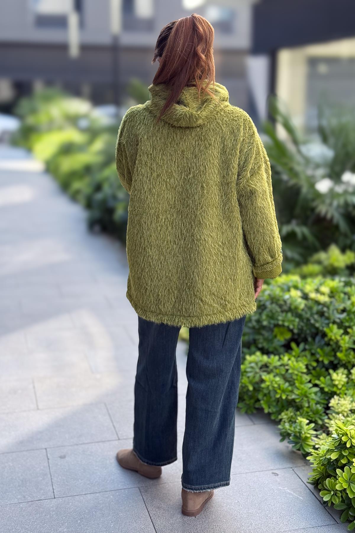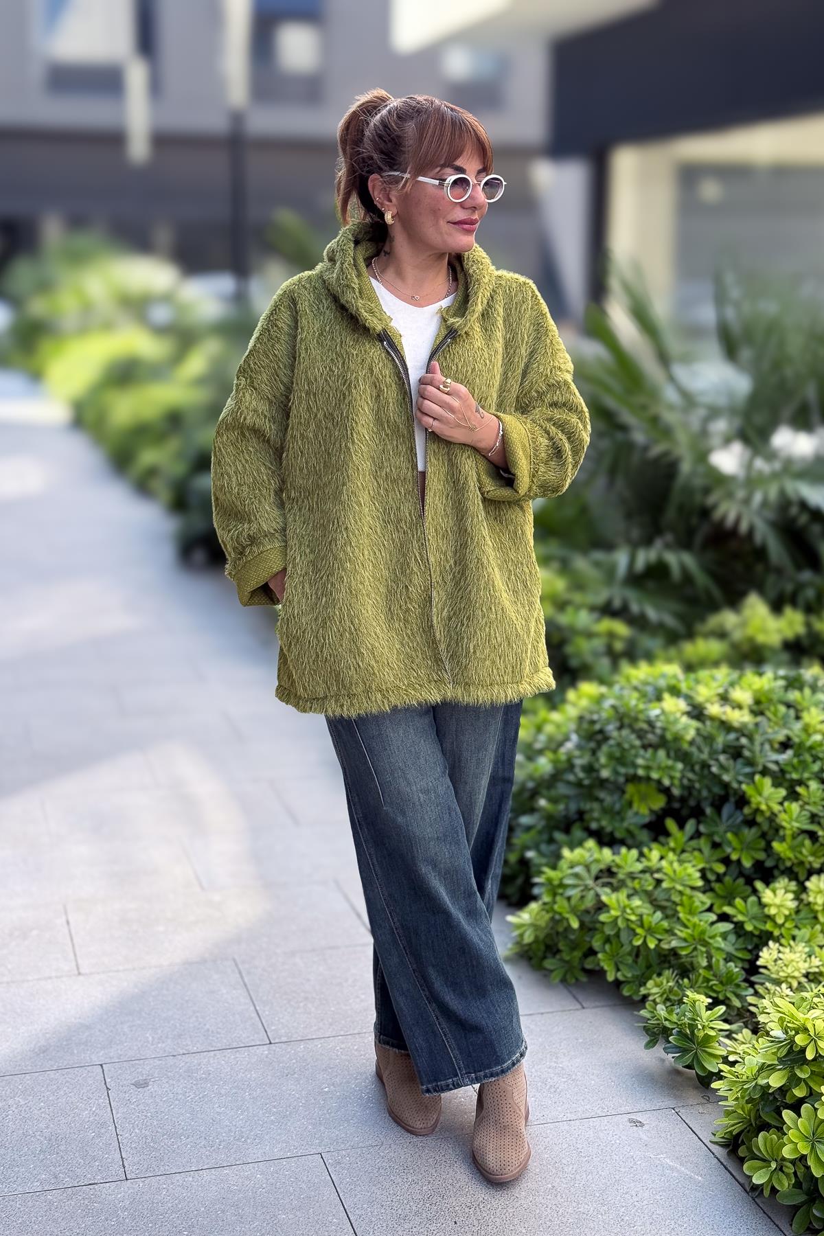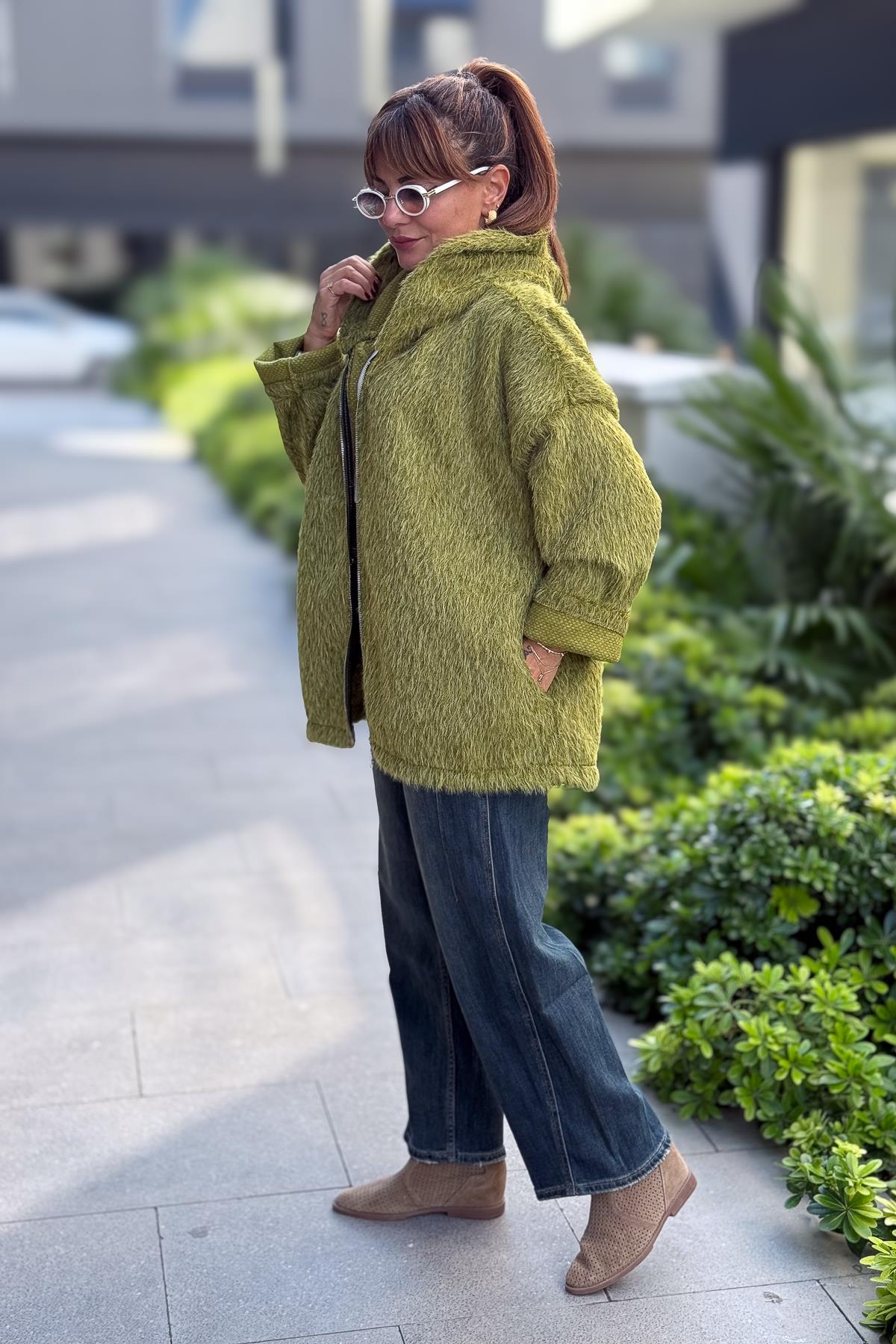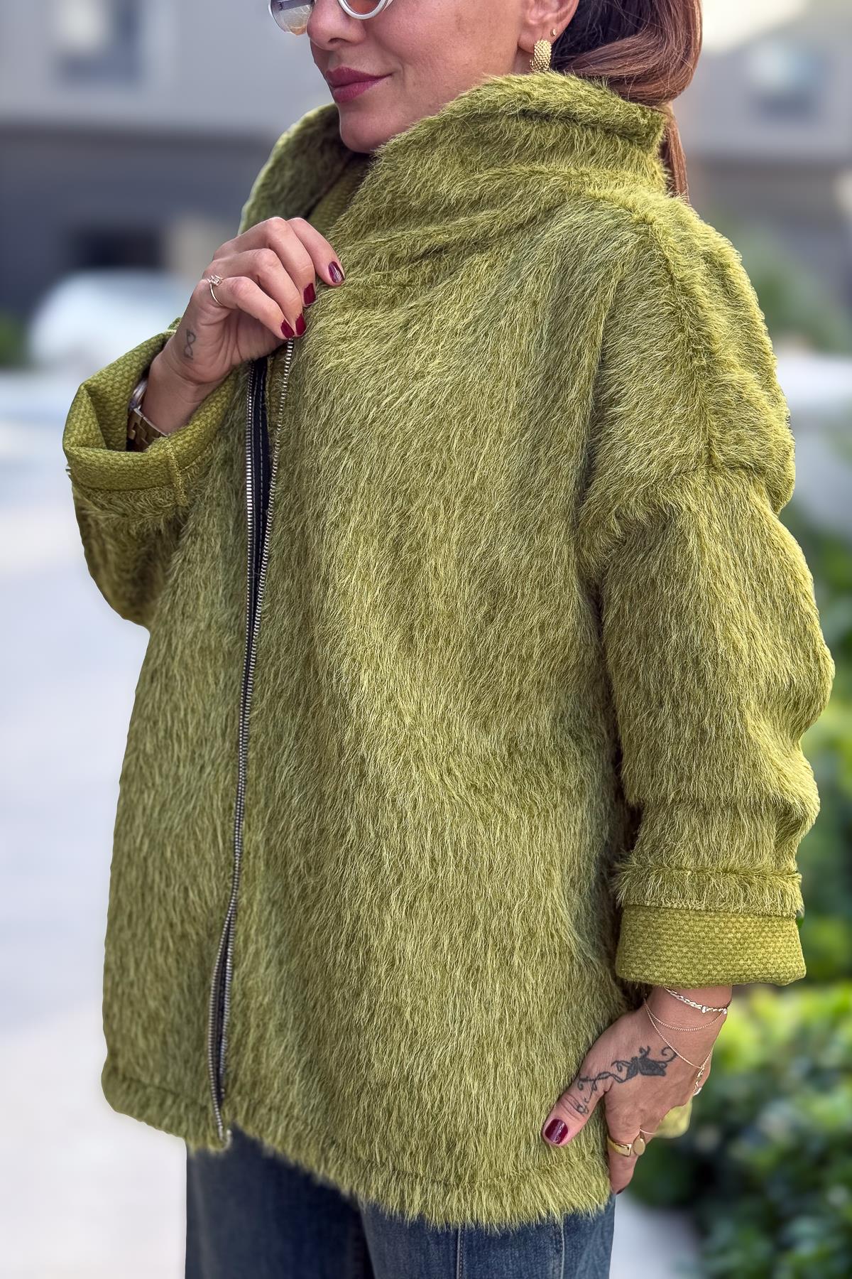 Tüylü Fermuarlı Ceket Fıstık Yeşil Renk