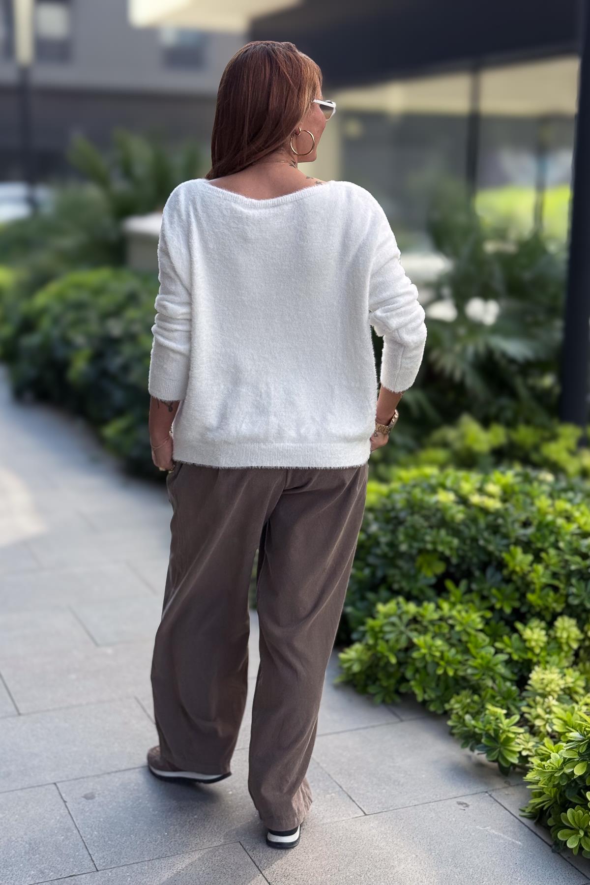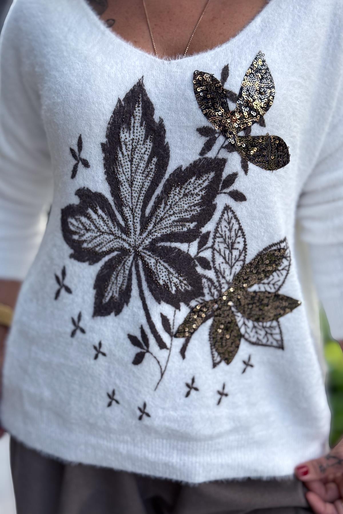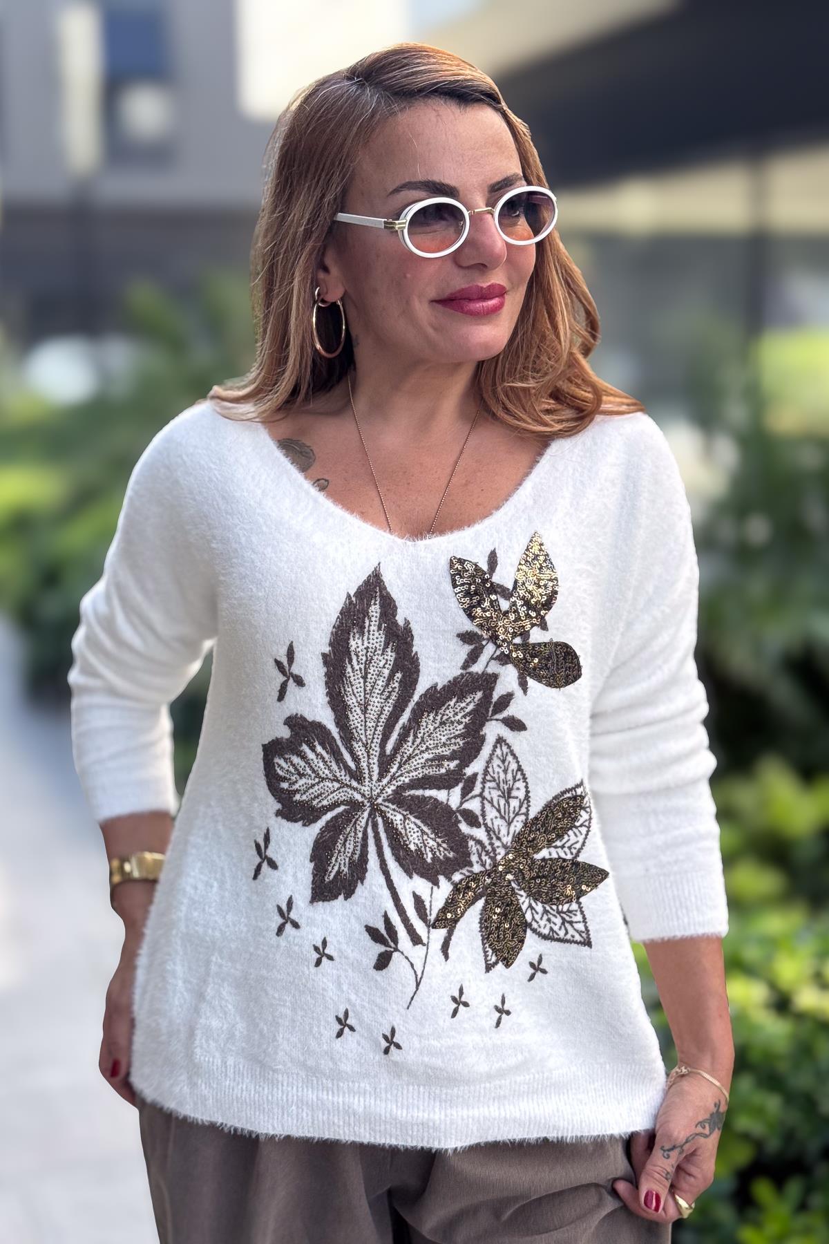 Yaprak Desenli V Yaka Angora Kazak Beyaz Renk