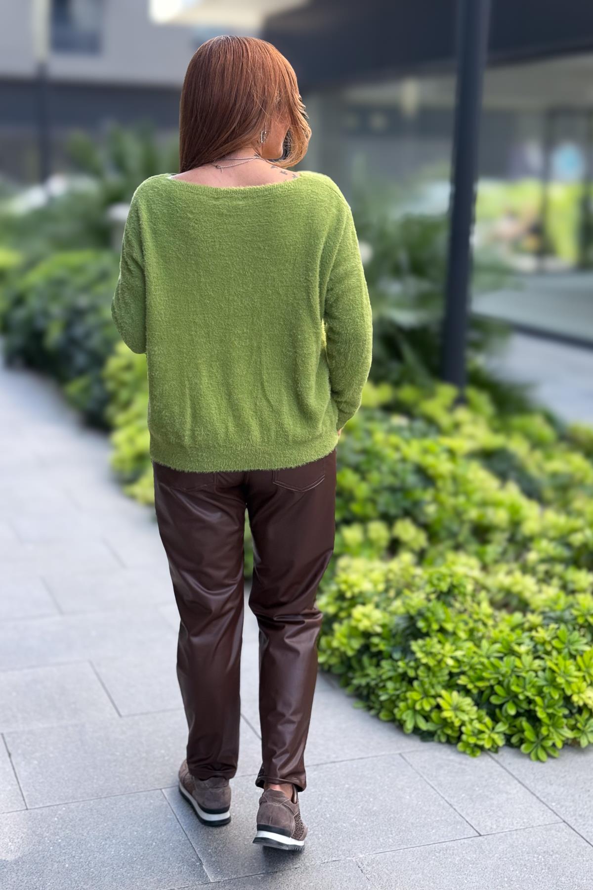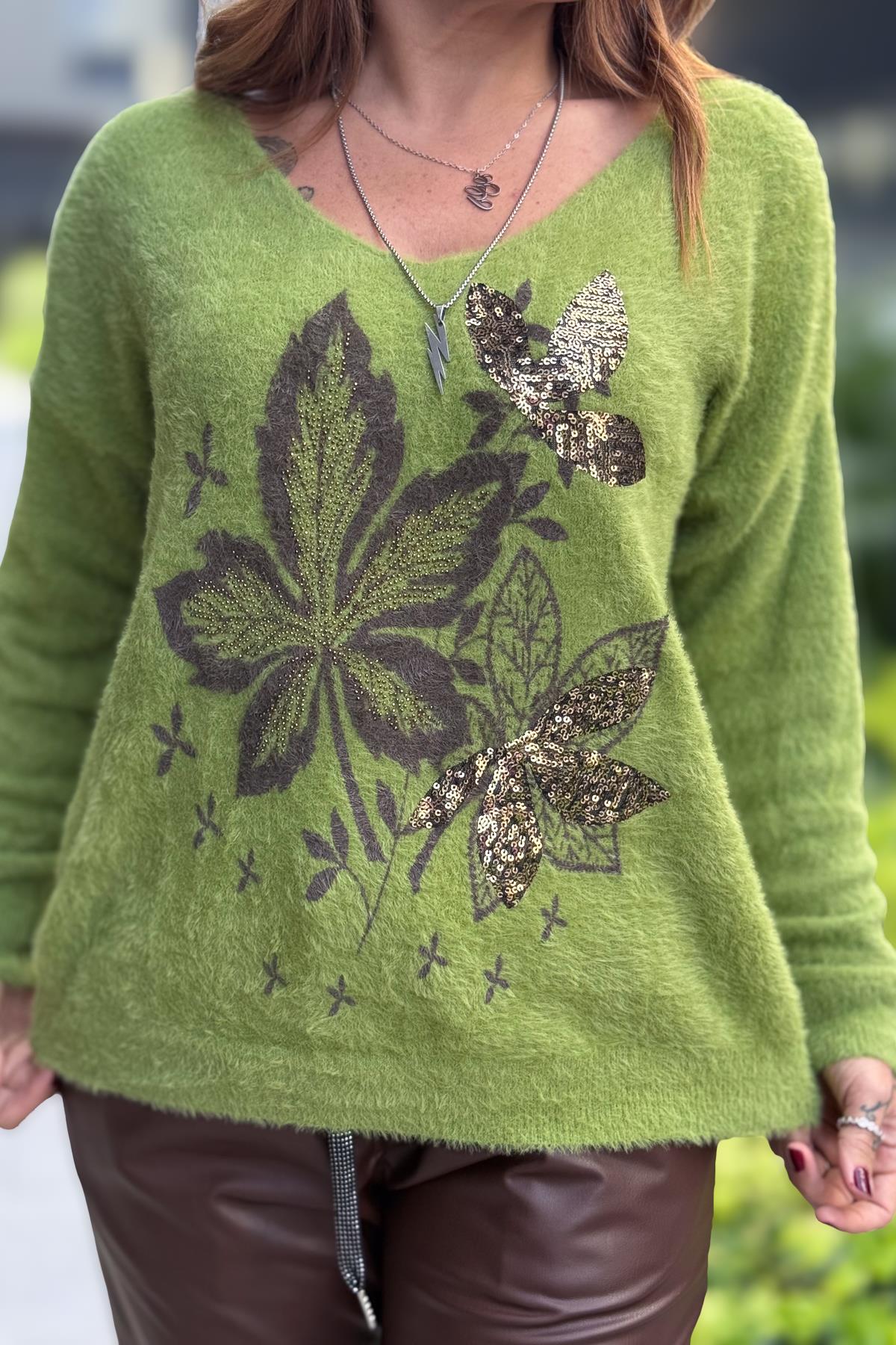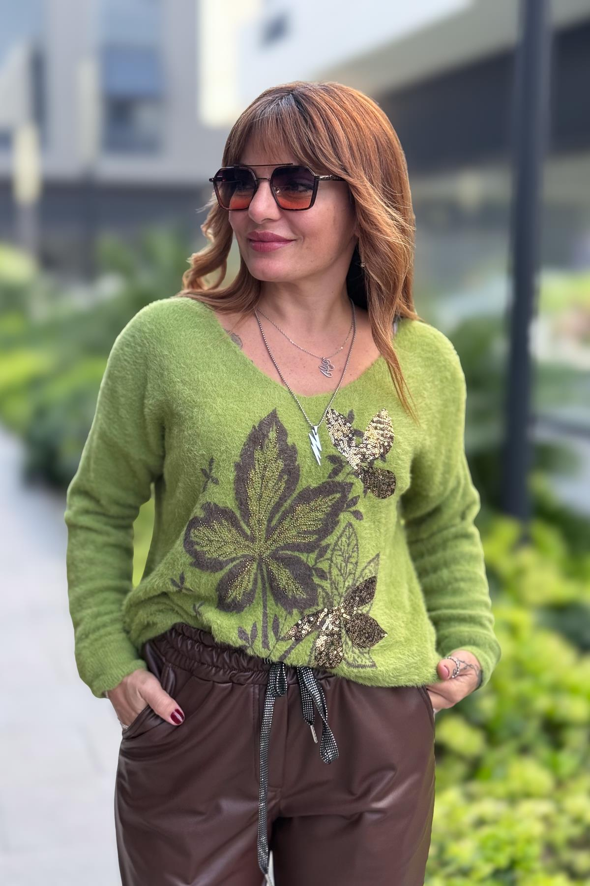 Yaprak Desenli V Yaka Angora Kazak Fıstık Yeşil Renk