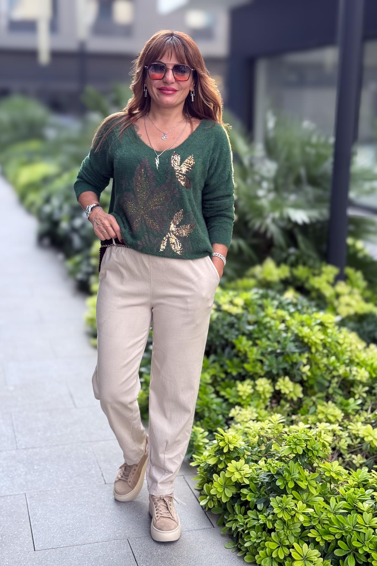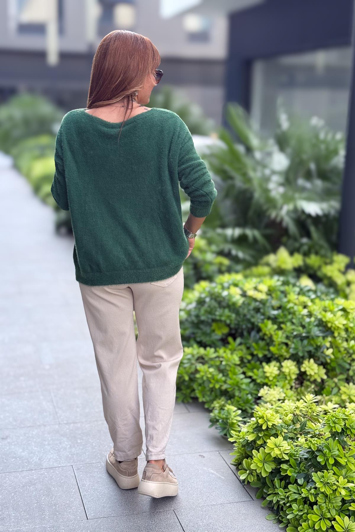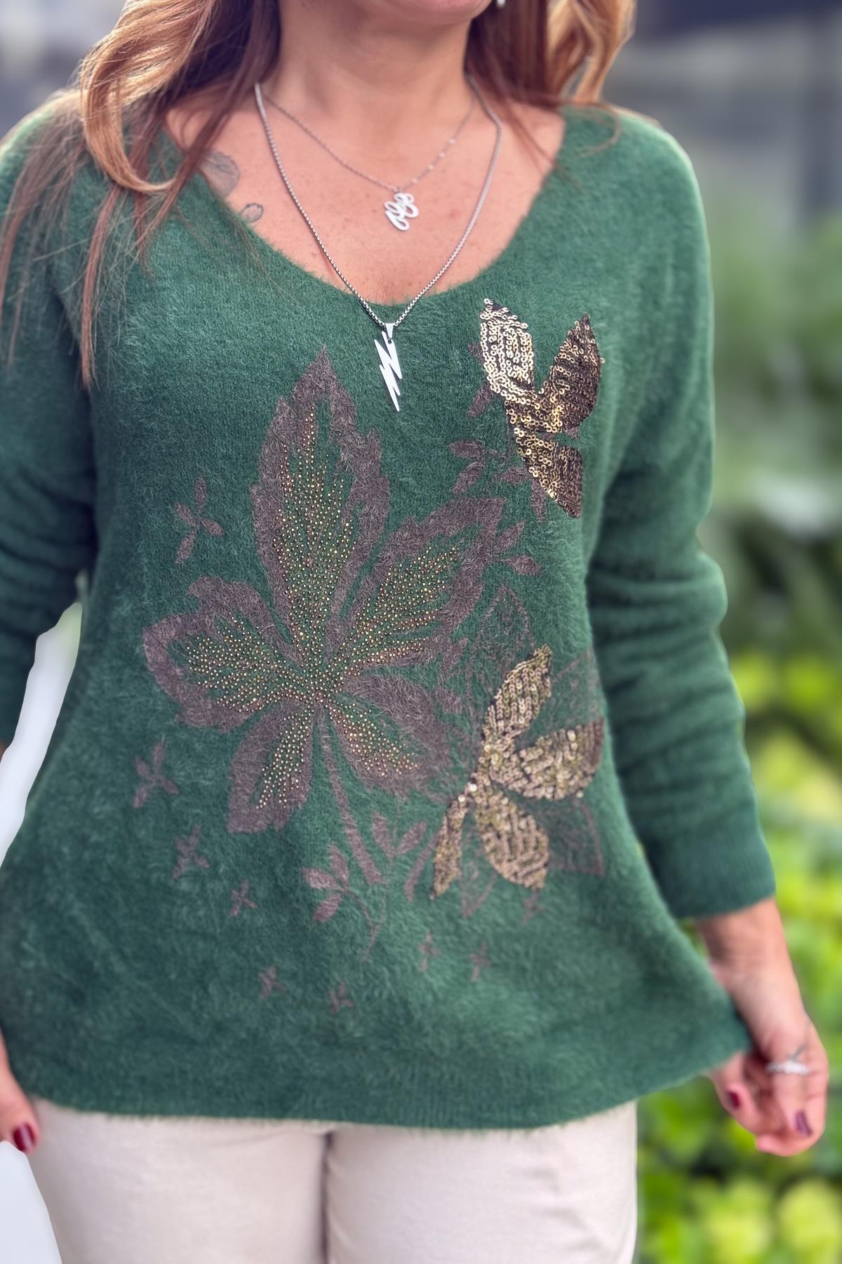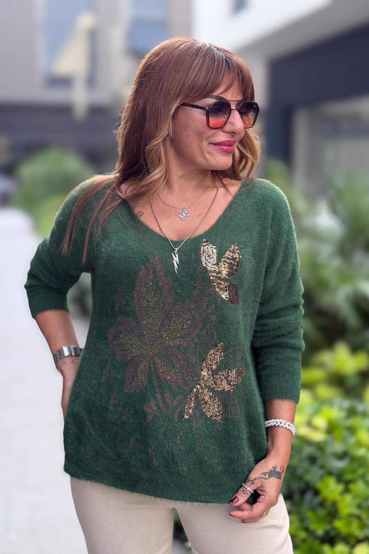Yaprak Desenli V Yaka Angora Kazak Nefti Yeşil Renk