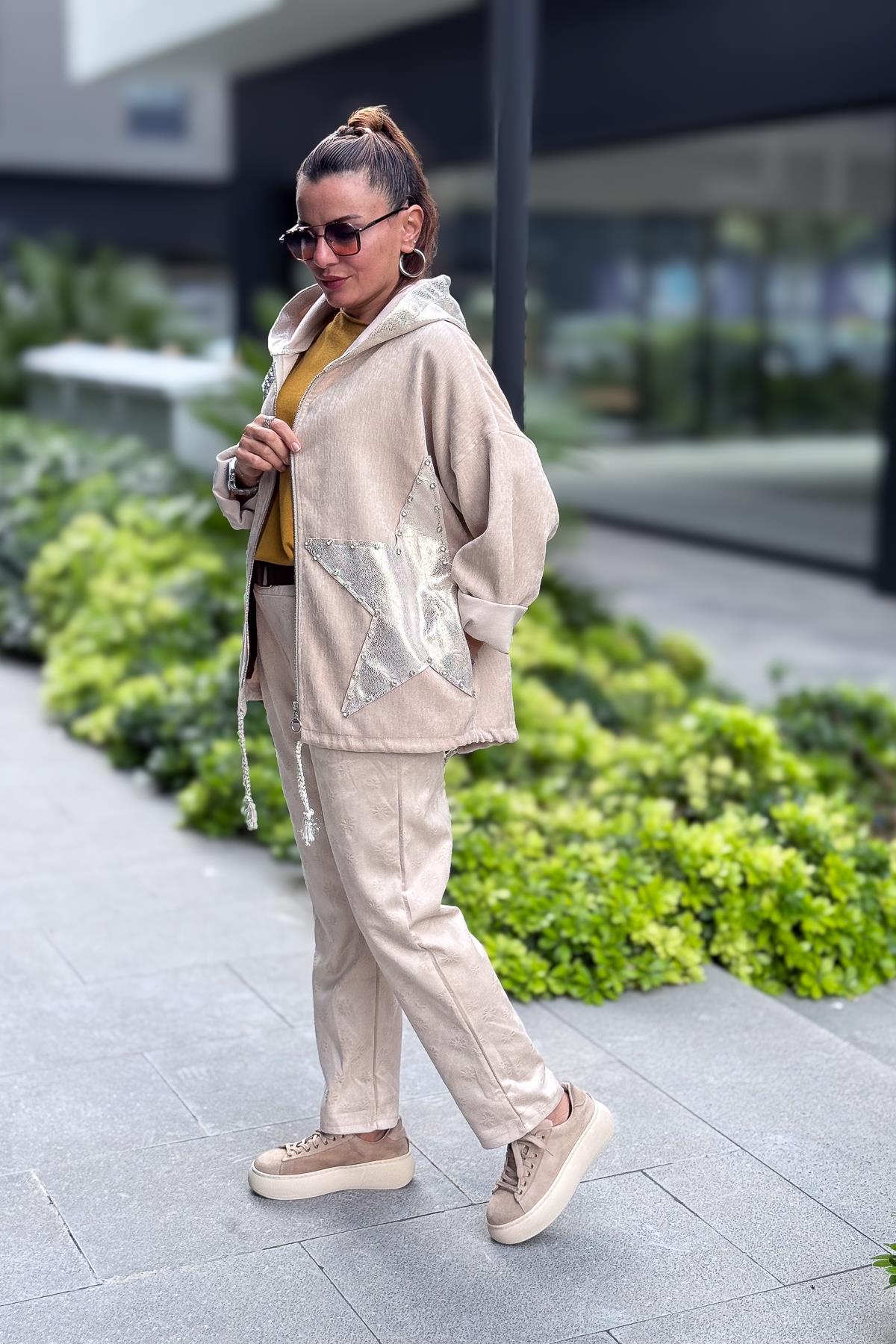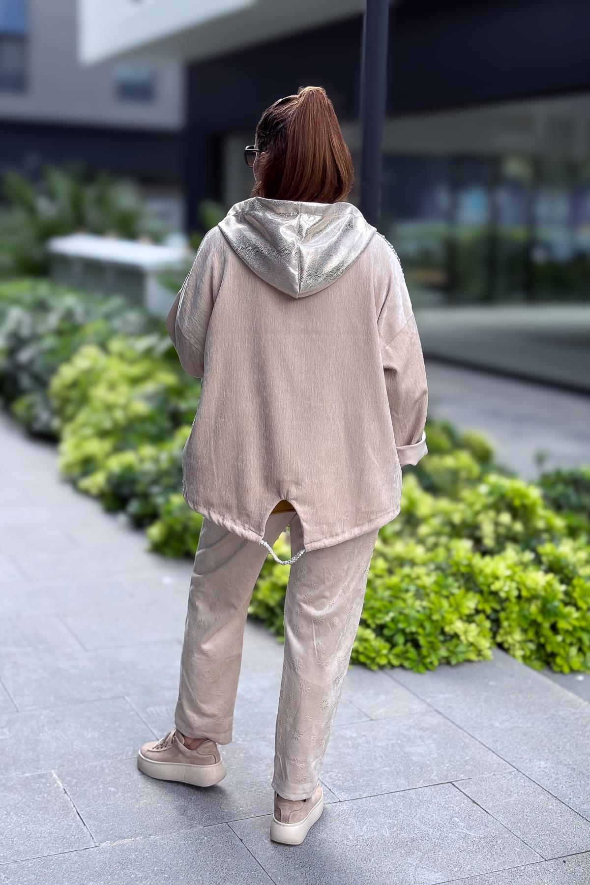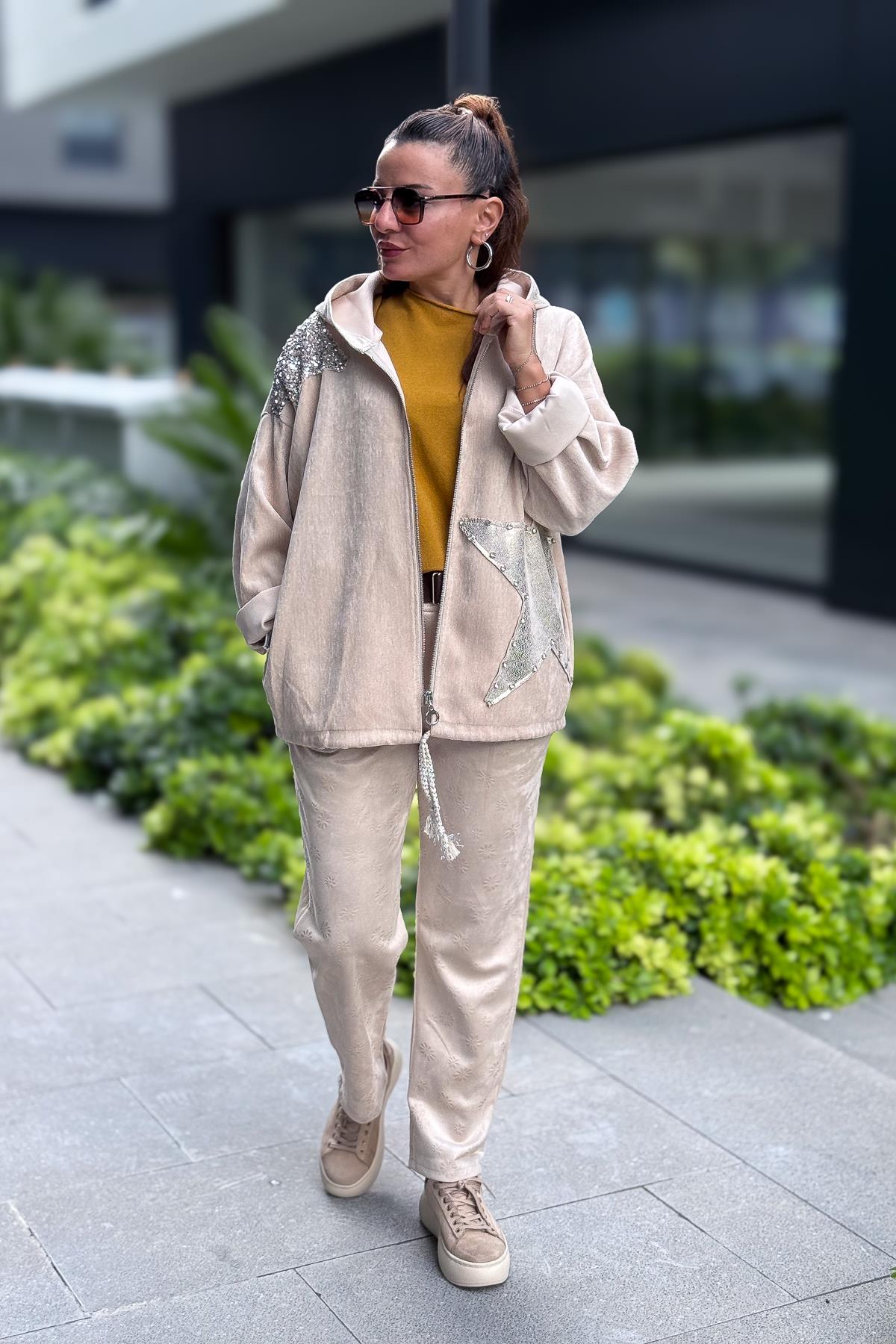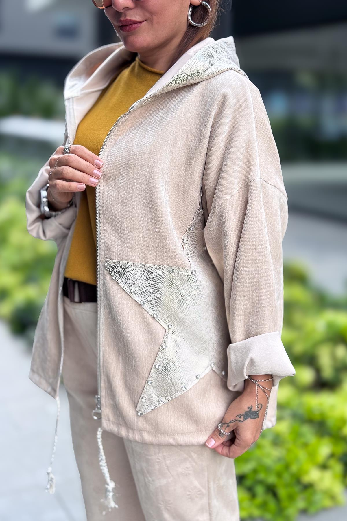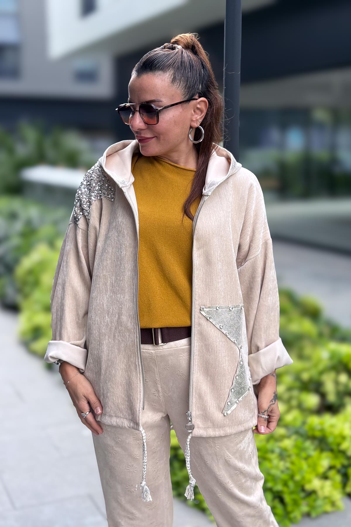 Yıldız Lak Pul İşlemeli Beli Büzgülü Kapüşonlu Kadife Ceket Bej Renk