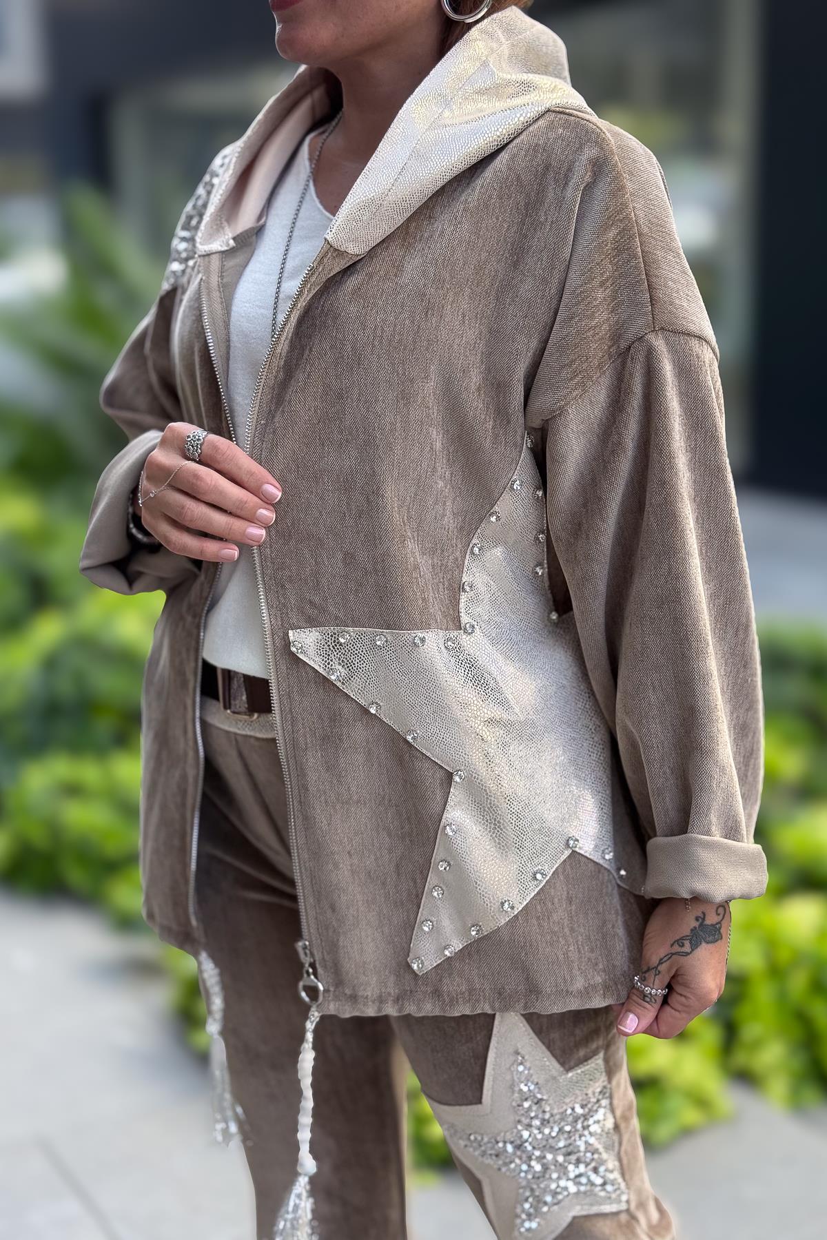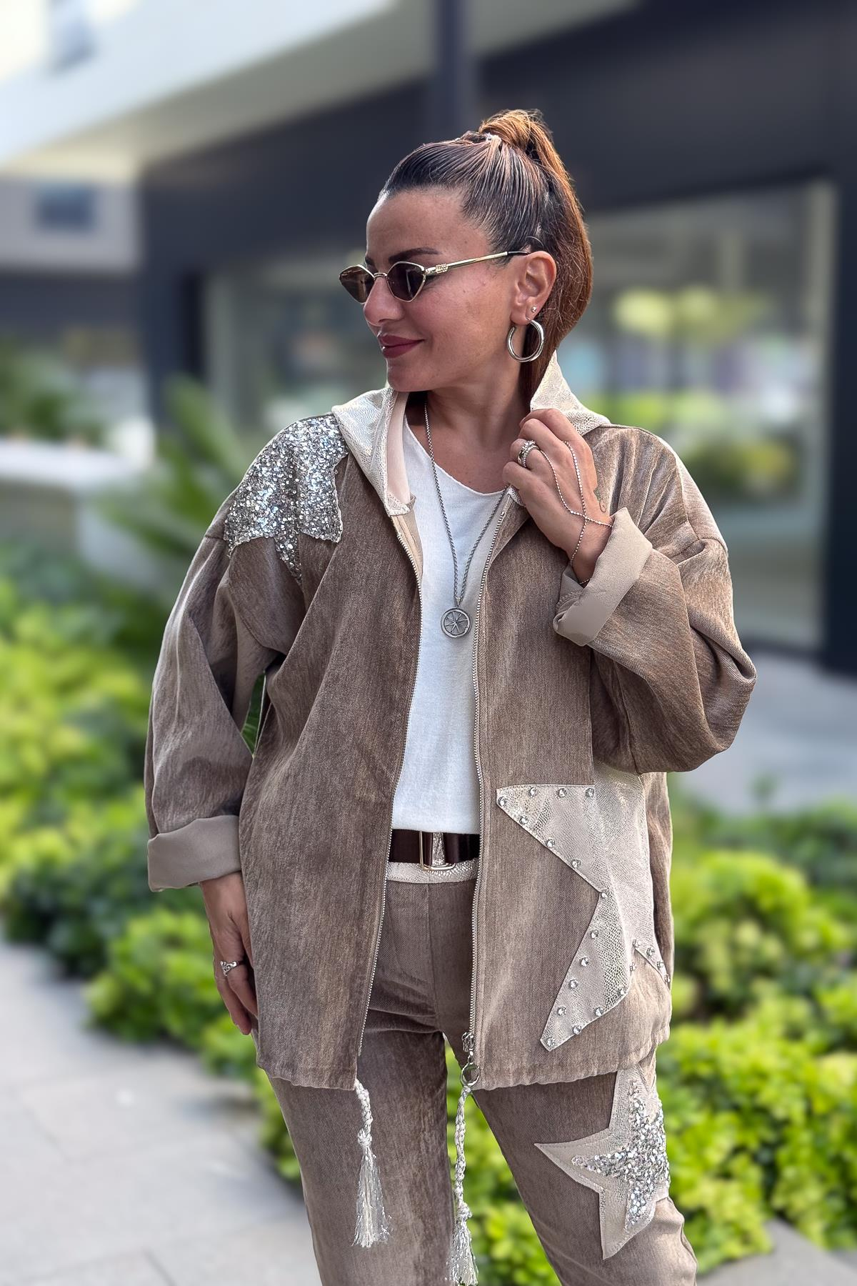 Yıldız Lak Pul İşlemeli Beli Büzgülü Kapüşonlu Kadife Ceket Camel Renk