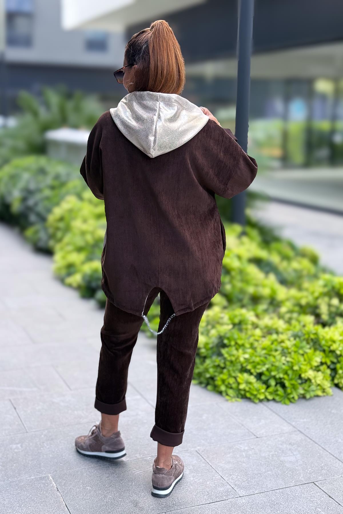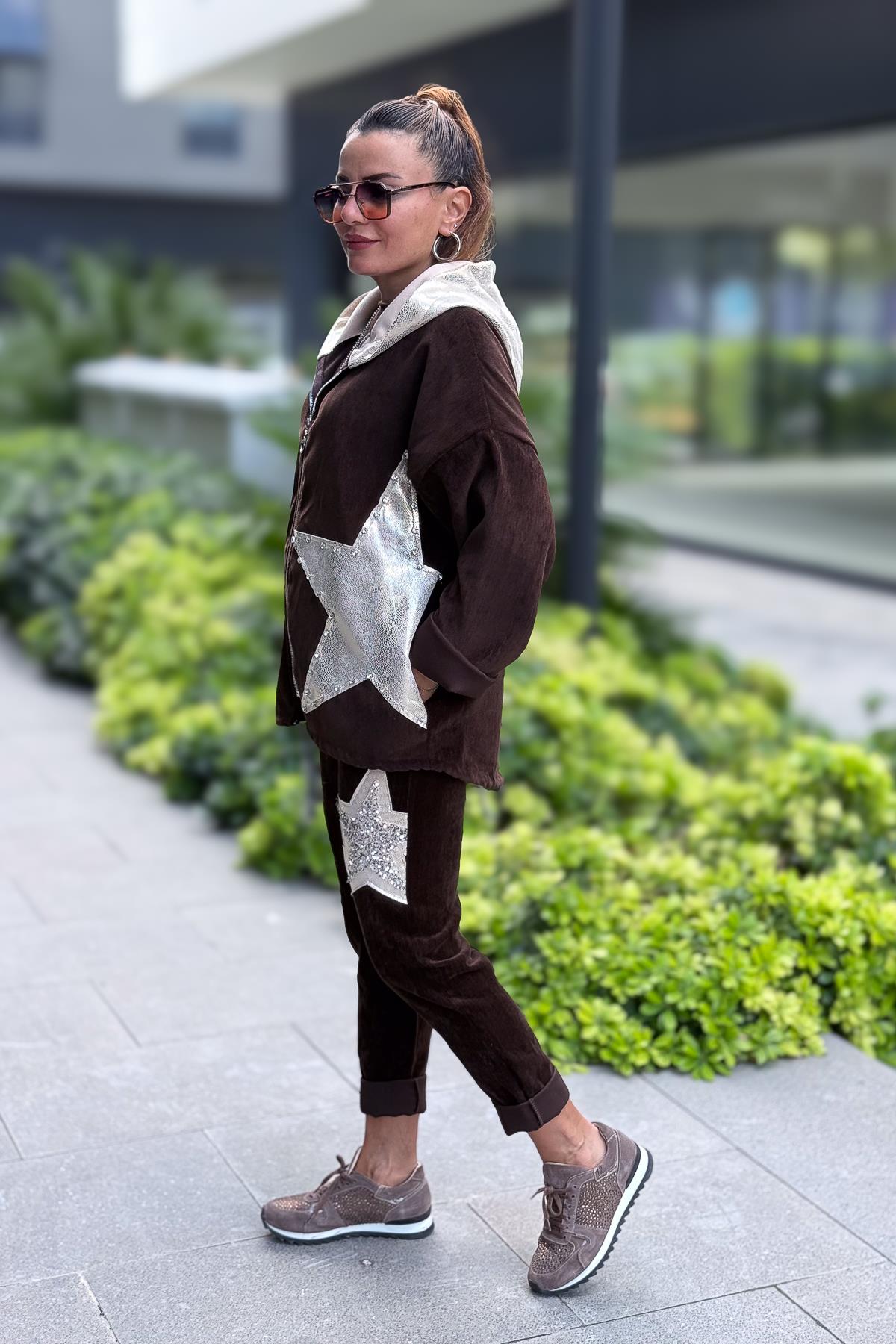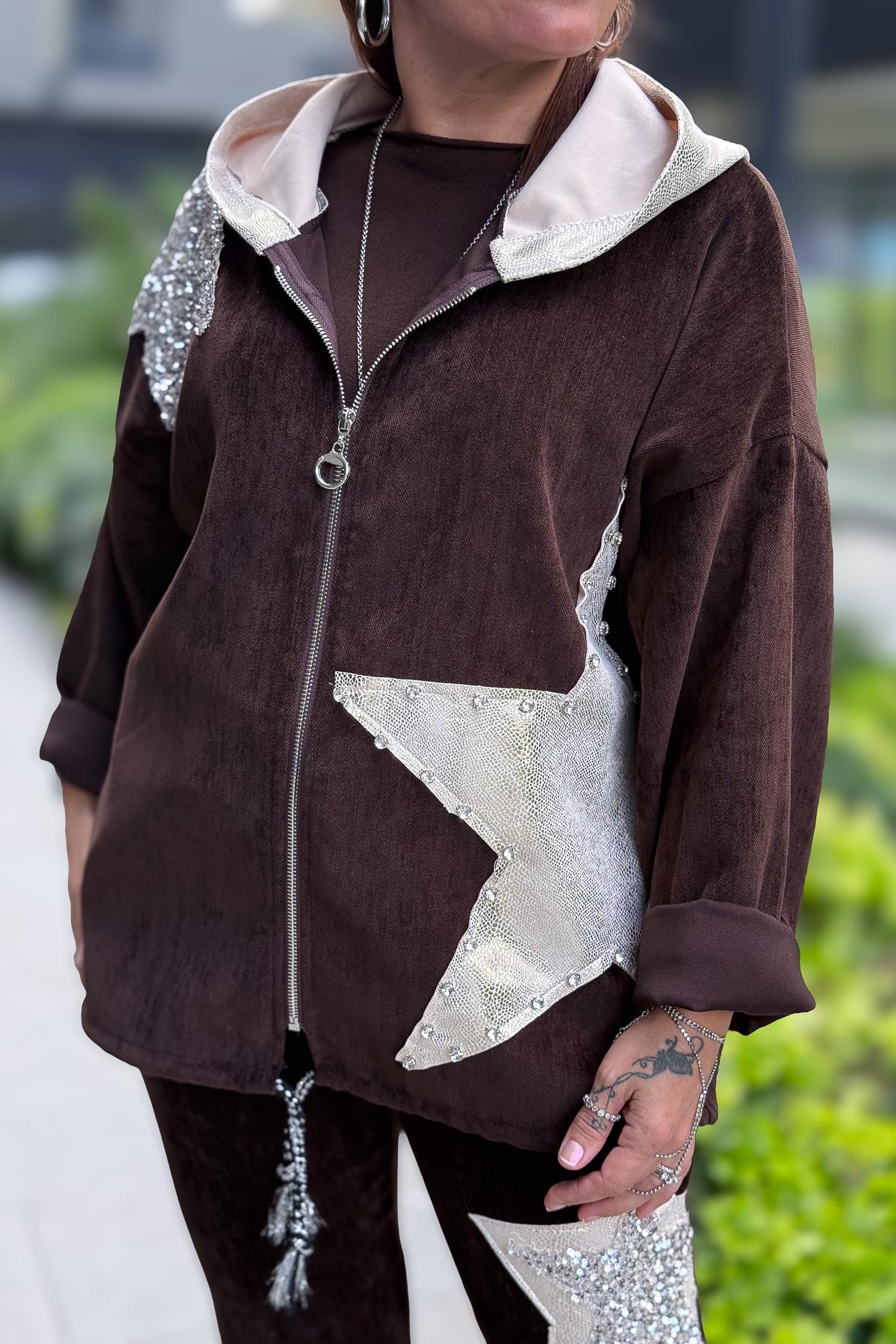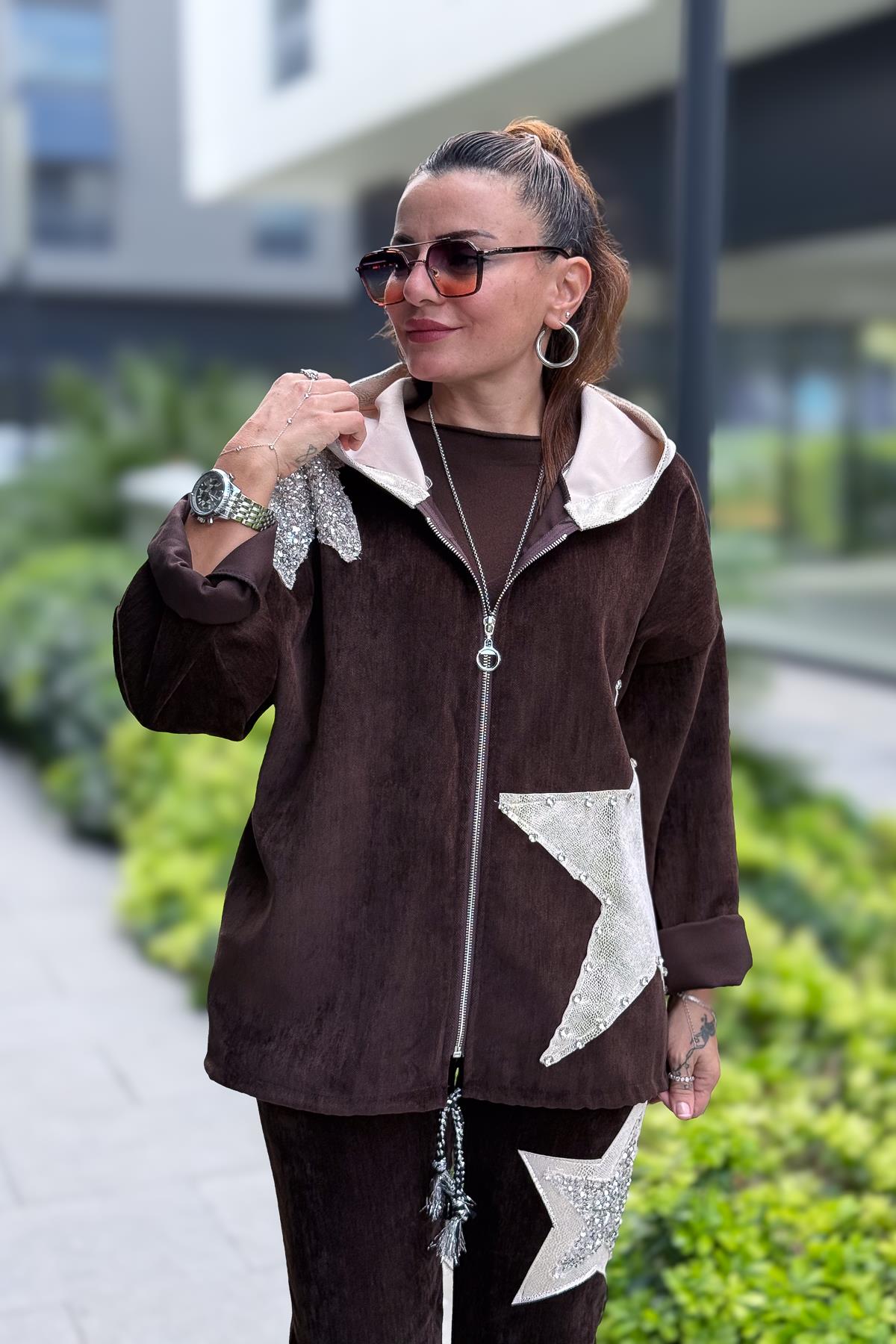 Yıldız Lak Pul İşlemeli Beli Büzgülü Kapüşonlu Kadife Ceket Kahverengi Renk