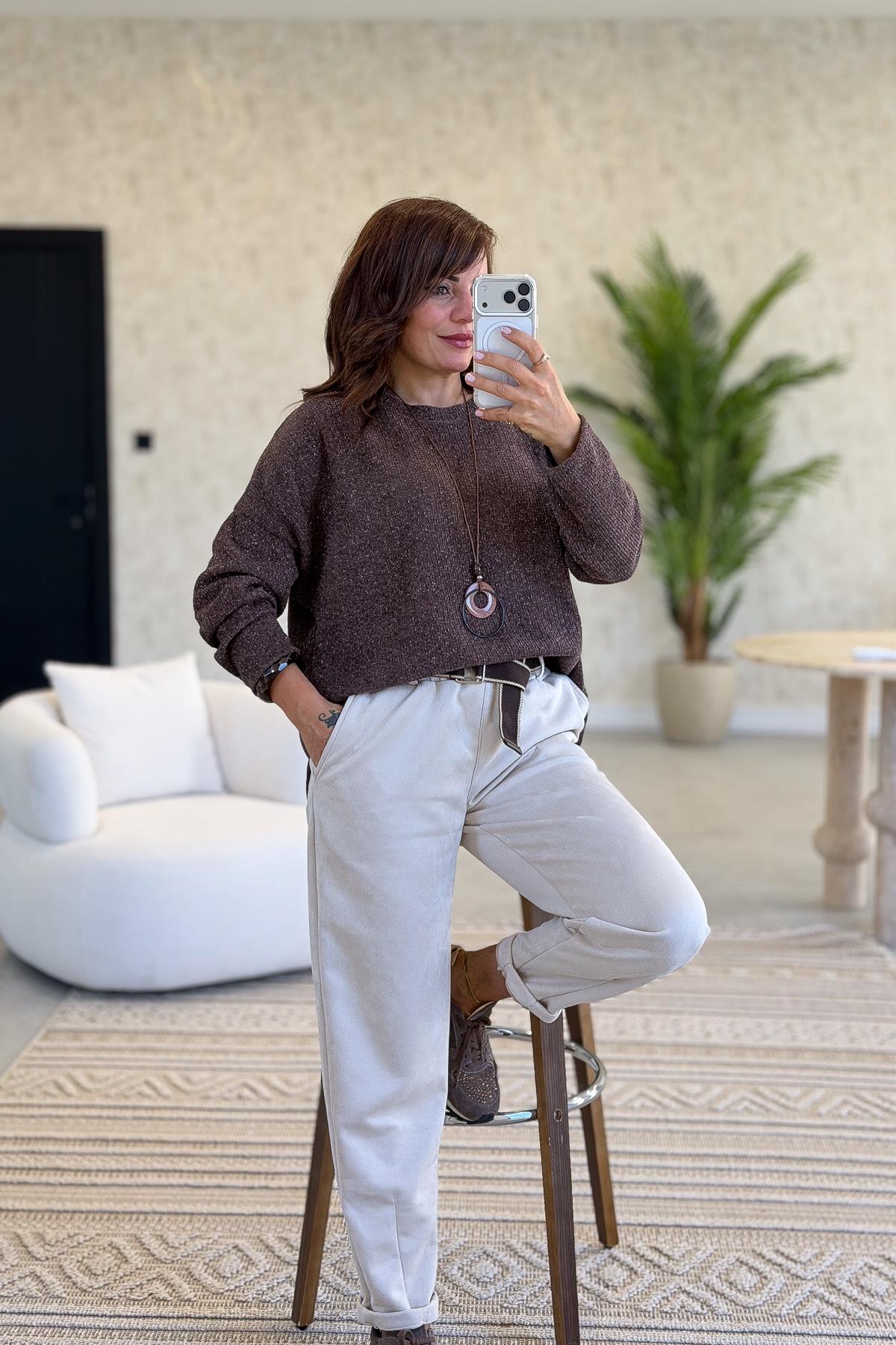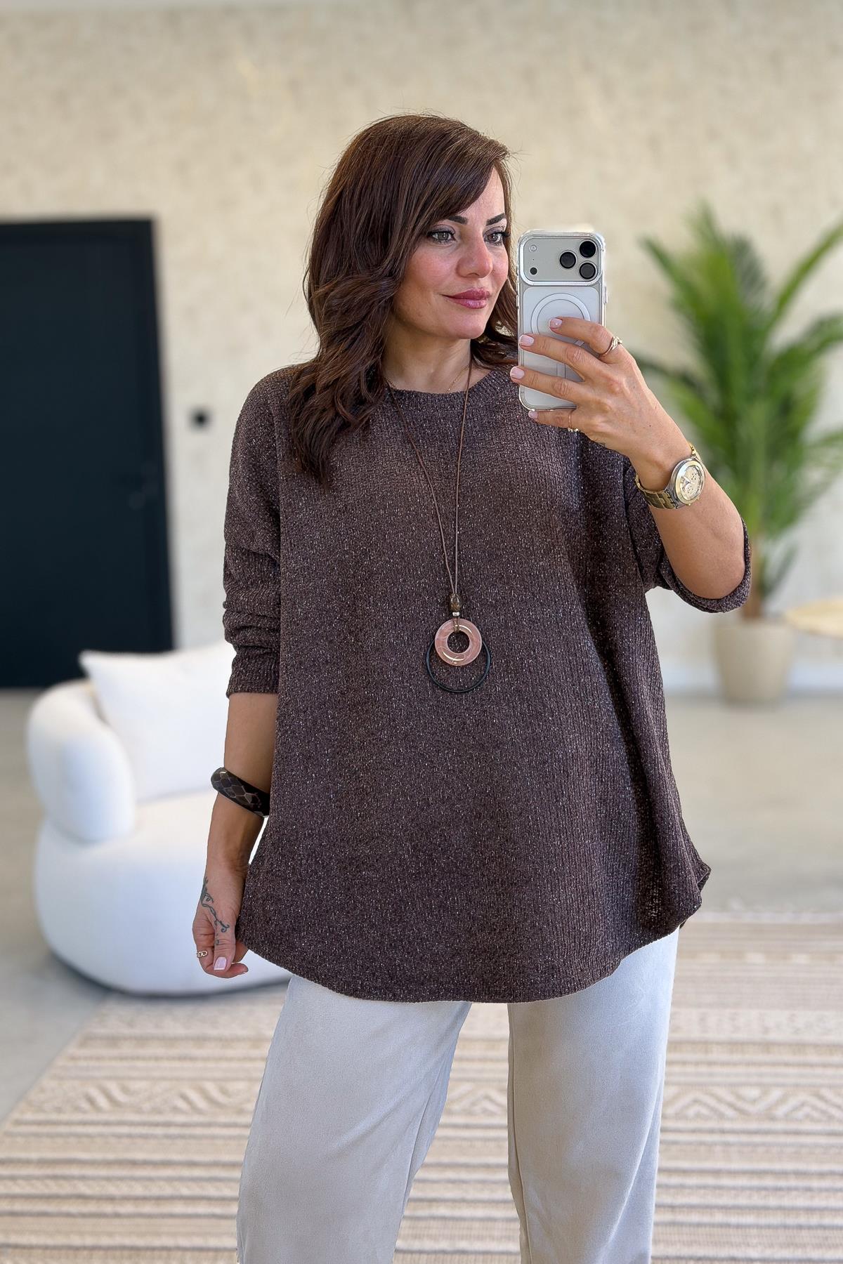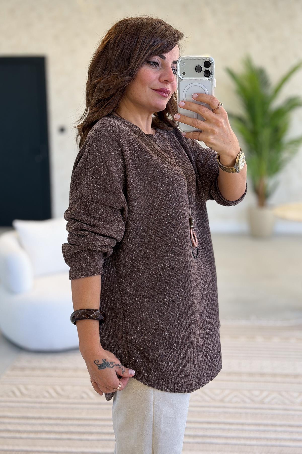 Yuvarlak Yaka Simli Kadife Bluz Acı Kahve Renk